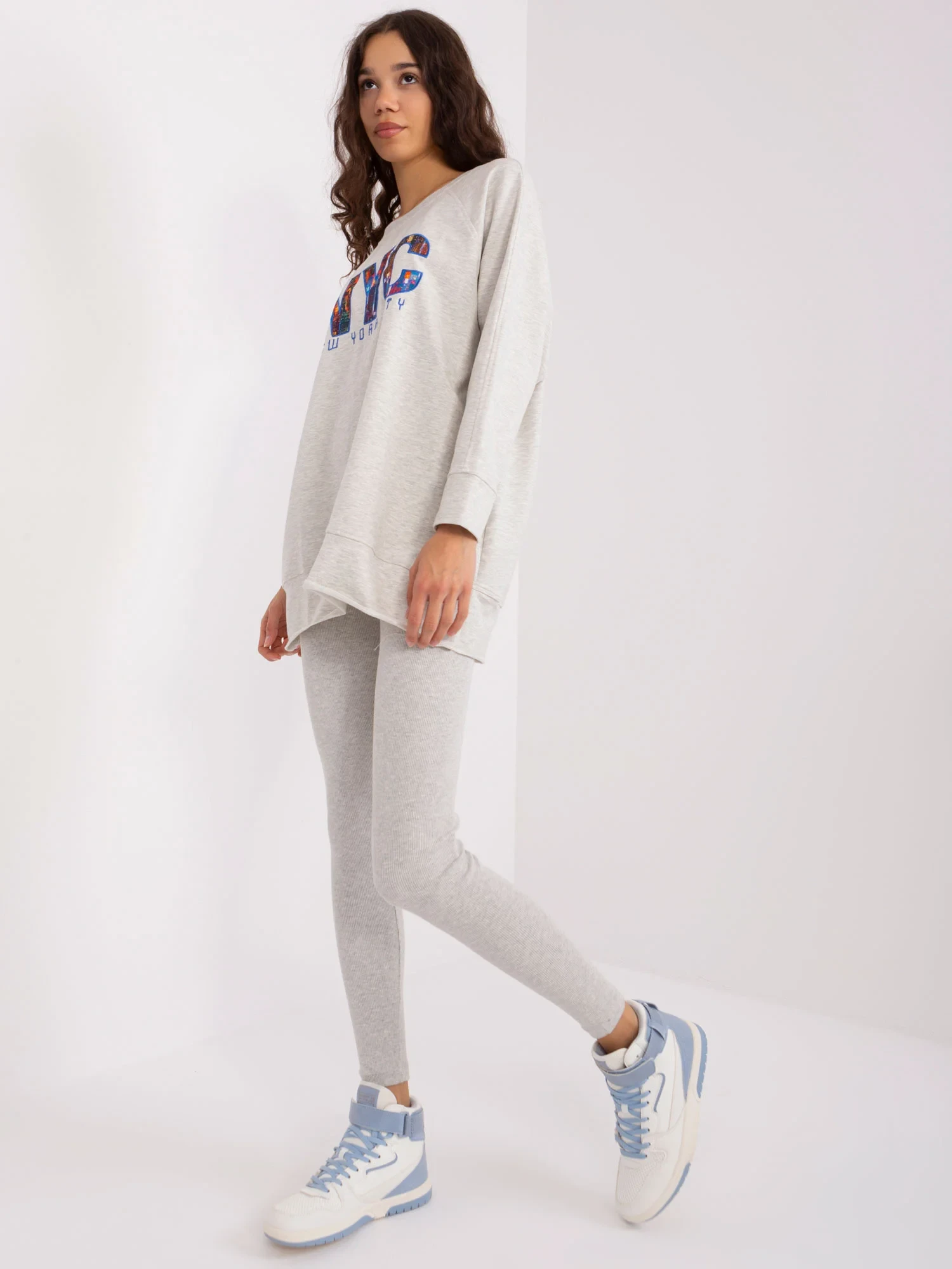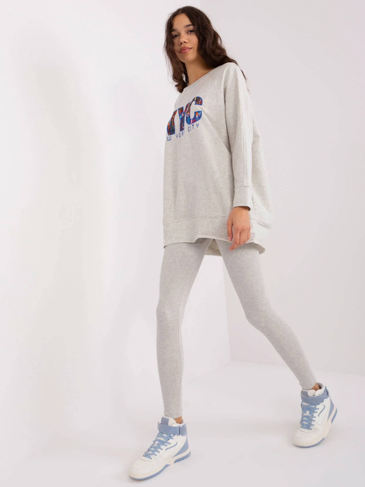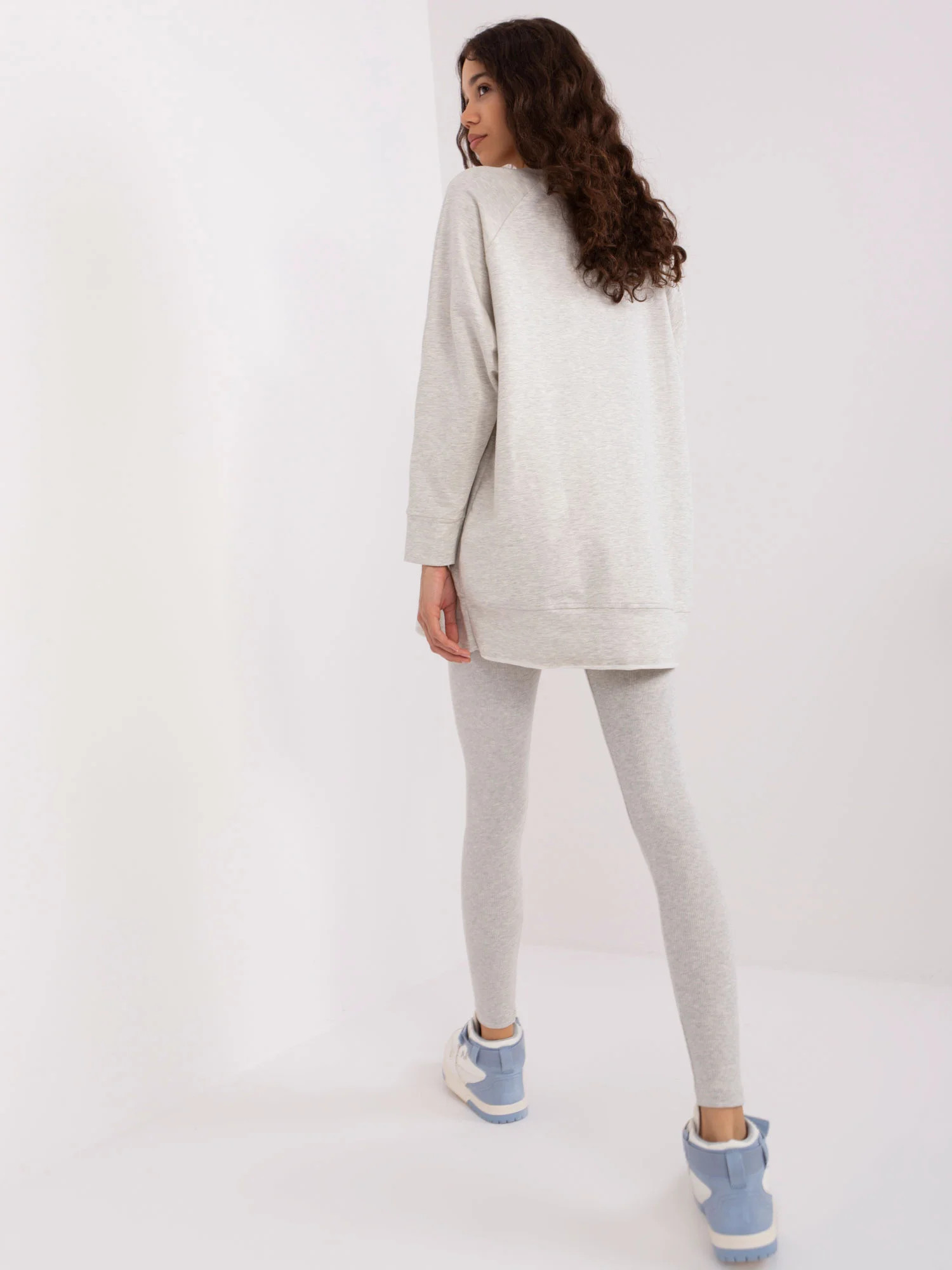 Wymiary kompletu w rozmiarze one size mierzone na płasko: szerokość bluzy pod pachami - 68 cm długość rękawa - 58 cm, długość bluzy - 80 cm, szerokość legginsów w pasie - 32 cm, wysokość stanu - 28 cm, długość legginsów - 98 cm.