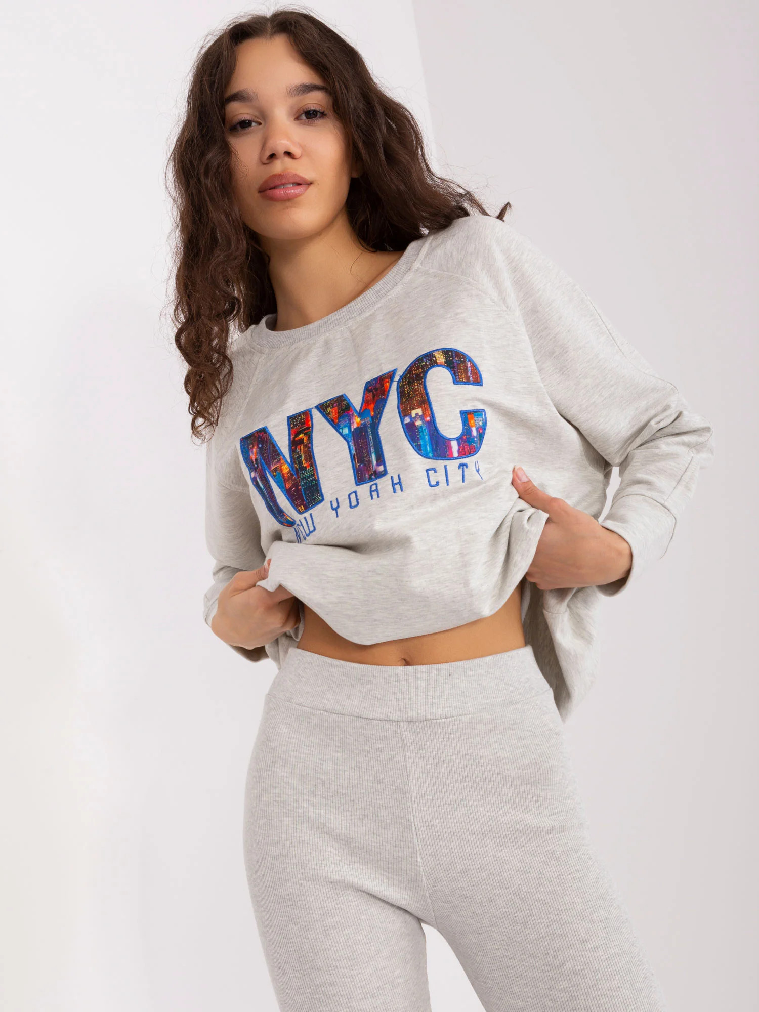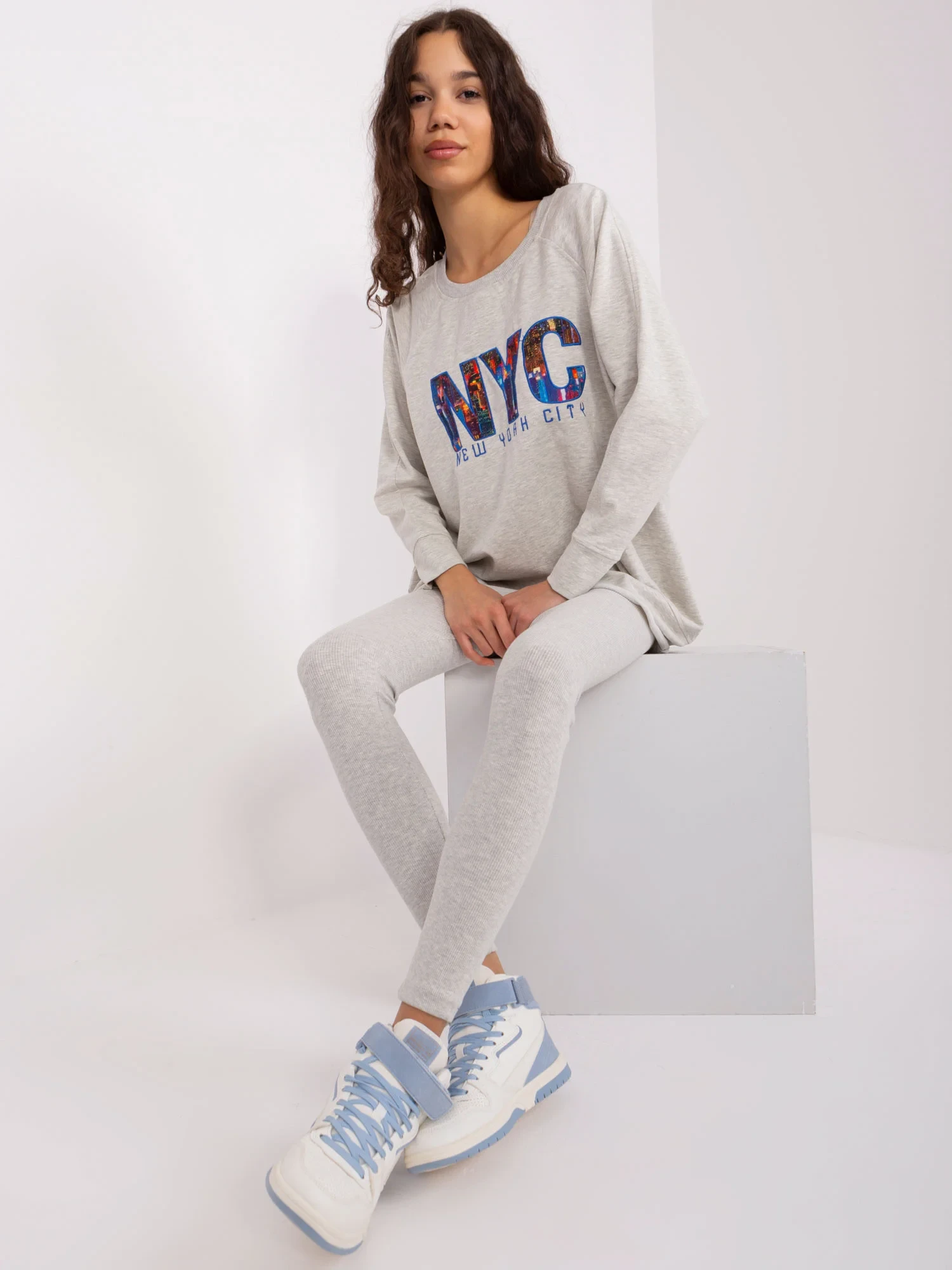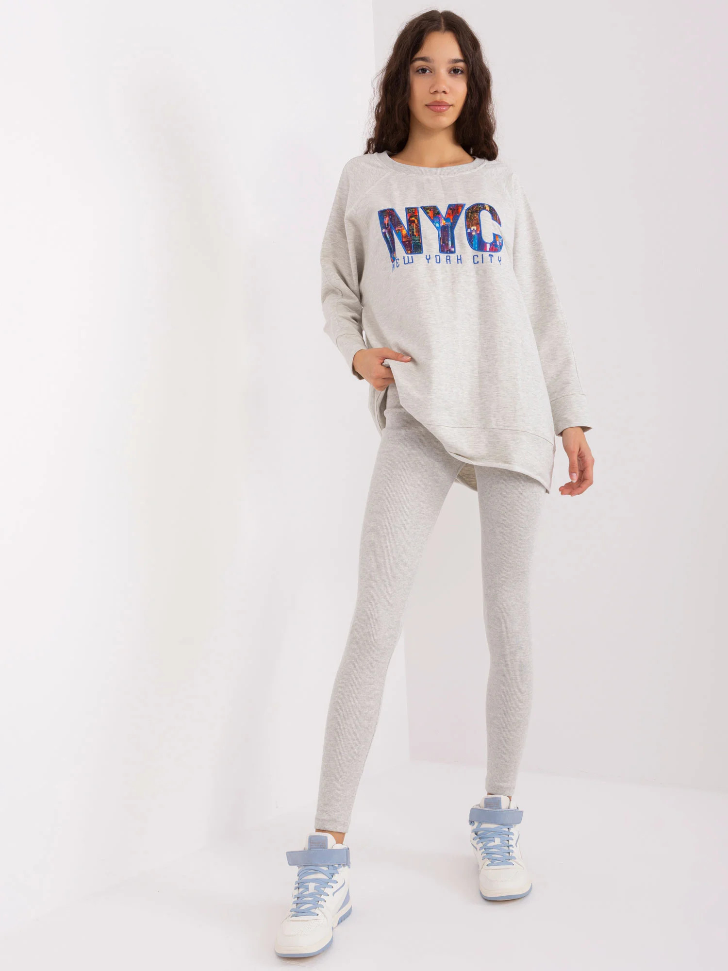 Wymiary kompletu w rozmiarze one size mierzone na płasko: szerokość bluzy pod pachami - 68 cm długość rękawa - 58 cm, długość bluzy - 80 cm, szerokość legginsów w pasie - 32 cm, wysokość stanu - 28 cm, długość legginsów - 98 cm.