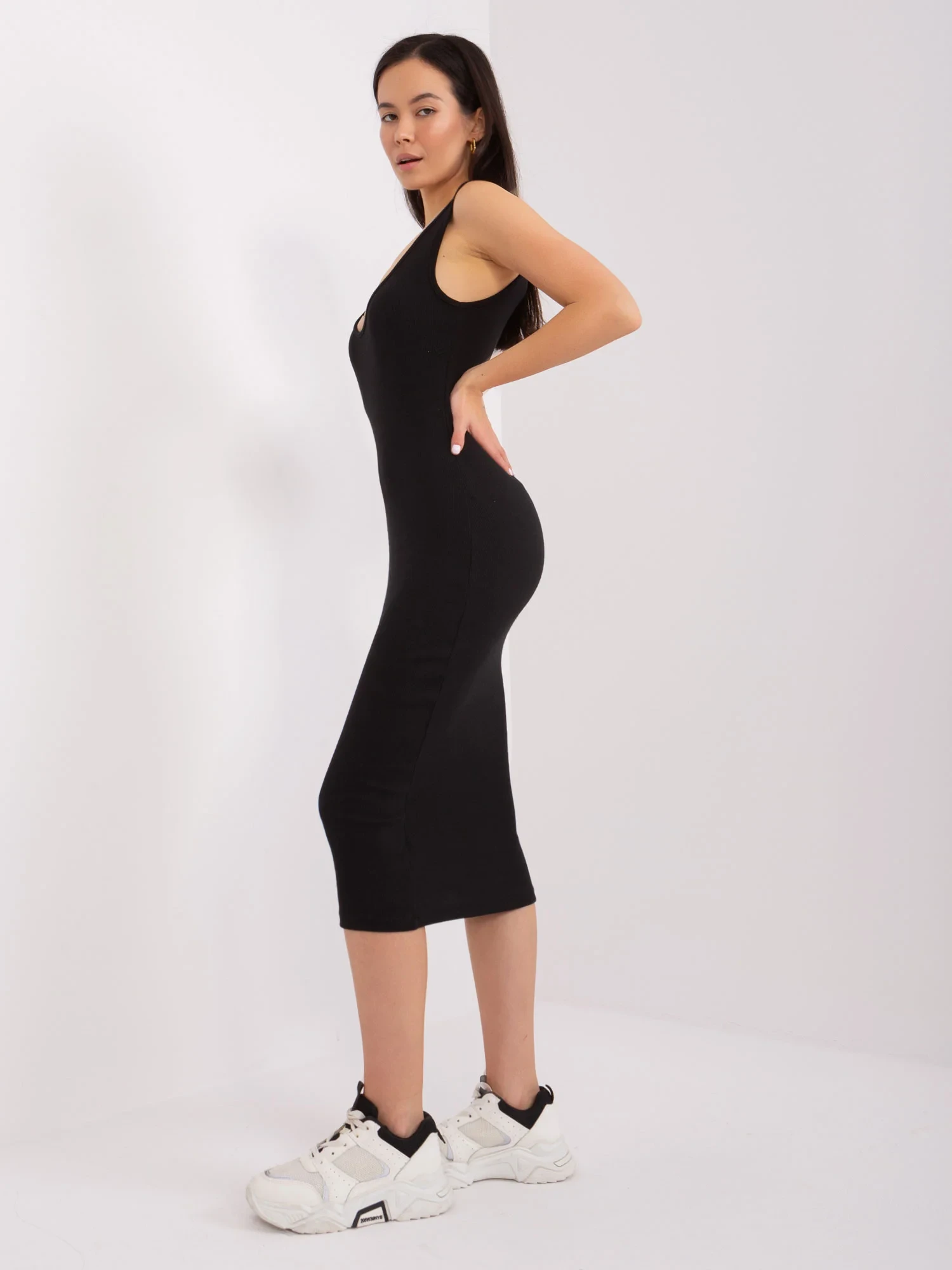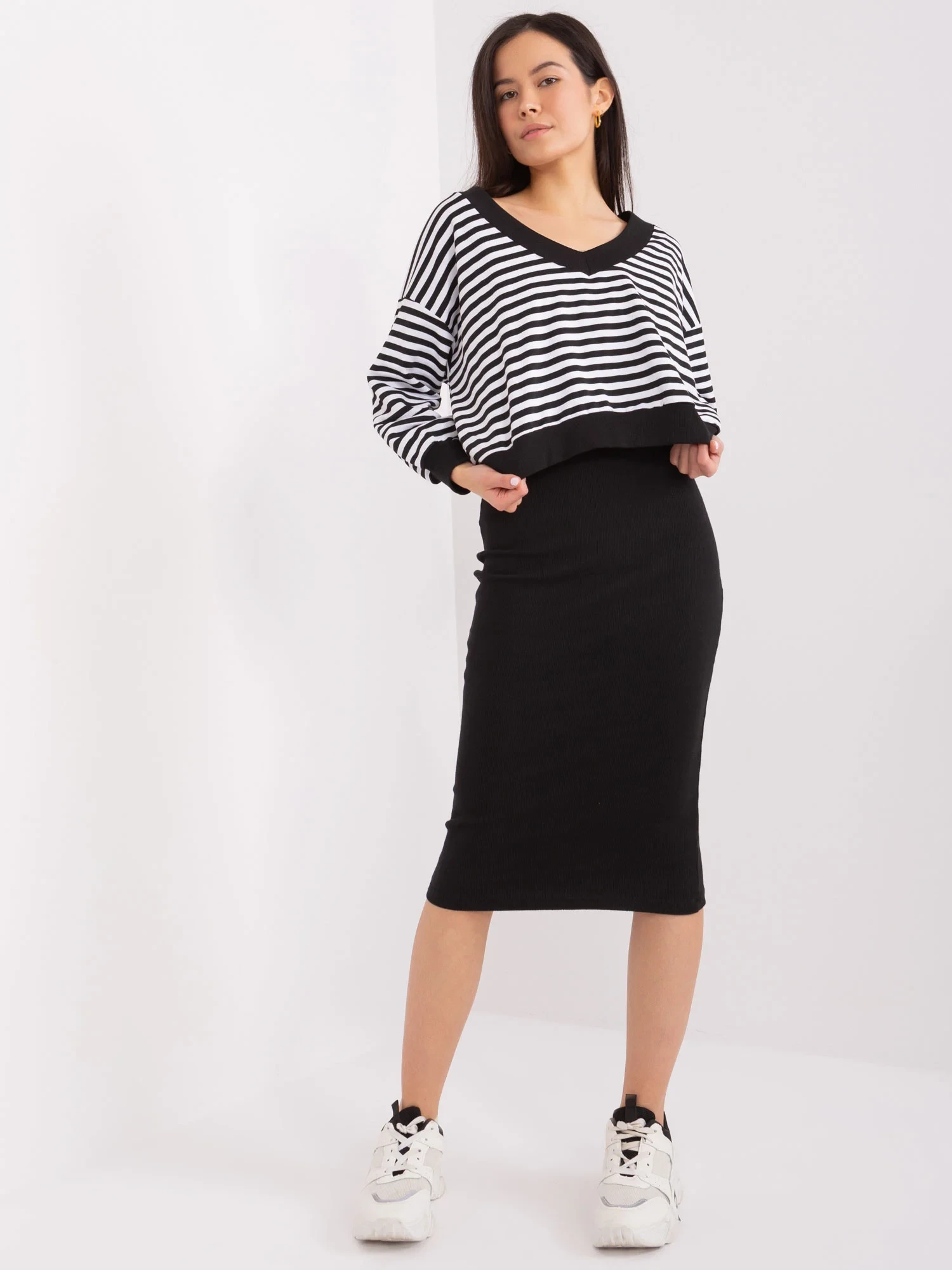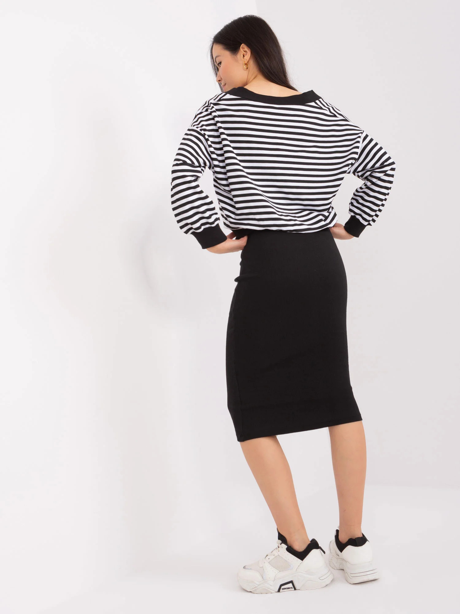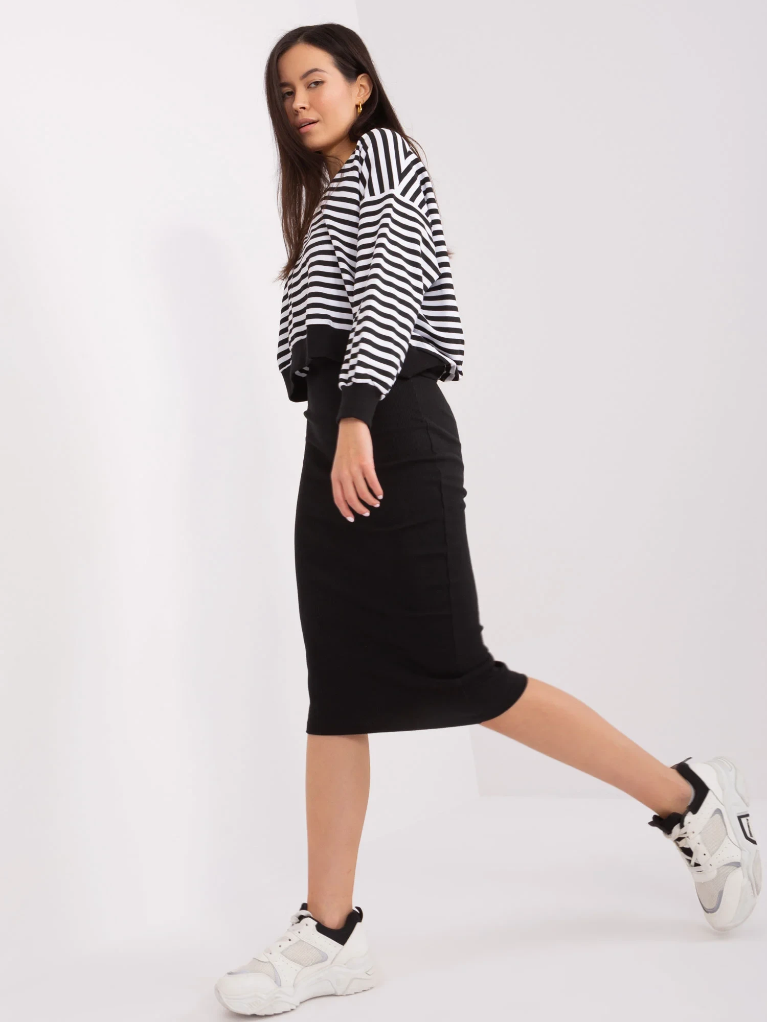 Modelka ma na sobie rozmiar S. Wymiary modelki: wzrost 168 cm, biust 81 cm, talia 62 cm, biodra 90 cm.