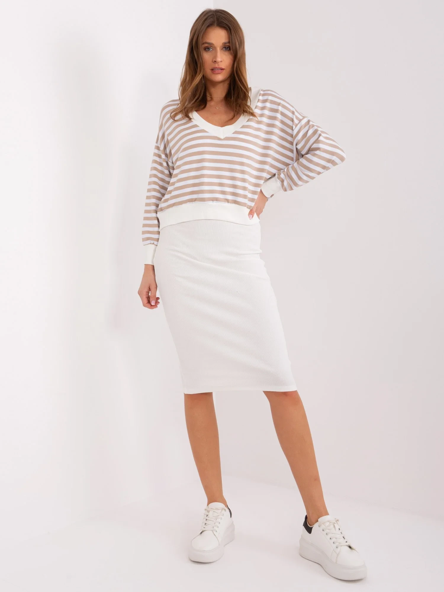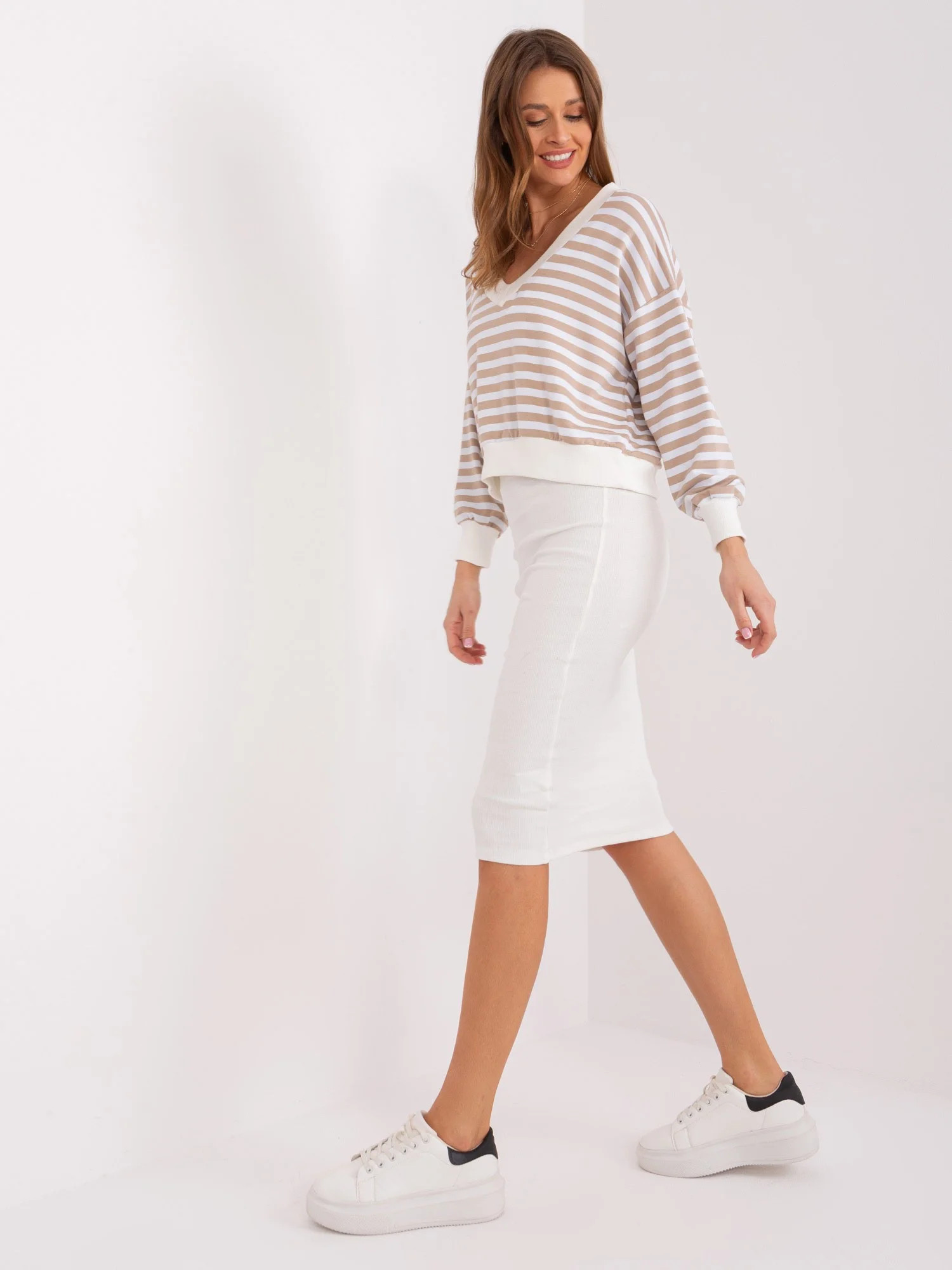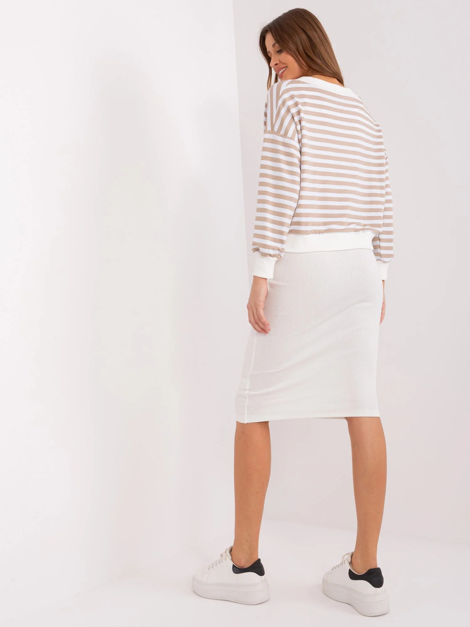 Modelka ma na sobie rozmiar S. Wymiary modelki: wzrost 176 cm, biust 85 cm, talia 64 cm, biodra 92 cm.