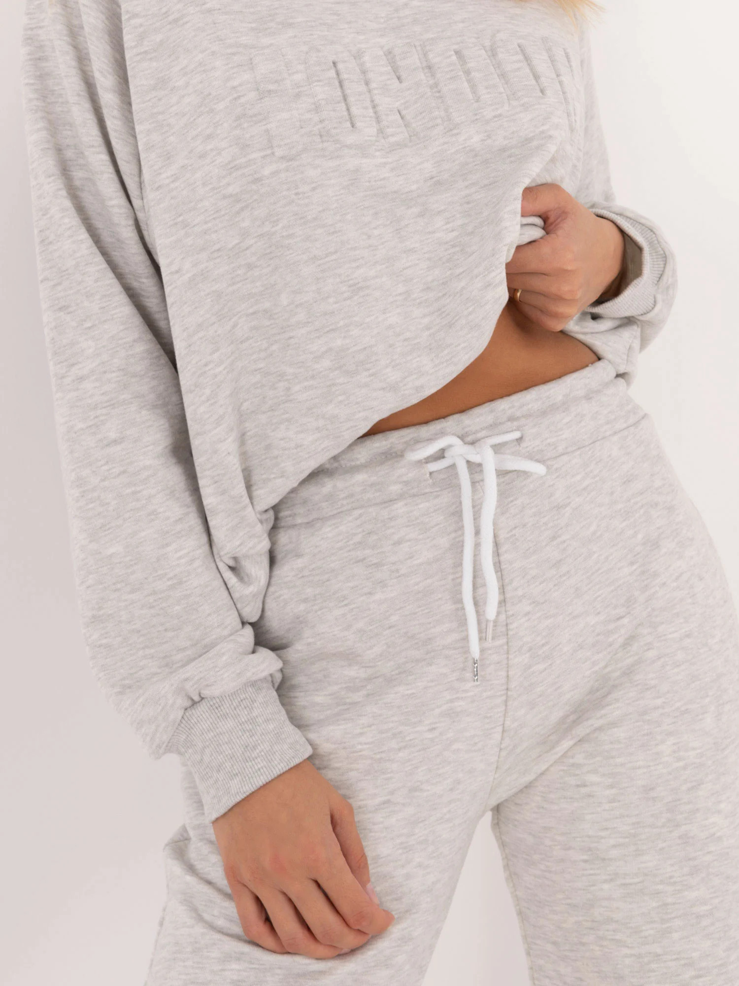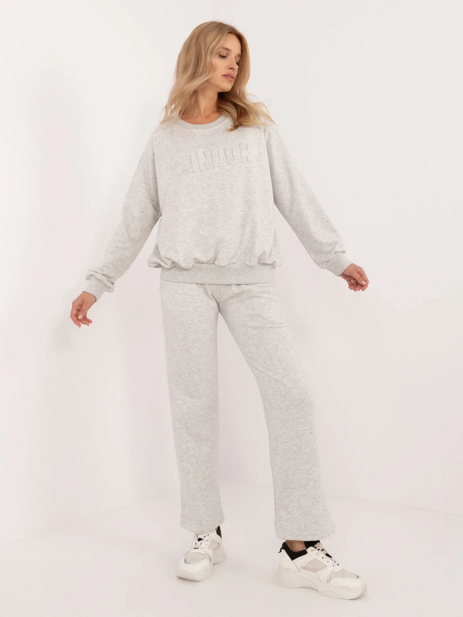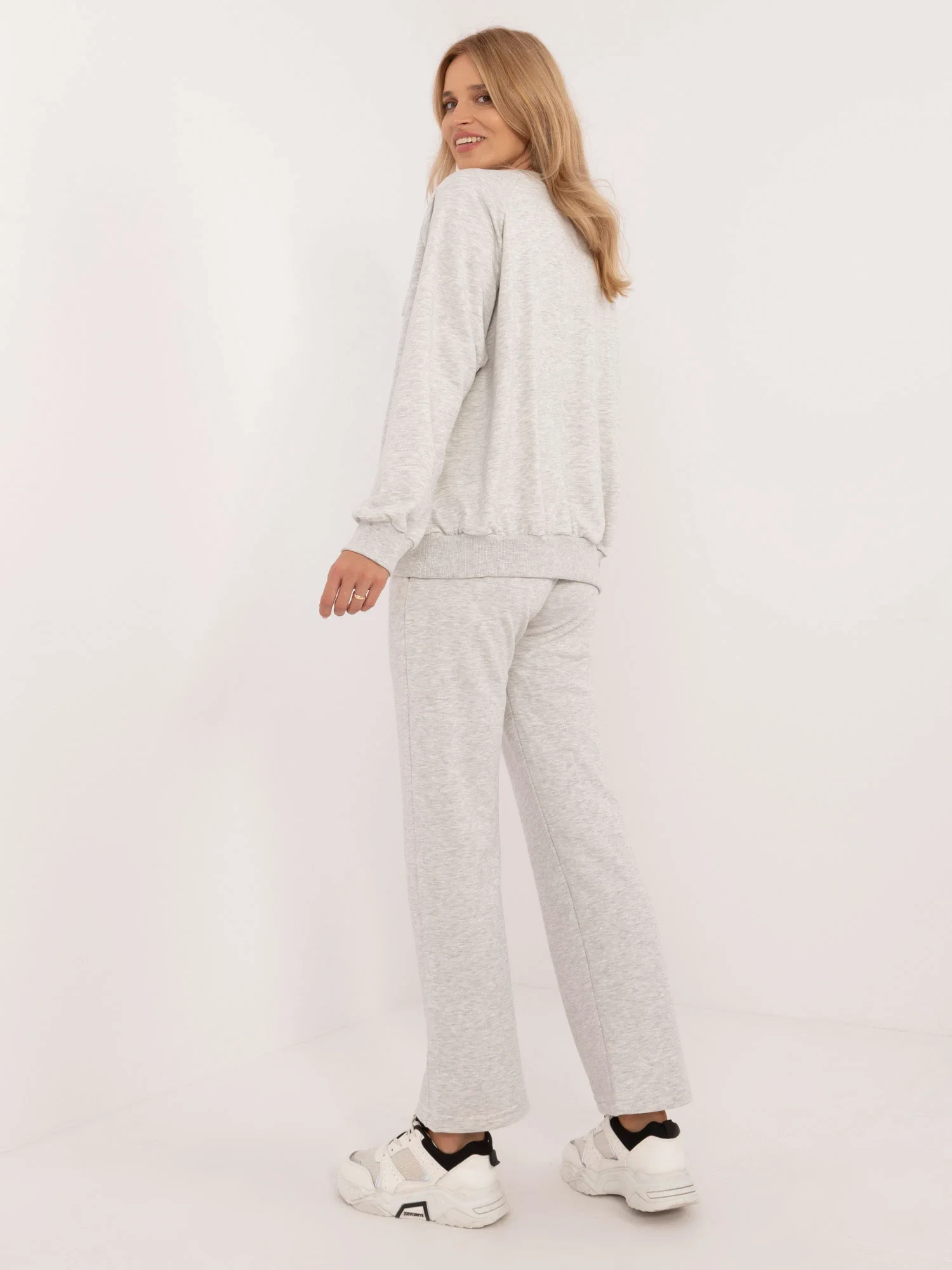 Wymiary kompletu w rozmiarze one size mierzone na płasko: szerokość bluzy pod pachami - 68 cm, długość bluzy - 67 cm, długość rękawa - 64 cm, szerokość spodni w pasie - 33 cm, wysokość stanu - 34 cm, długość spodni - 105 cm.