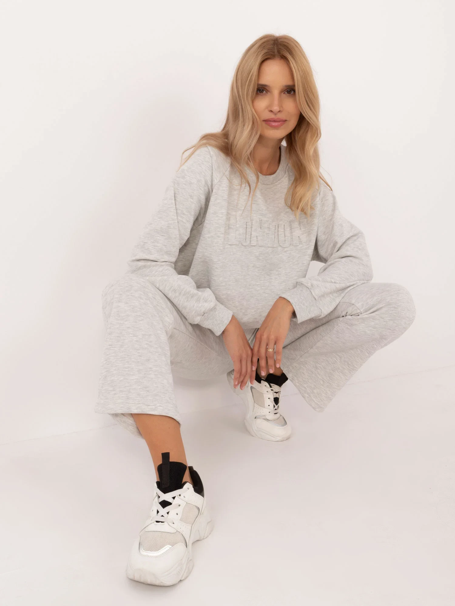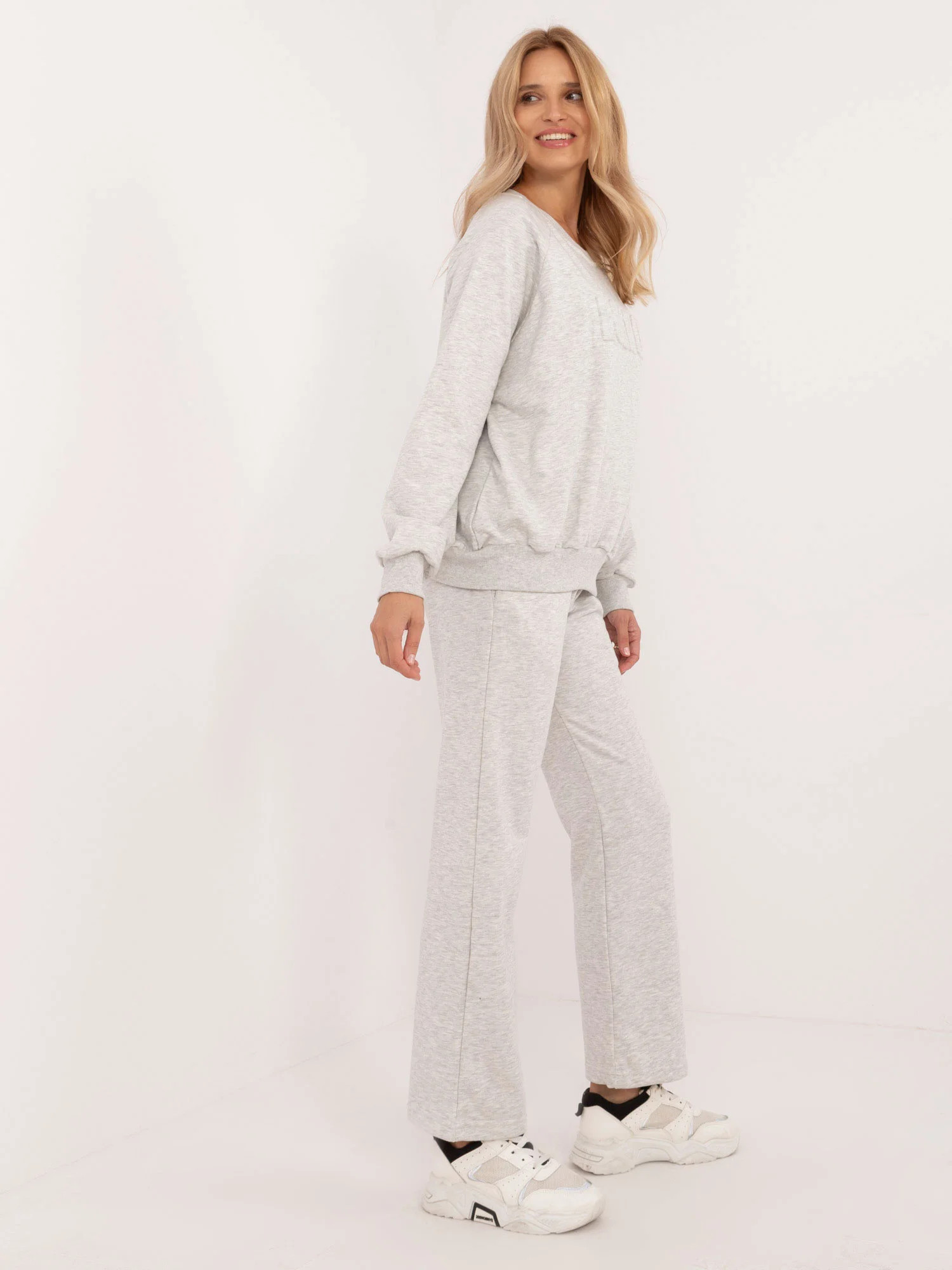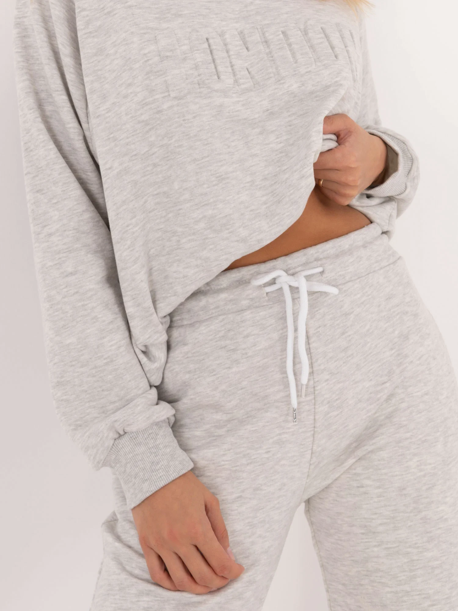 Wymiary kompletu w rozmiarze one size mierzone na płasko: szerokość bluzy pod pachami - 68 cm, długość bluzy - 67 cm, długość rękawa - 64 cm, szerokość spodni w pasie - 33 cm, wysokość stanu - 34 cm, długość spodni - 105 cm.
