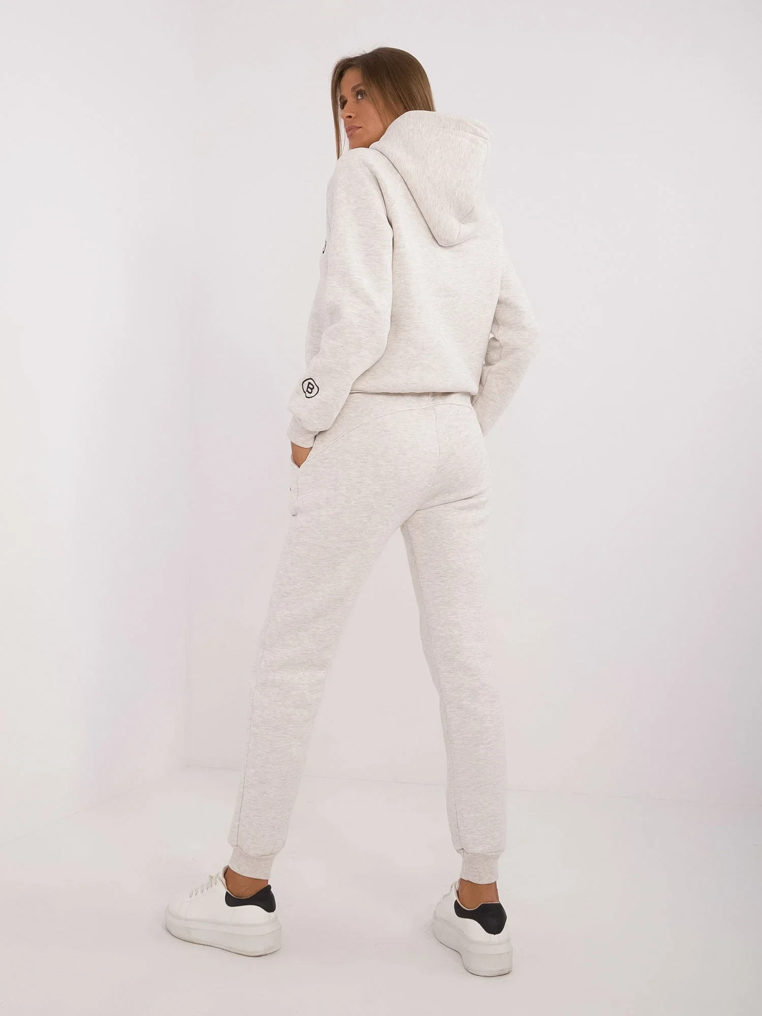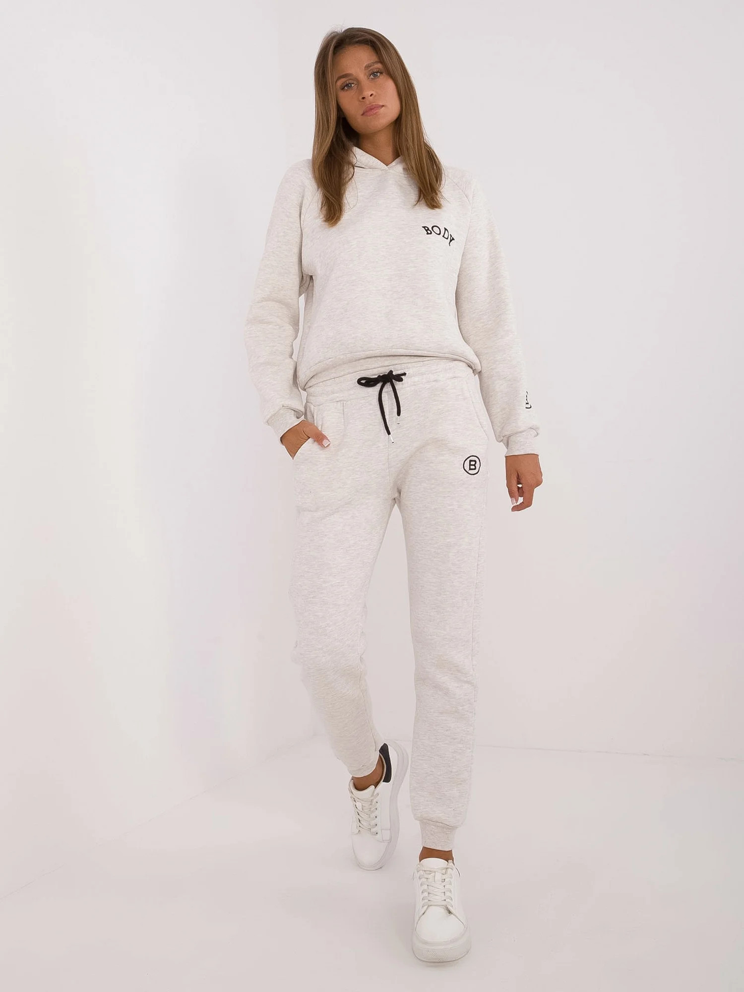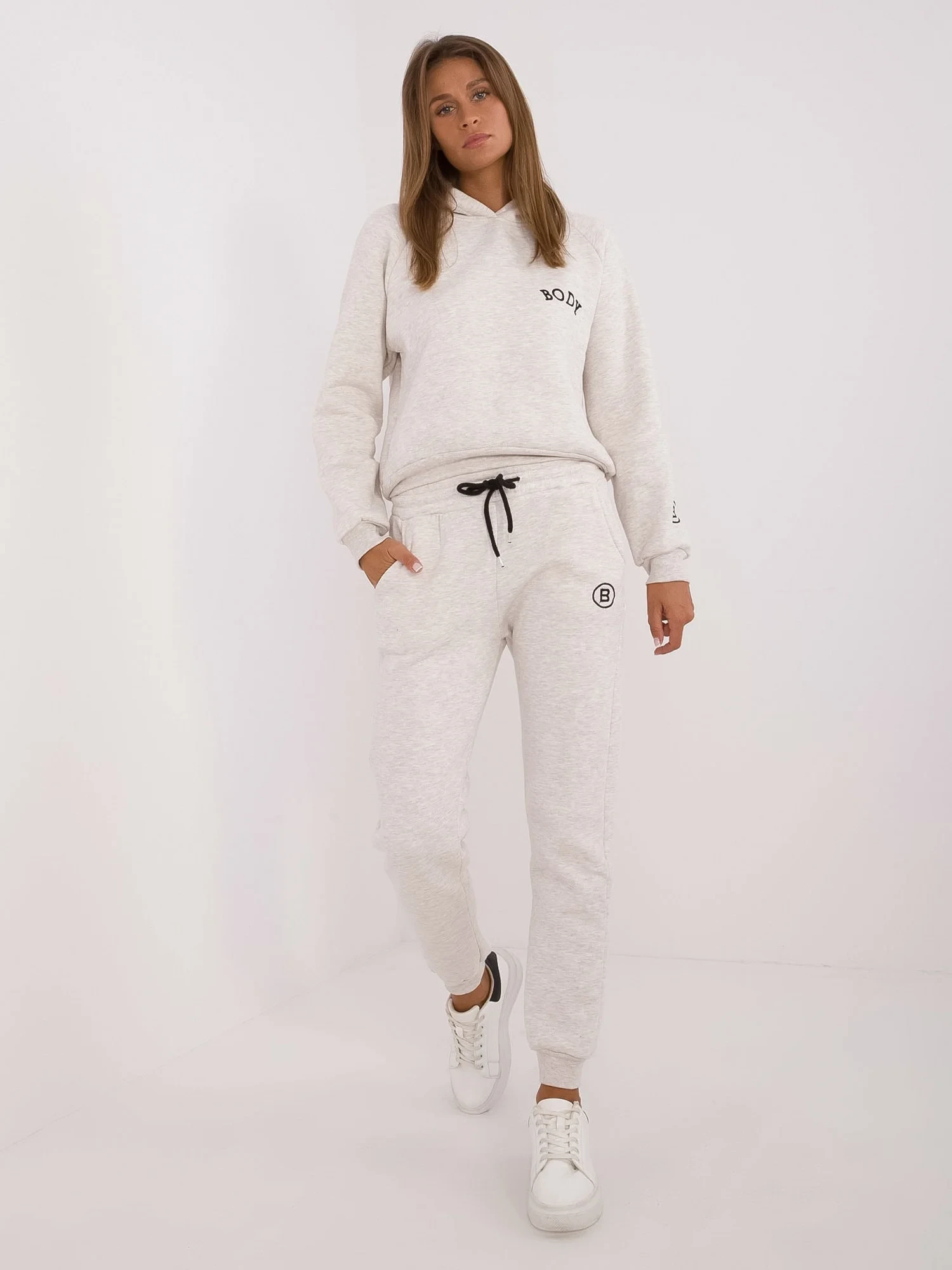 Wymiary kompletu w rozmiarze one size mierzone na płasko: szerokość bluzy pod pachami - 54 cm, długość bluzy - 55 cm, długość rękawa - 60 cm, szerokość spodni w pasie - 35 cm, wysokość stanu - 29 cm, długość spodni - 99 cm.