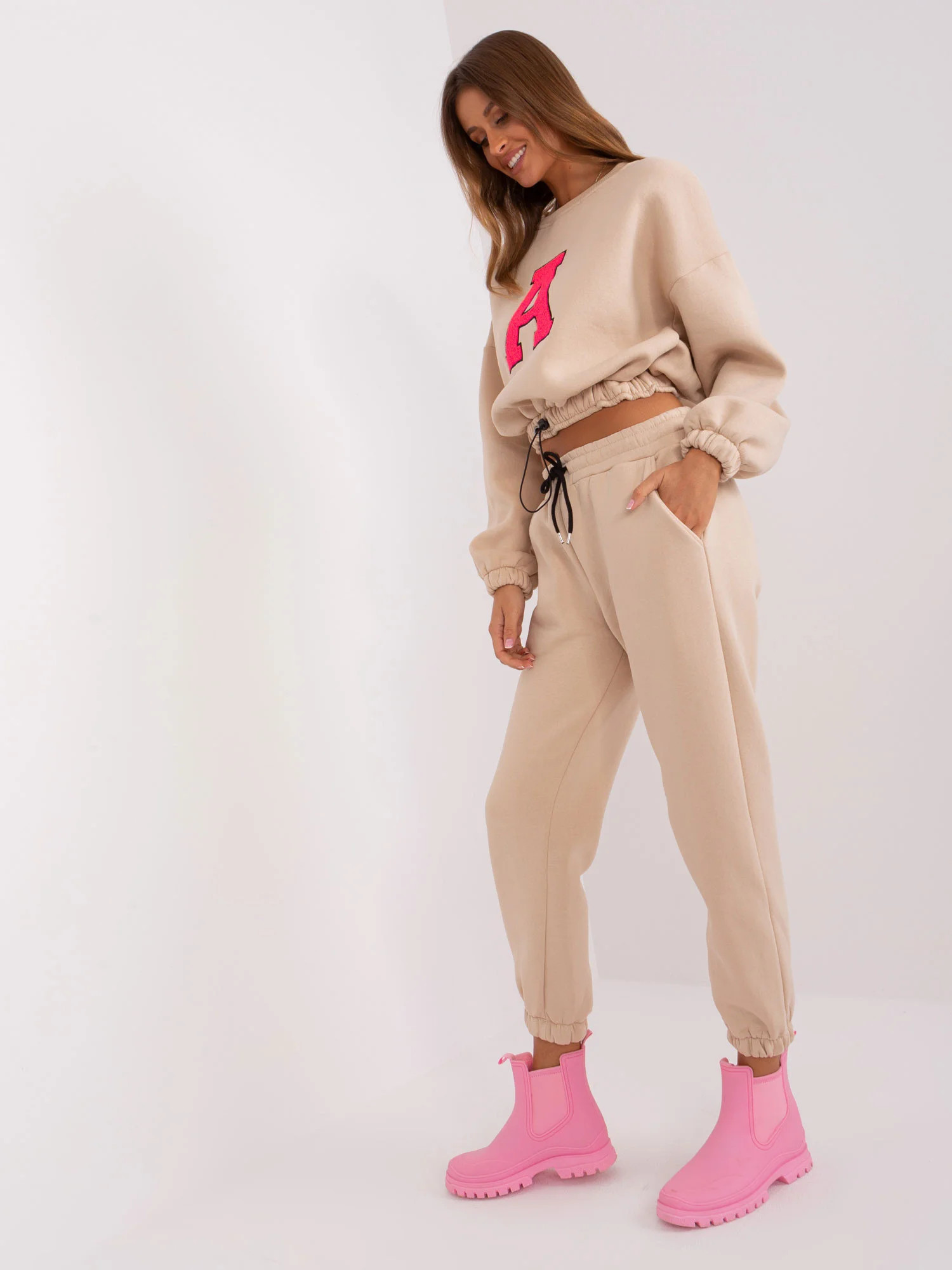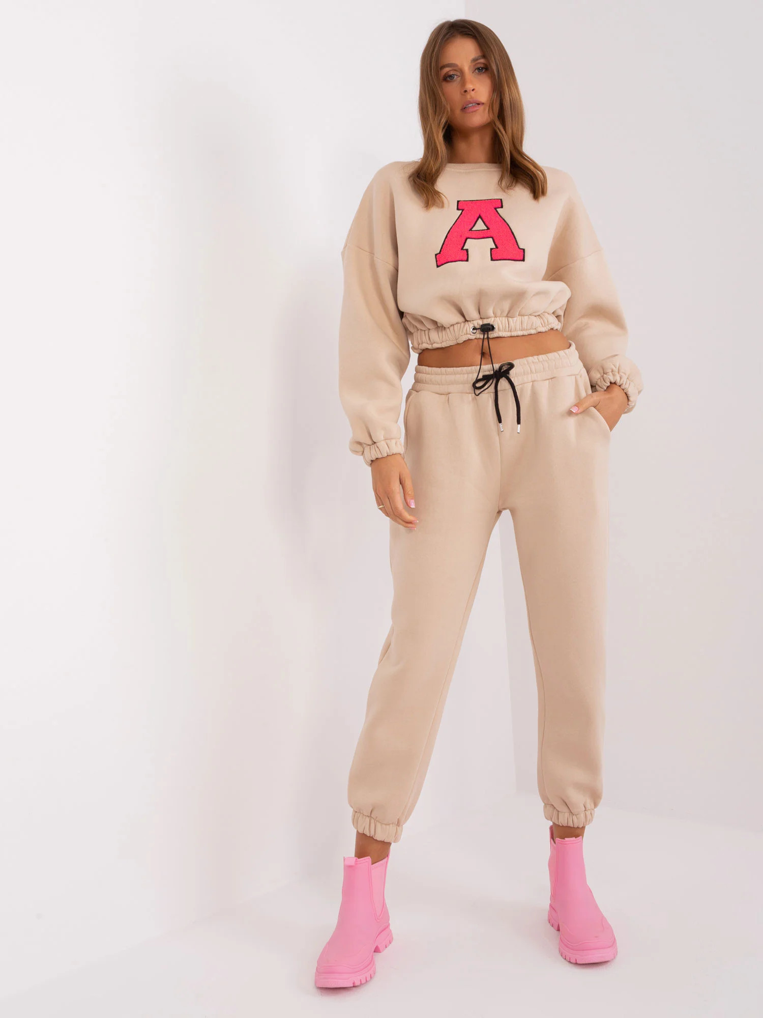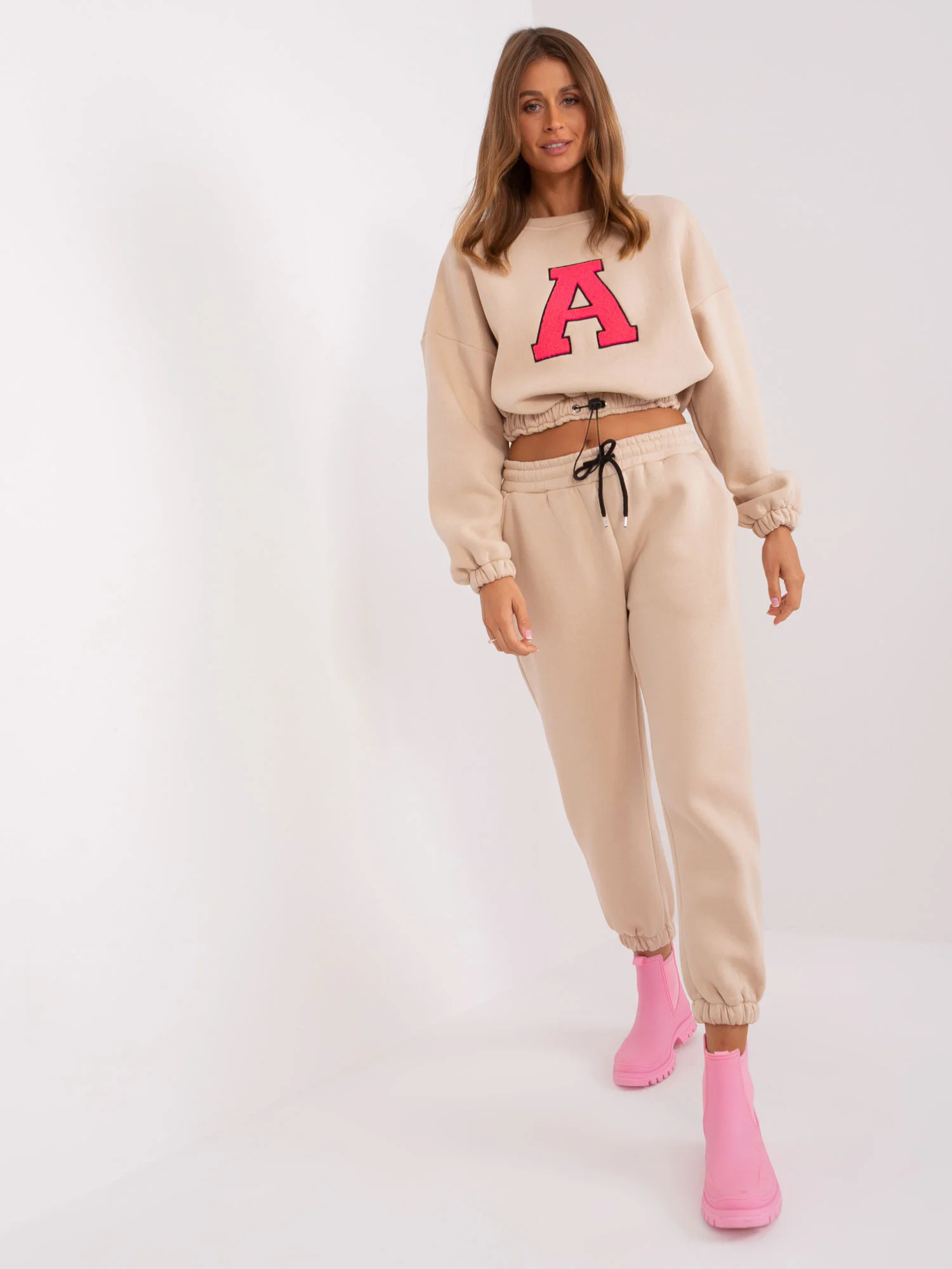 Beżowo-fluo różowy komplet dresowy z literą A .