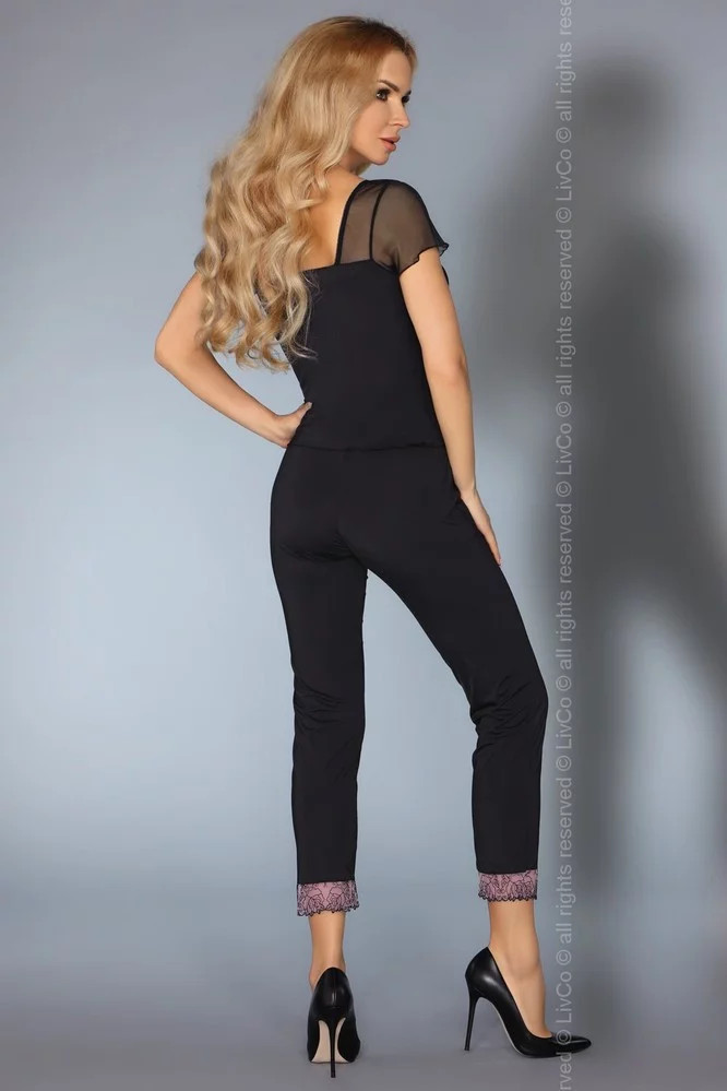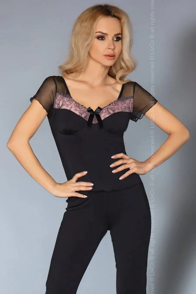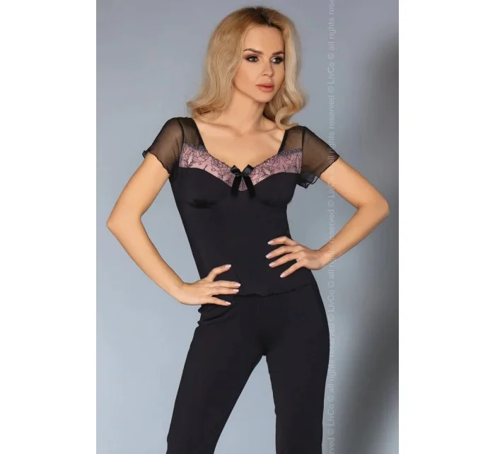 Dvoudílný komplet složený z kalhot a halenky. Halenka se síťovými rukávy, výstřih zdobený vyšívanou krajkou a mašličkou. Kalhoty v 7/8 délce, v pase na gumu, délka kalhot zakončena krajkou. Komplet vhodný jako pyžamo, tak i domácí komplet.