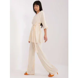 Wymiary kompletu w rozmiarze S/M mierzone na płasko: szerokość bluzki pod pachami - 60 cm, długość rękawa - 40 cm, długość bluzki - 78 cm, szerokość spodni w pasie - 32 cm, wysokość stanu - 33 cm, długość spodni - 114 cm.