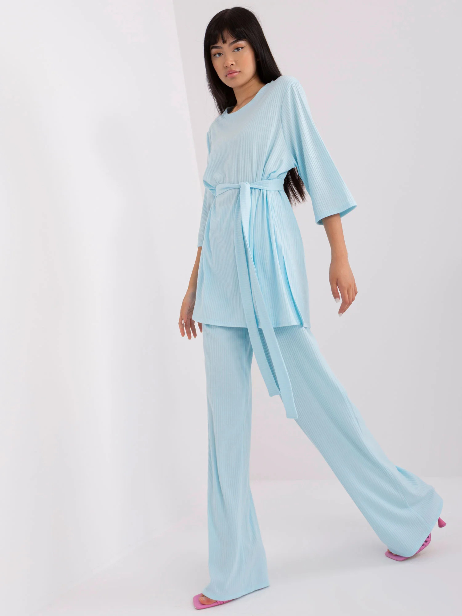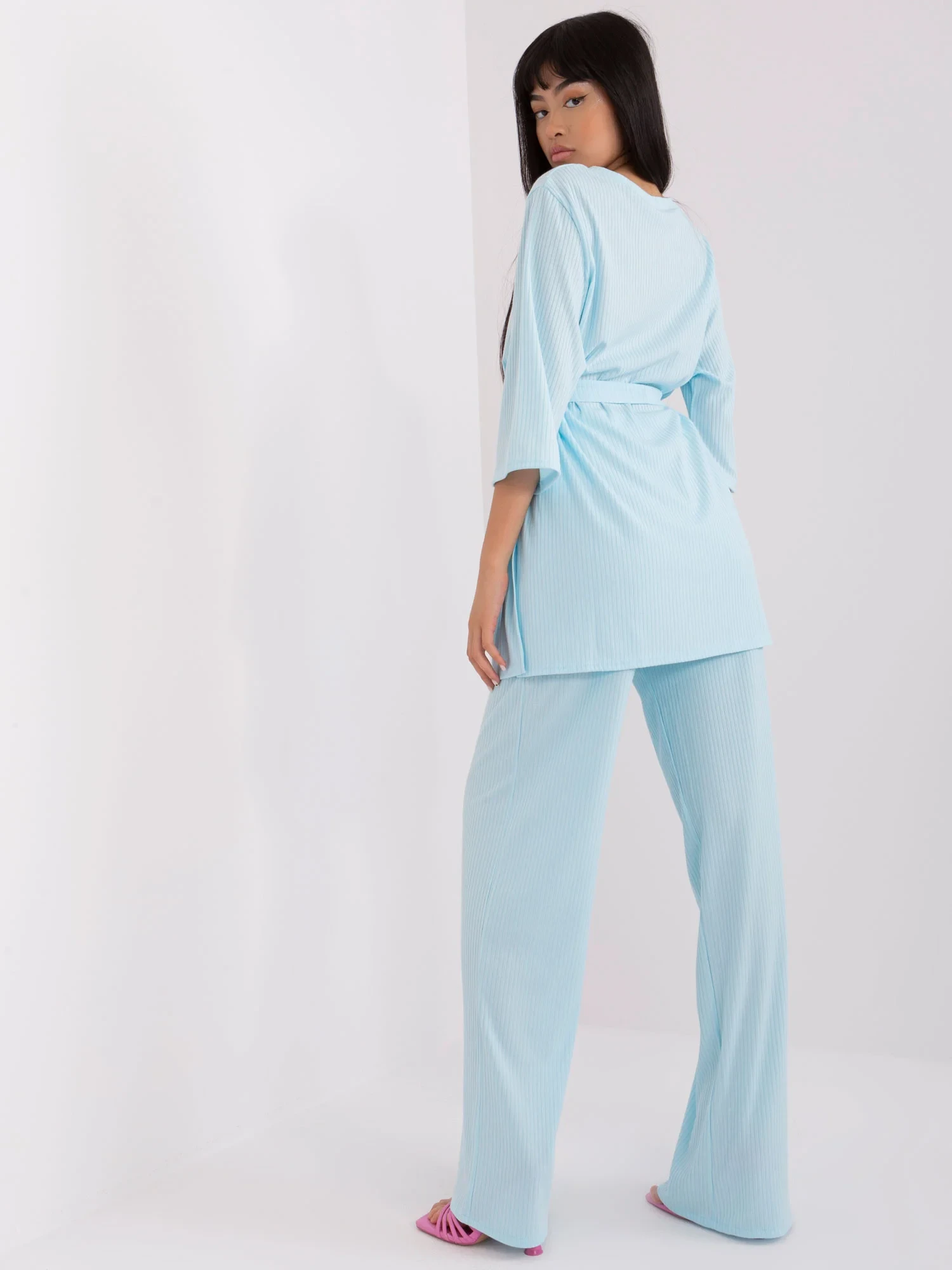 Wymiary kompletu w rozmiarze S/M mierzone na płasko: szerokość bluzki pod pachami - 60 cm, długość rękawa - 40 cm, długość bluzki - 78 cm, szerokość spodni w pasie - 32 cm, wysokość stanu - 33 cm, długość spodni - 114 cm.