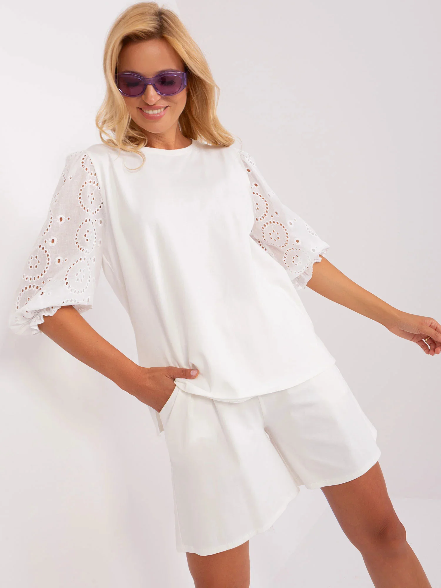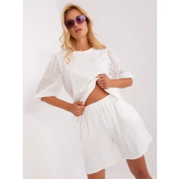 Wymiary kompletu w rozmiarze S/M mierzone na płasko: szerokość bluzki pachami - 58 cm, długość rękawa - 43 cm, długość bluzki - 67 cm, szerokość szortów w pasie - 32 cm, wysokość stanu - 33 cm, długość całkowita - 47 cm.