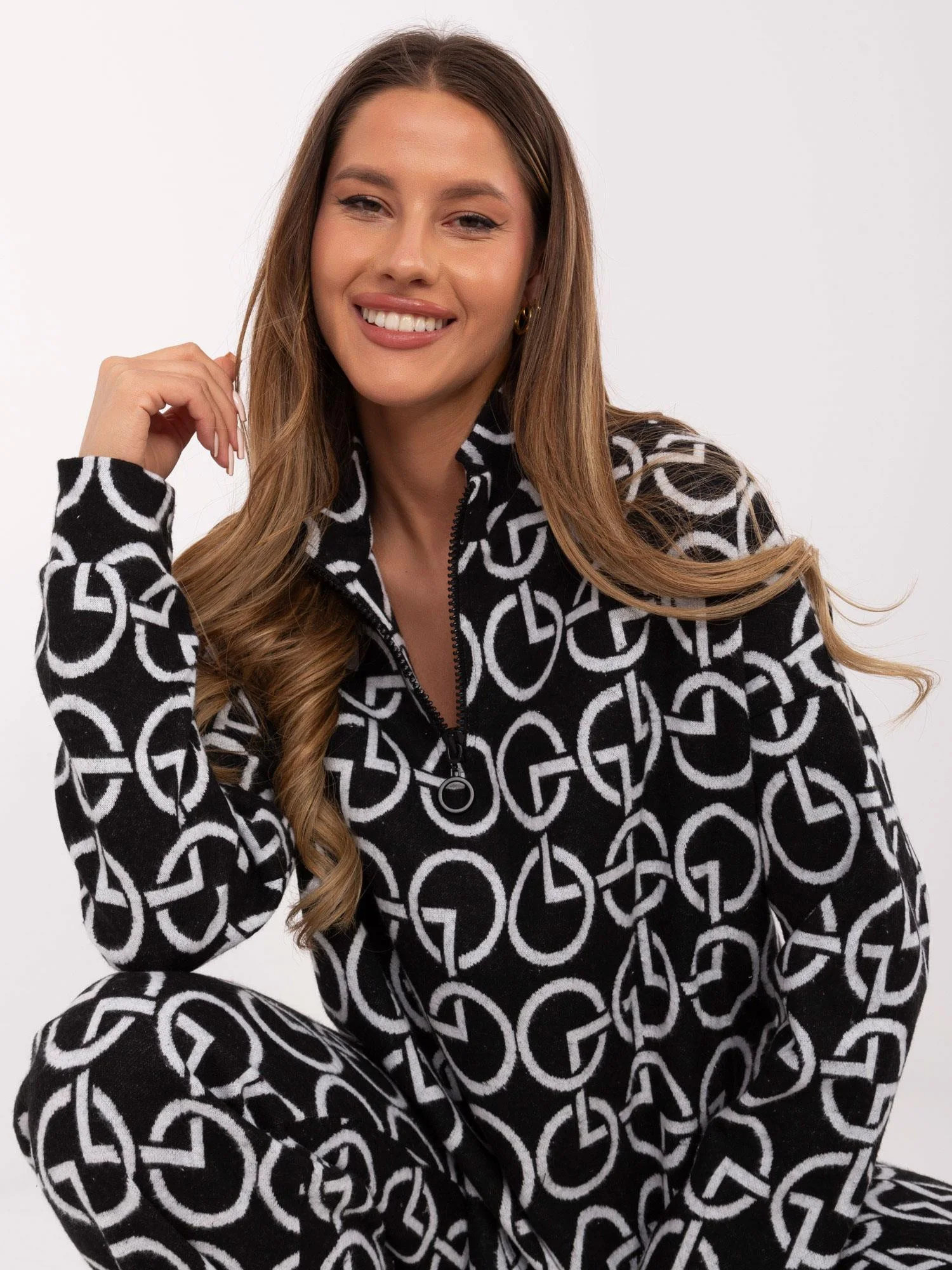 Modelka ma na sobie rozmiar S/M. Wymiary modelki: wzrost 176 cm, biust 90 cm, talia 62 cm, biodra 94 cm.