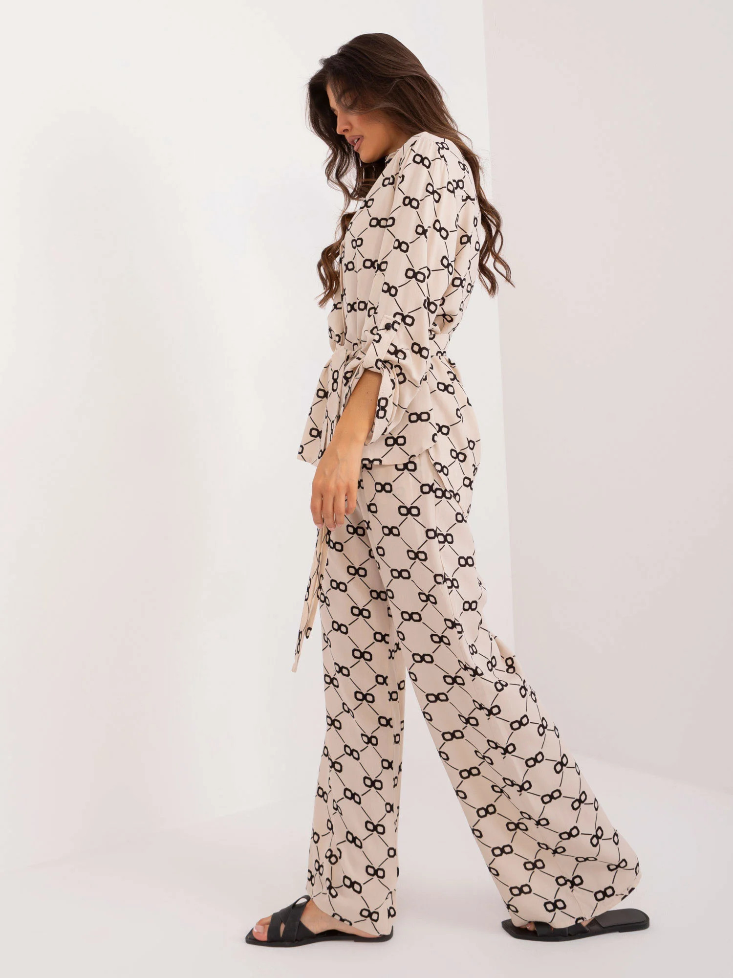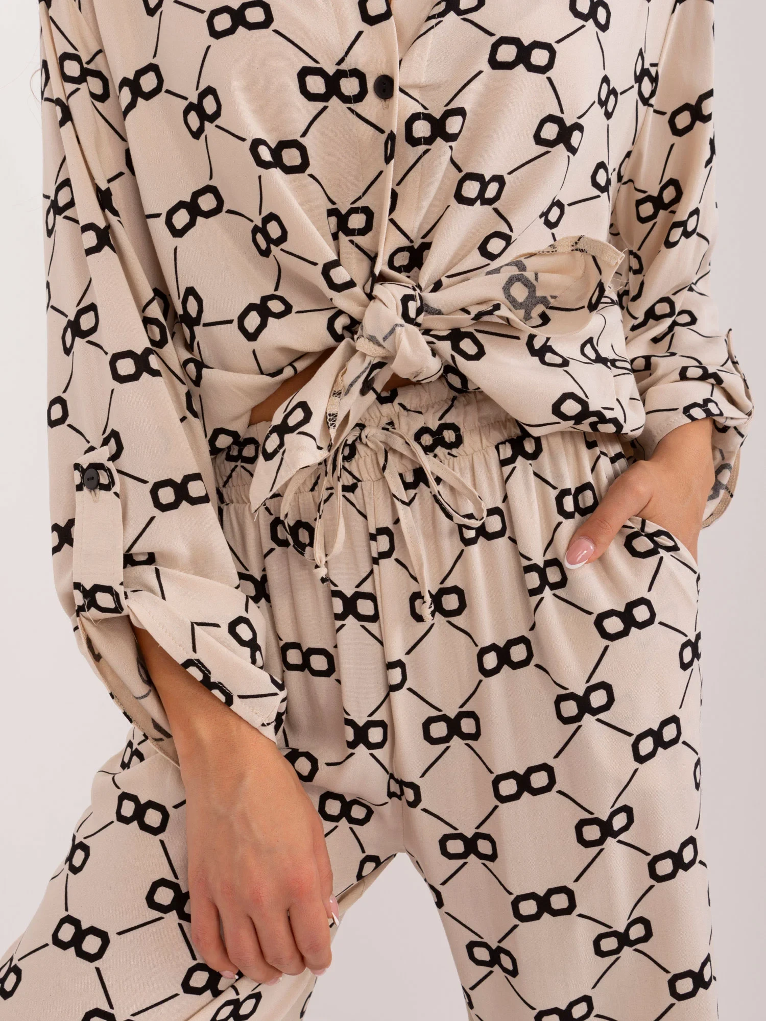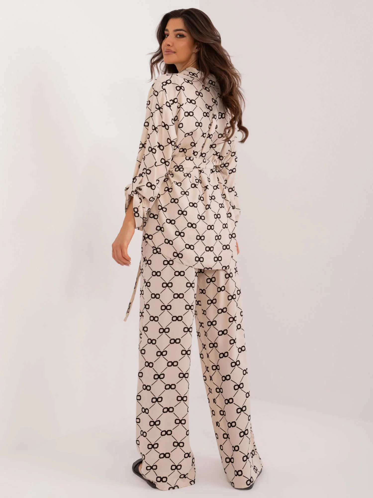 Wymiary kompletu w rozmiarze S/M mierzone na płasko: szerokość koszuli pod pachami - 62 cm, długość rękawa - 65 cm, długość koszuli (przód) - 68 cm, długość koszuli (tył) - 77 cm, szerokość spodni w pasie - 34 cm, wysokość stanu - 34 cm, długość spodni - 113 cm.