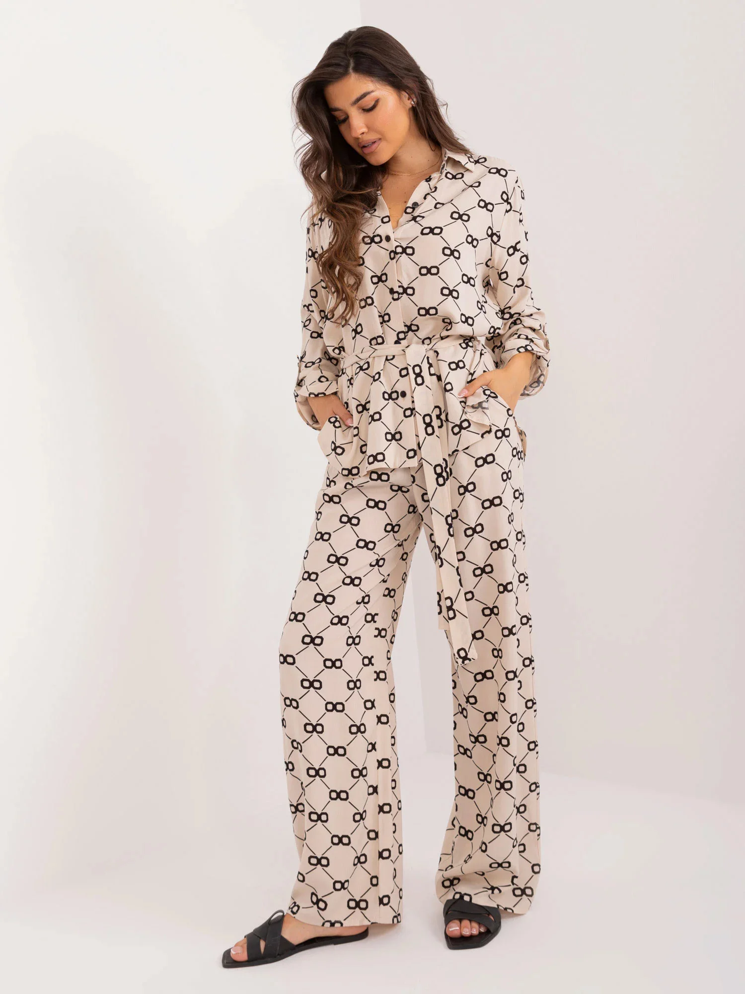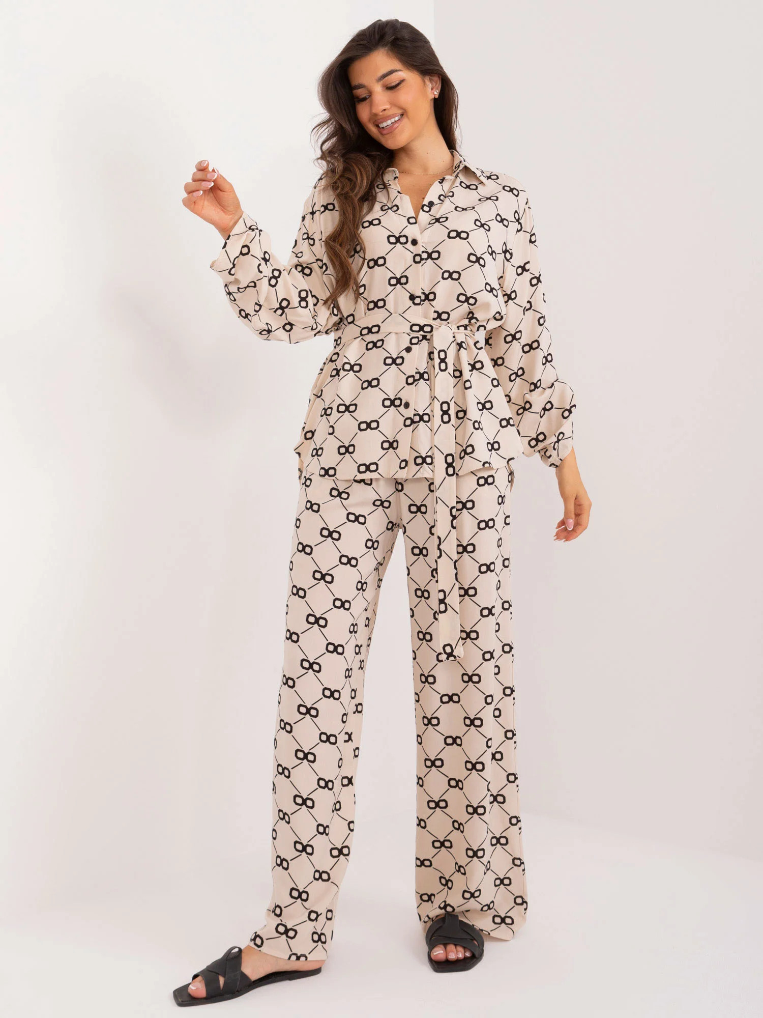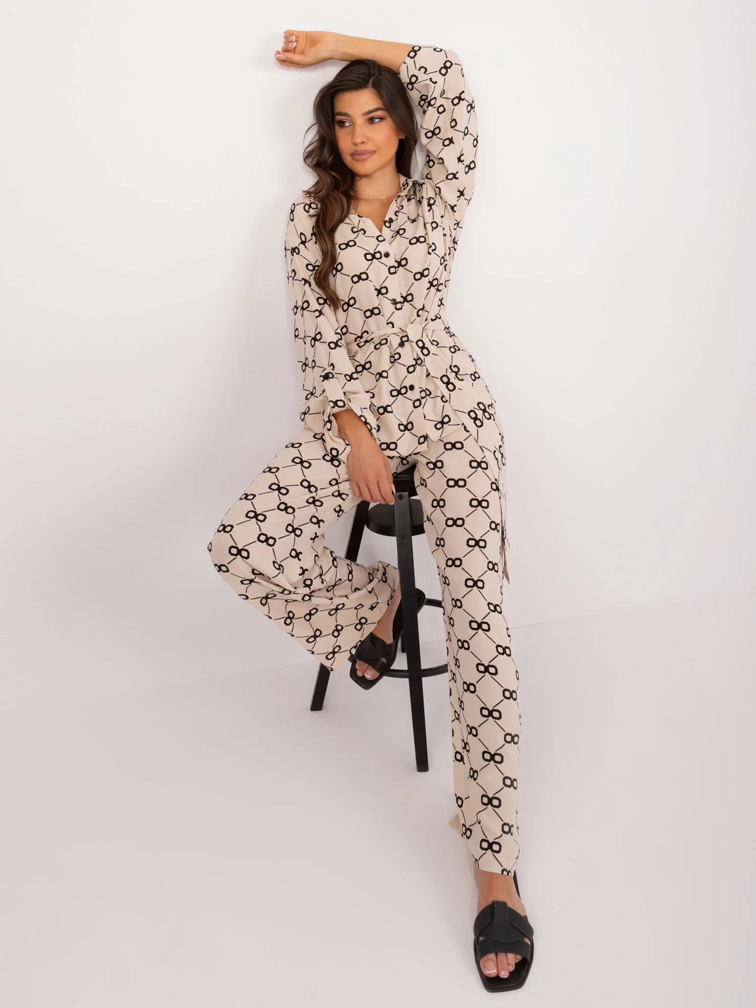 Wymiary kompletu w rozmiarze S/M mierzone na płasko: szerokość koszuli pod pachami - 62 cm, długość rękawa - 65 cm, długość koszuli (przód) - 68 cm, długość koszuli (tył) - 77 cm, szerokość spodni w pasie - 34 cm, wysokość stanu - 34 cm, długość spodni - 113 cm.