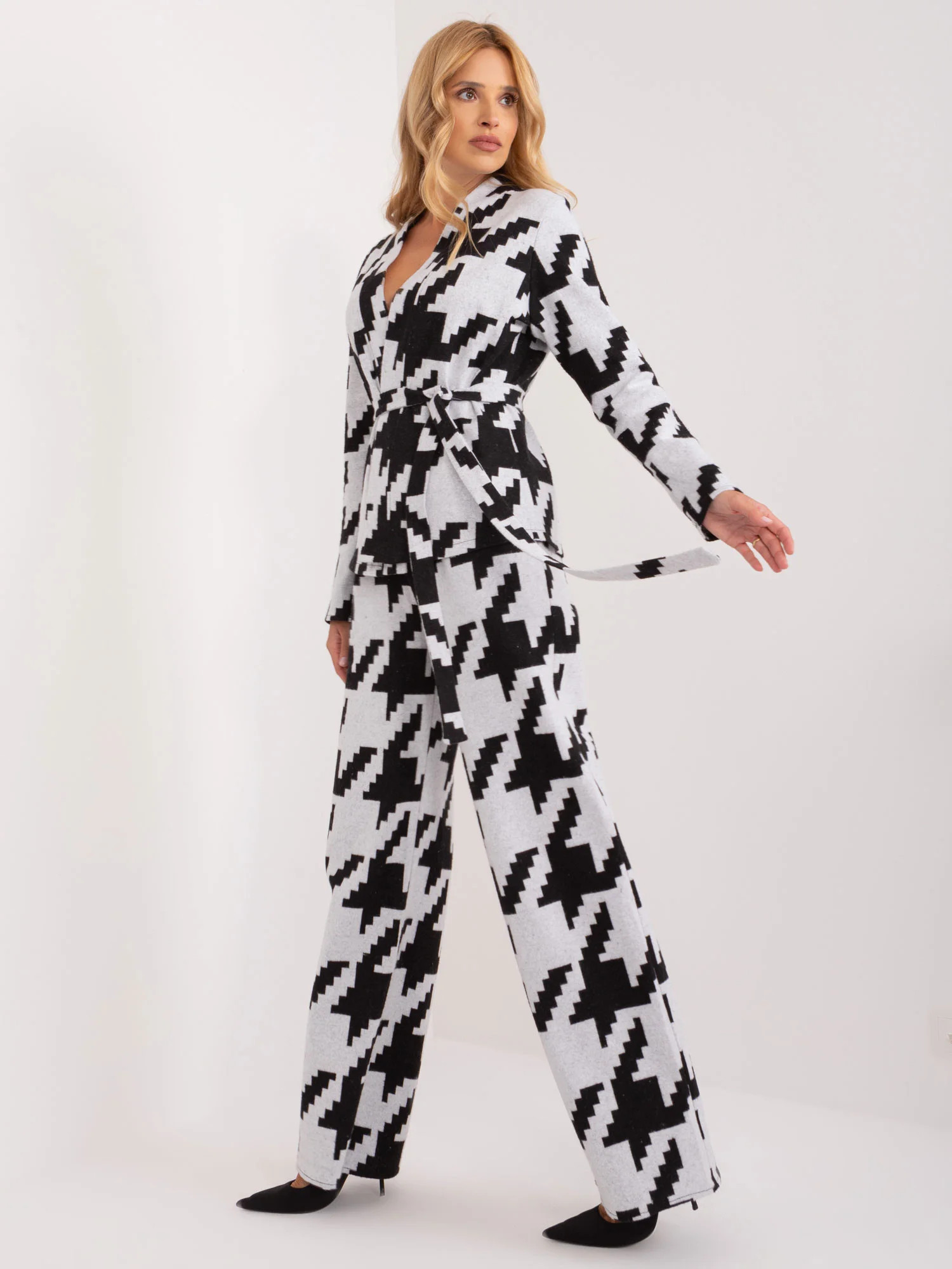 Wymiary kompletu w rozmiarze S/M mierzone na płasko: szerokość narzutki pod pachami - 55 cm, długość rękawa - 61 cm, długość narzutki - 61 cm, szerokość w pasie - 35 cm, wysokość stanu - 32 cm, długość całkowita - 112cm.