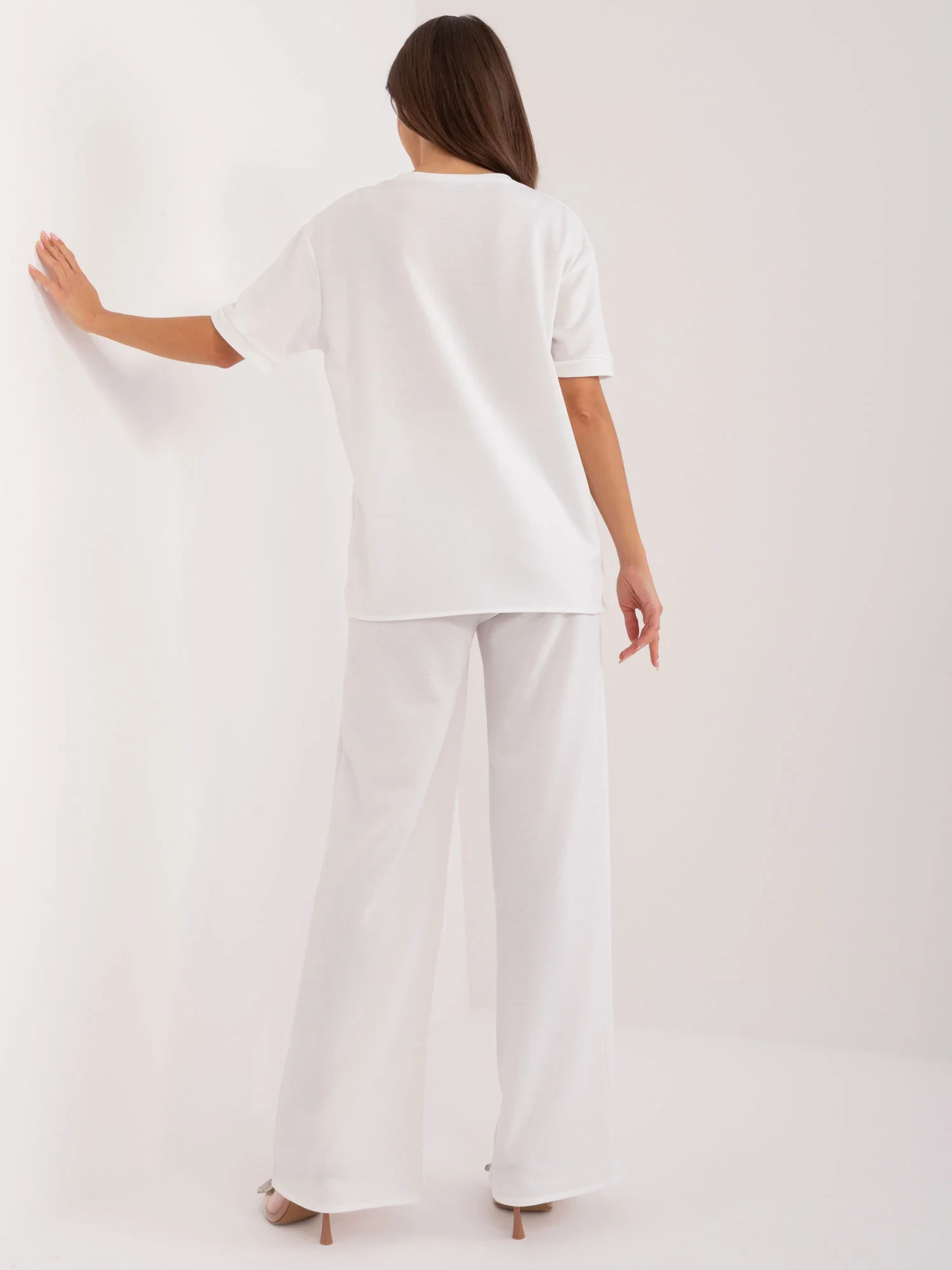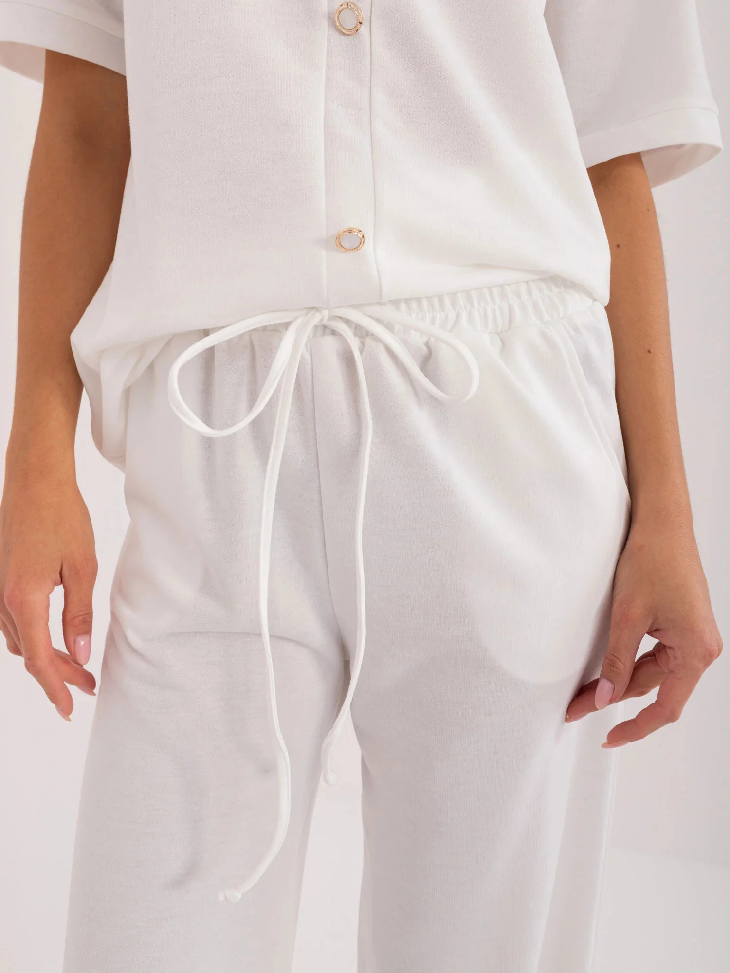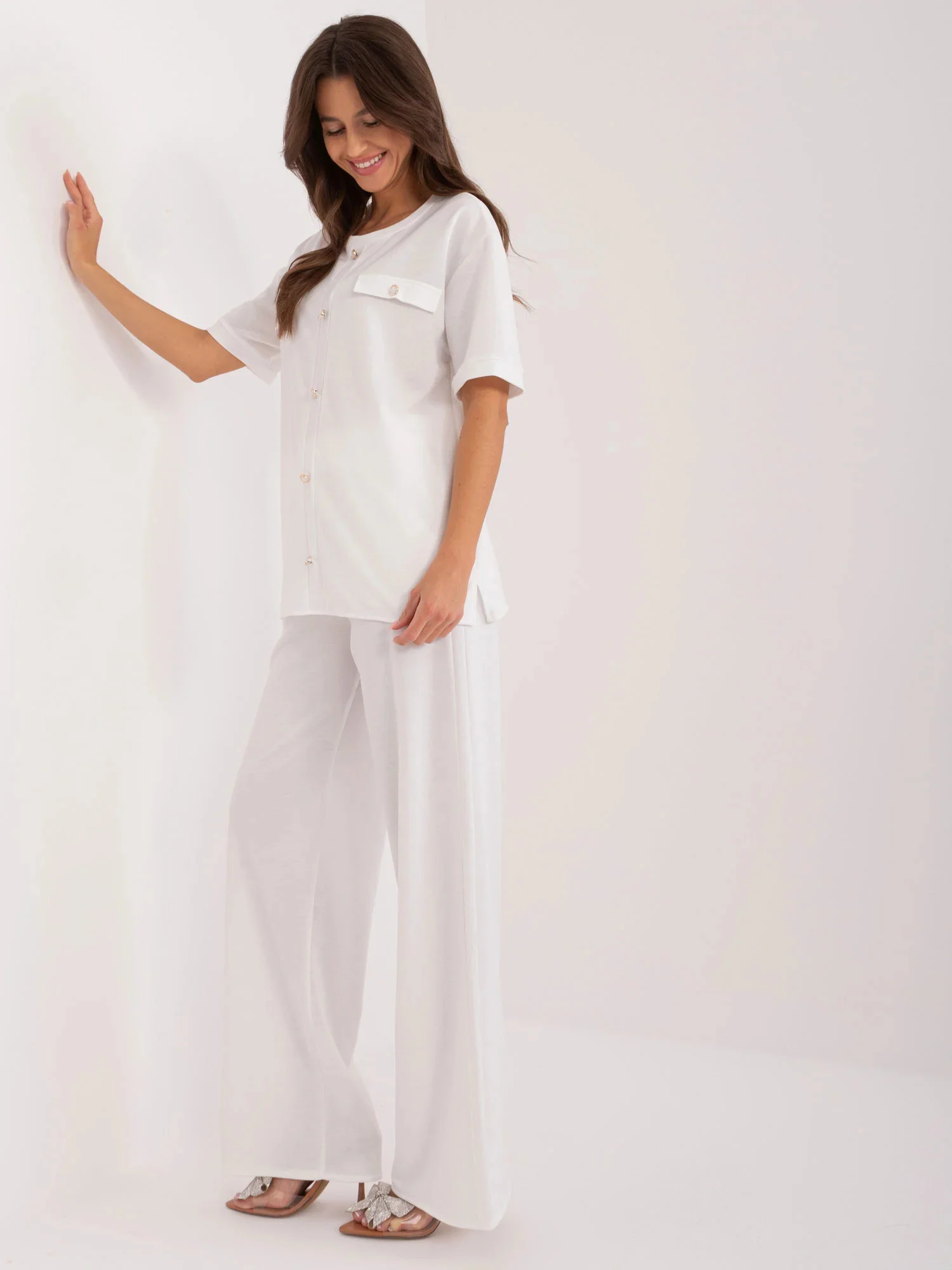 Wymiary kompletu w rozmiarze S/M mierzone na płasko: szerokość bluzki pod pachami - 52 cm, długość bluzki - 65 cm, szerokość spodni w pasie - 34 cm, wysokość stanu - 32 cm, długość spodni - 108 cm.
