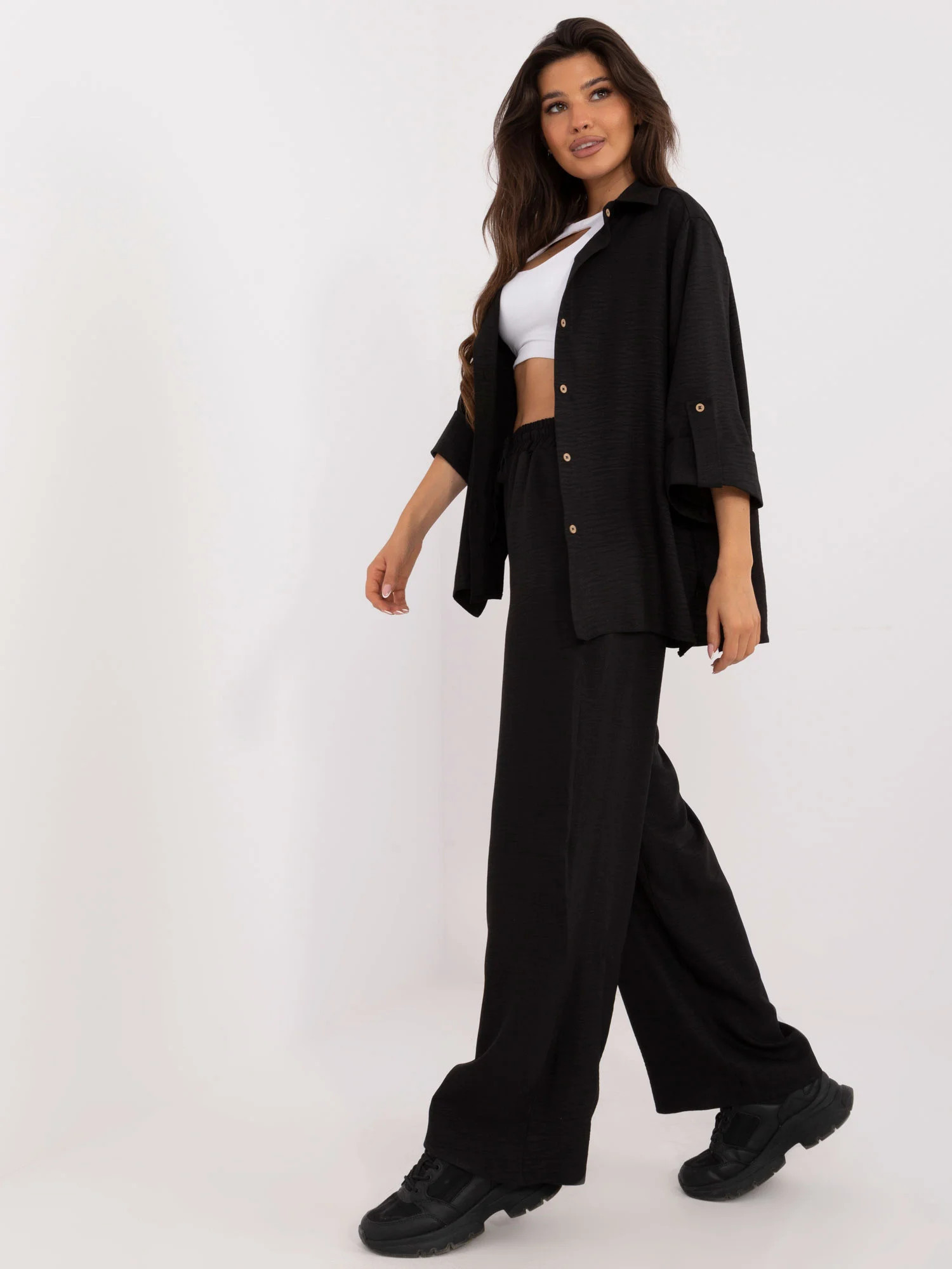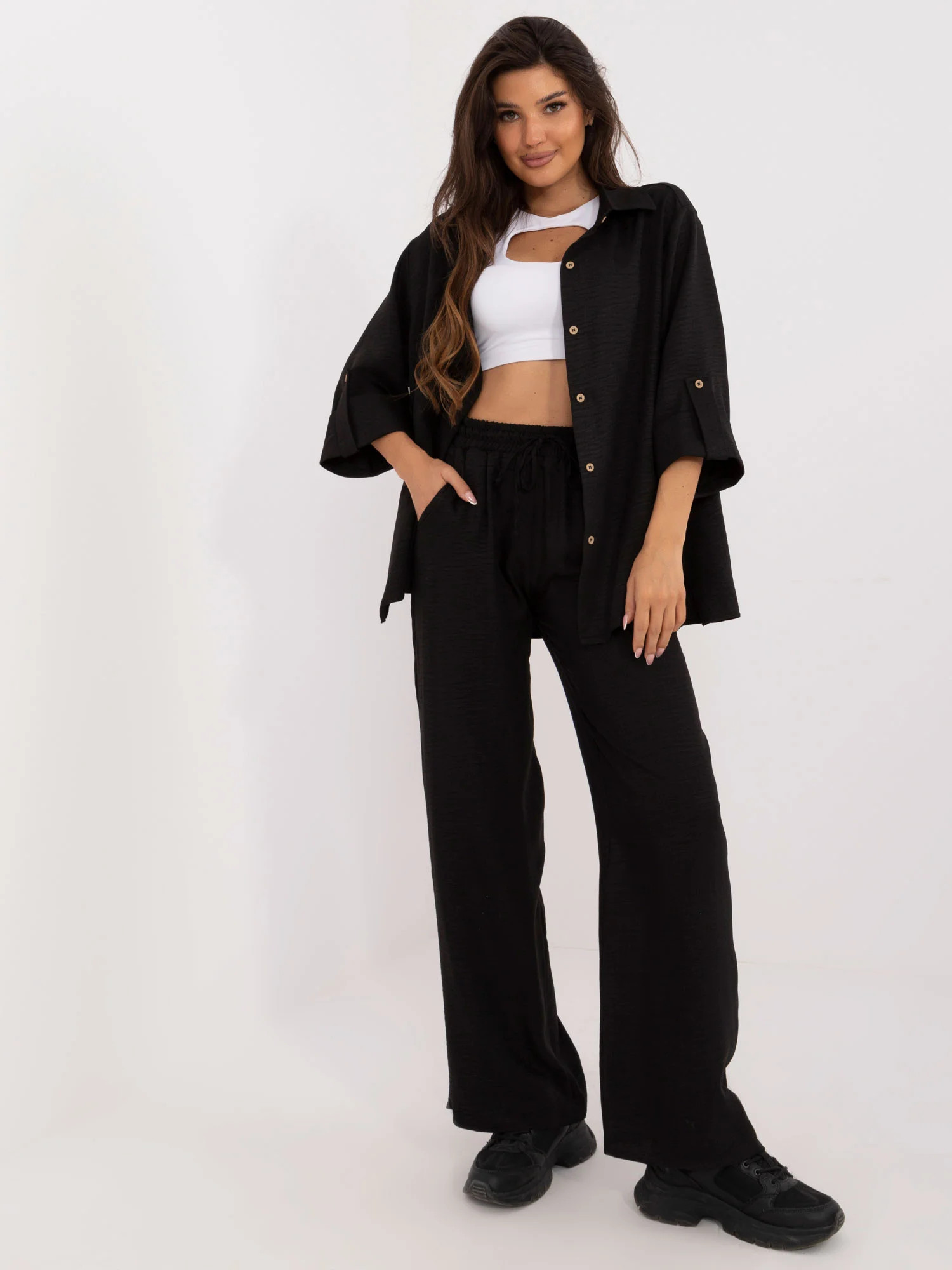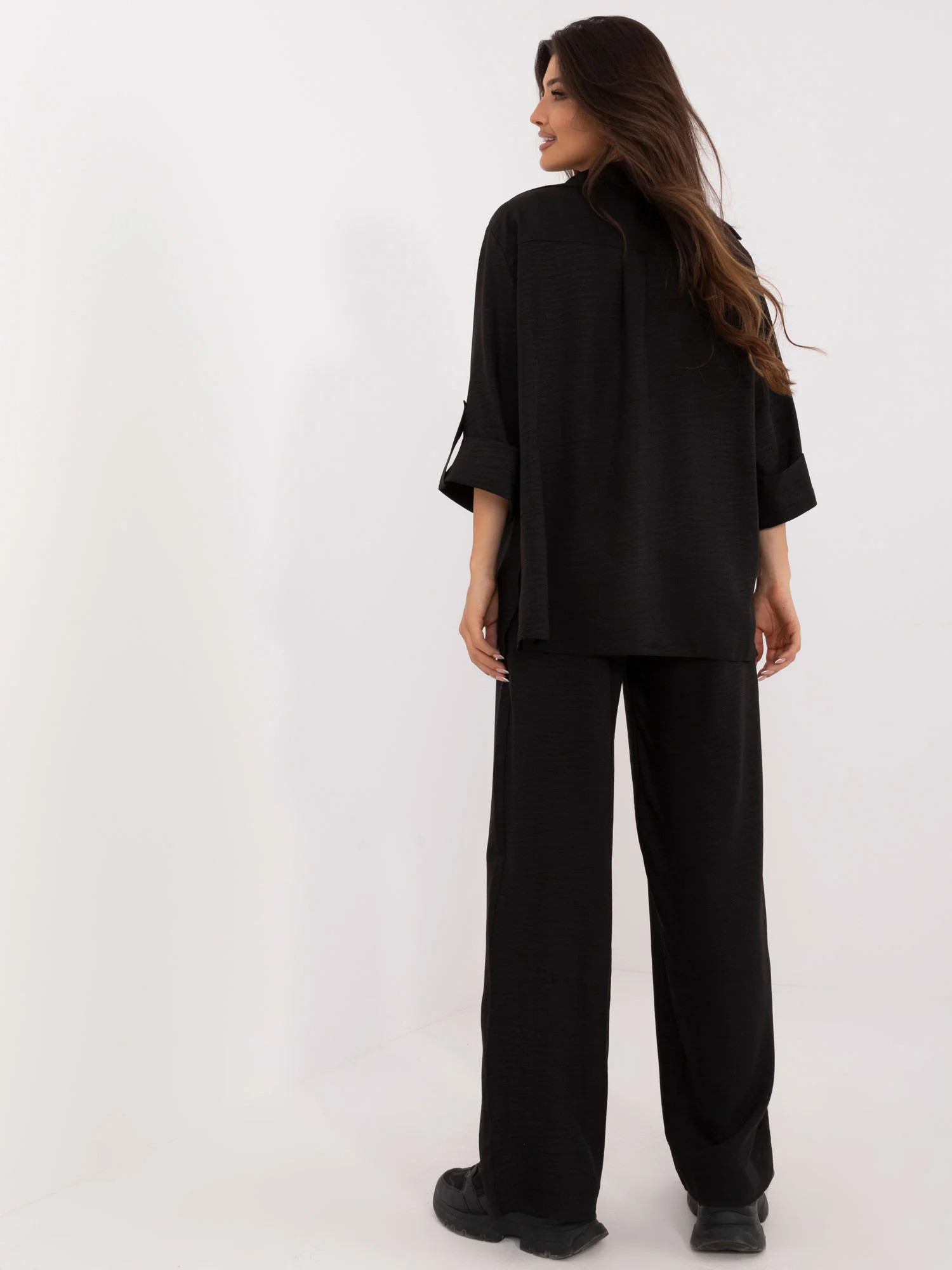 Wymiary kompletu w rozmiarze S/M mierzone na płasko: szerokość koszuli pod pachami - 62 cm, długość rękawa - 44 cm, długość koszuli -73 cm, szerokość spodni w pasie - 34 cm, długość spodni - 108 cm.