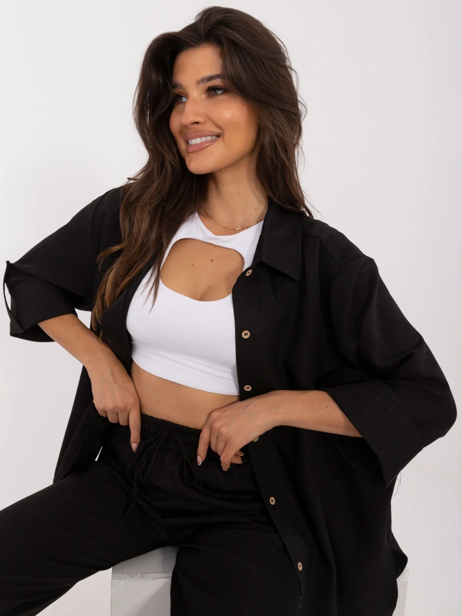 Modelka ma na sobie rozmiar S/M. Wymiary modelki: wzrost 173 cm, biust 89 cm, talia 65 cm, biodra 91 cm.