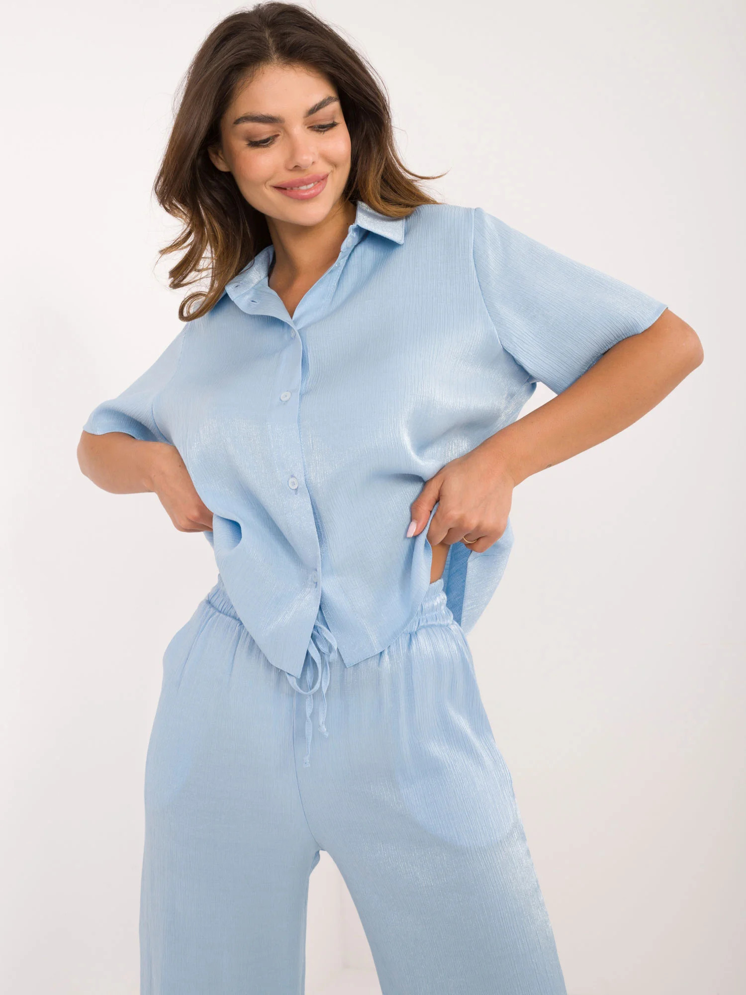 Wymiary kompletu w rozmiarze S/M. mierzone na płasko: szerokość koszuli pod pachami - 57 cm, długość koszuli - 56 cm, szerokość spodni w pasie - 33 cm, długość spodni - 112 cm.