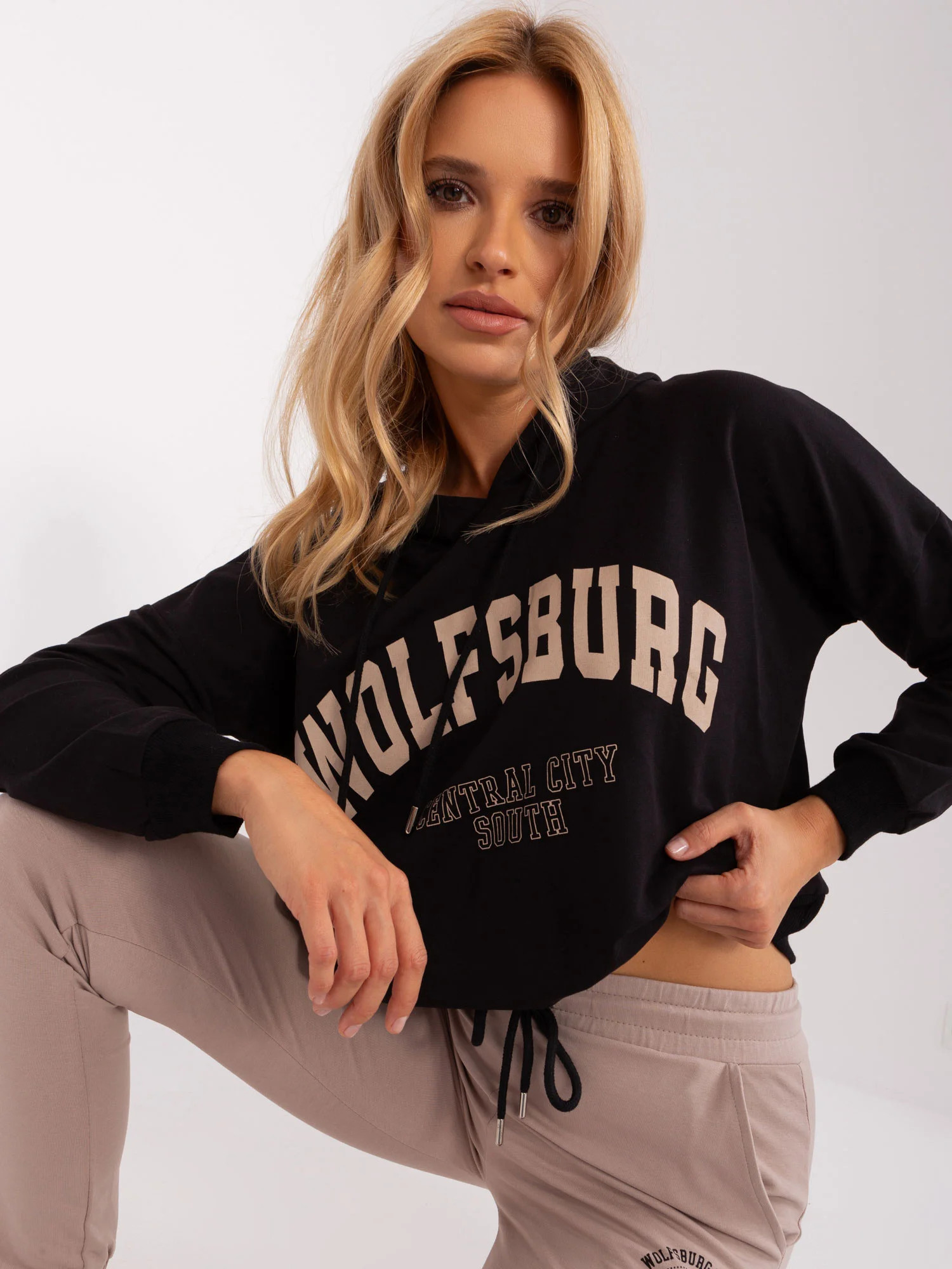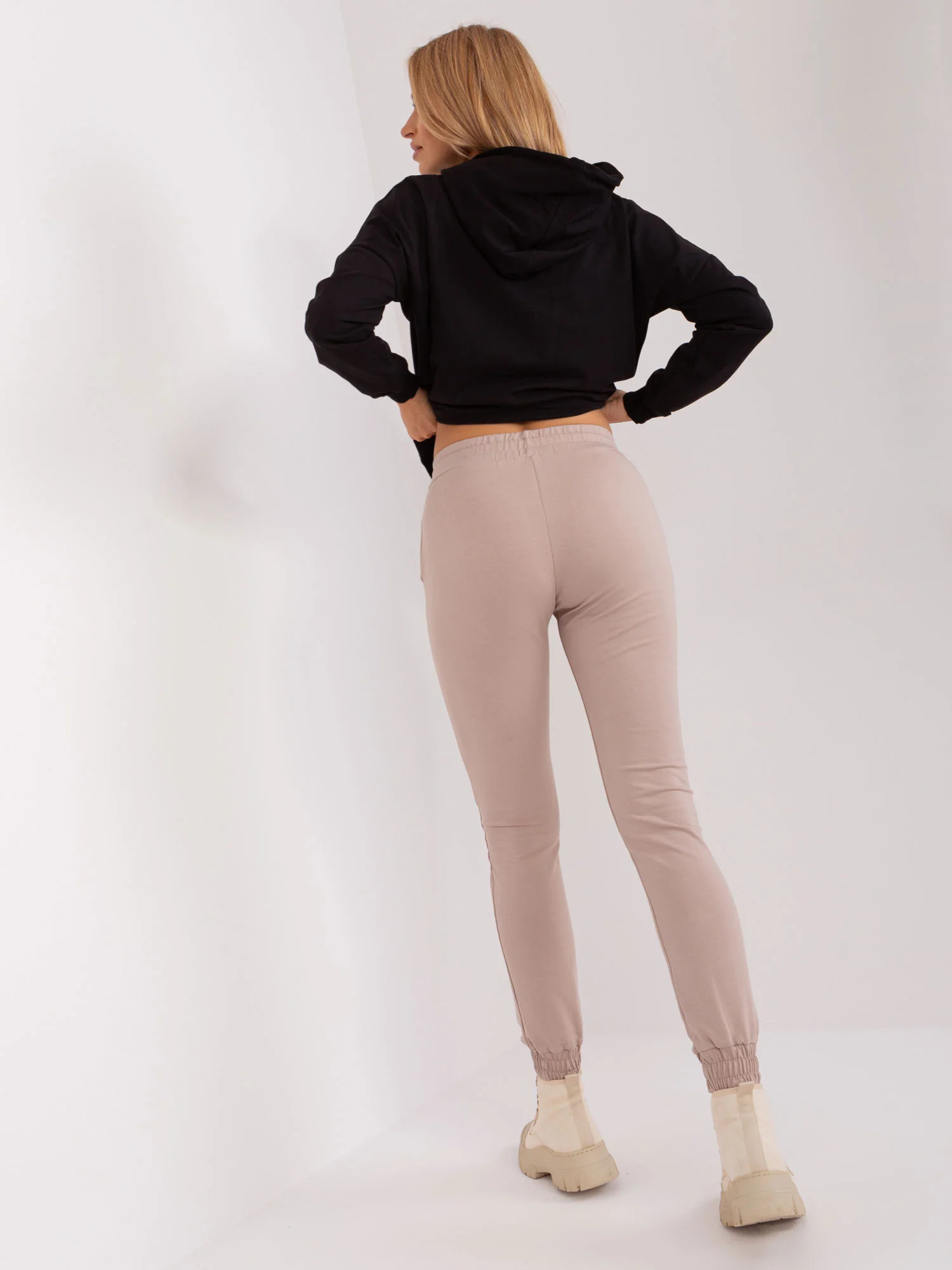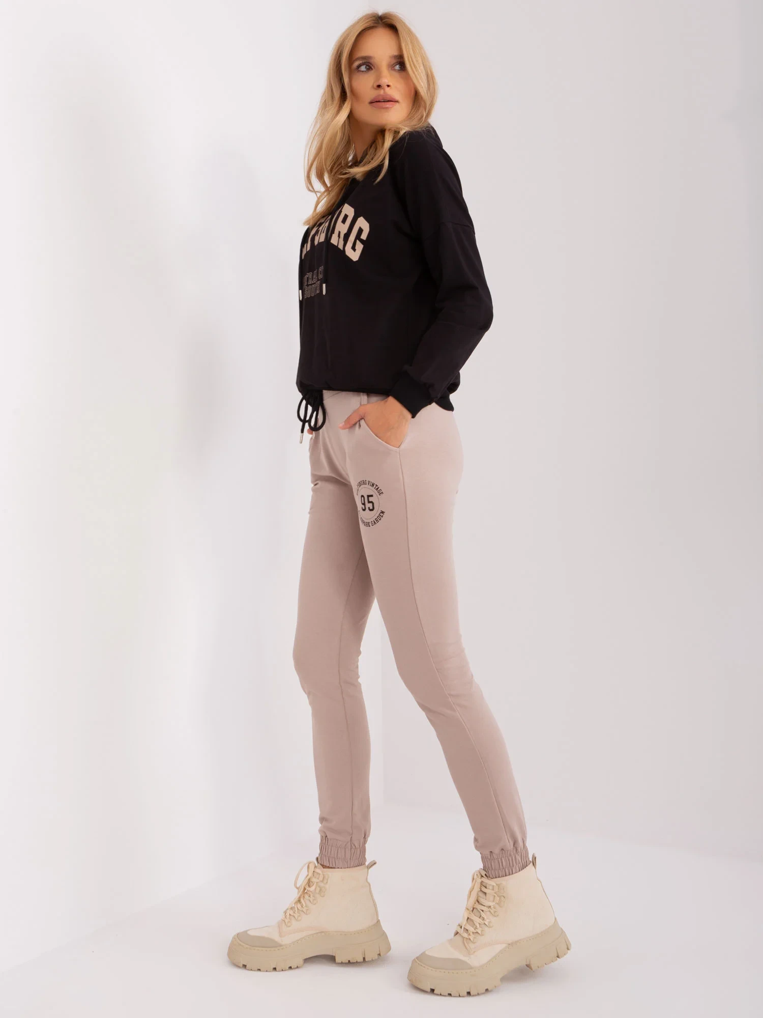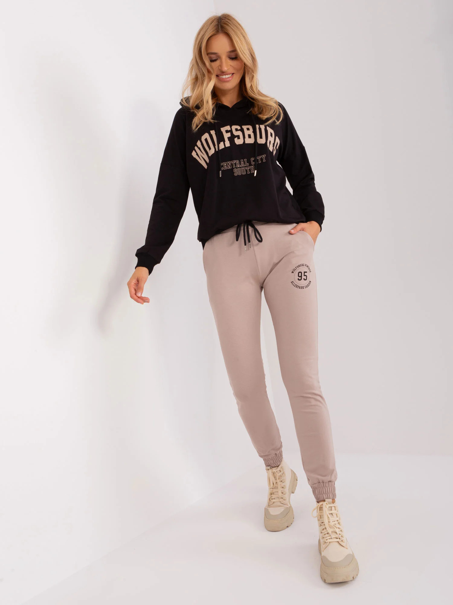 Wymiary kompletu w rozmiarze S/M mierzone na płasko: szerokość bluzy pod pachami - 57 cm, długość rękawa - 58 cm, długość bluzy - 57 cm, szerokość spodni w pasie - 37 cm, wysokość stanu - 26 cm, długość spodni - 96 cm.