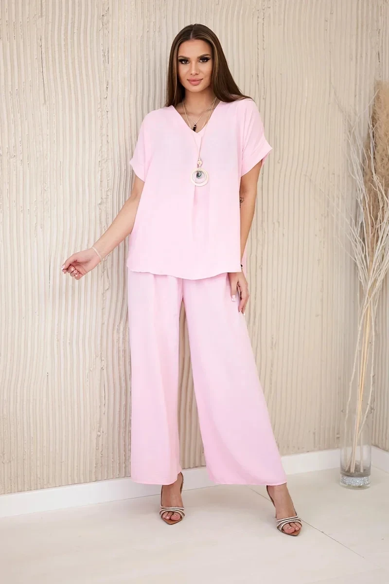 Objevte jedinečný komplet, který spojuje pohodlí a eleganci a vytváří dokonalý outfit pro každou příležitost. Vyrobený z lehké a prodyšné viskózy, poskytuje maximální komfort při nošení a zároveň vypadá velmi stylově. Plisovaná halenka s volným střihem jemně podtrhuje siluetu a dodává jí lehkost a moderní vzhled. Široké kalhoty dokonale ladí s halenkou a zajišťují volnost pohybu i elegantní vzhled. Celý komplet doplňuje ozdobný náhrdelník, který přidává jedinečný stylový prvek a eliminuje potřebu dalších doplňků. Tento set je ideální jak pro formální setkání, tak i pro každodenní nošení, kdy chcete vypadat elegantně, ale zároveň se cítit pohodlně. Vyberte si komplet z viskózy a užívejte si lehkost i nadčasový styl. Velikost je univerzální a vhodná pro ženy nosící velikosti S, M nebo L.