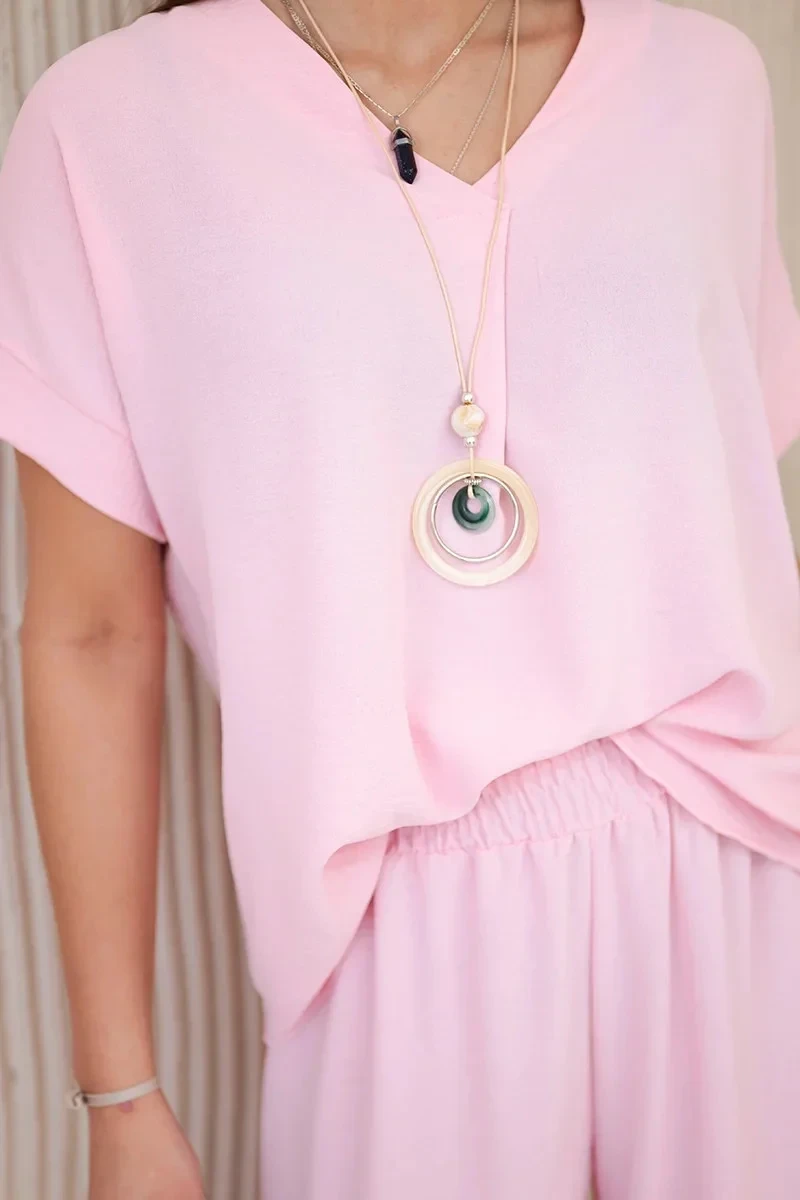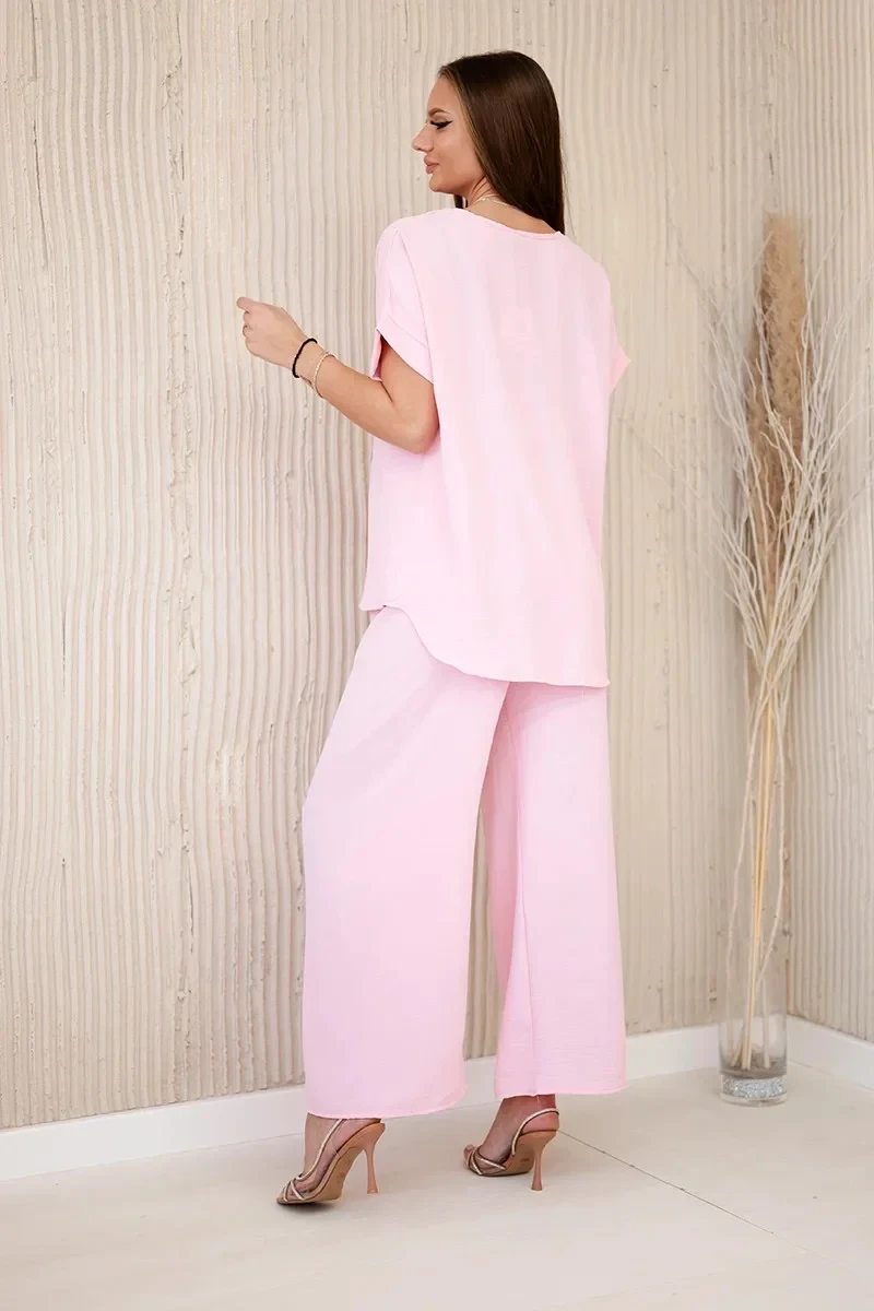 Viskózový komplet plisovaná halenka + kalhoty bonbónově růžová