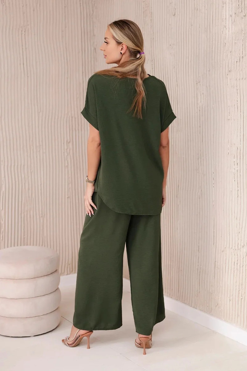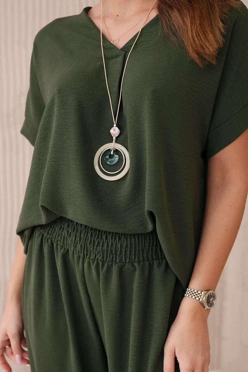Komplet s náhrdelníkem halenka + kalhoty khaki