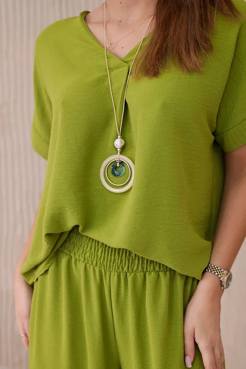 Komplet s náhrdelníkem halenka + kalhoty kiwi