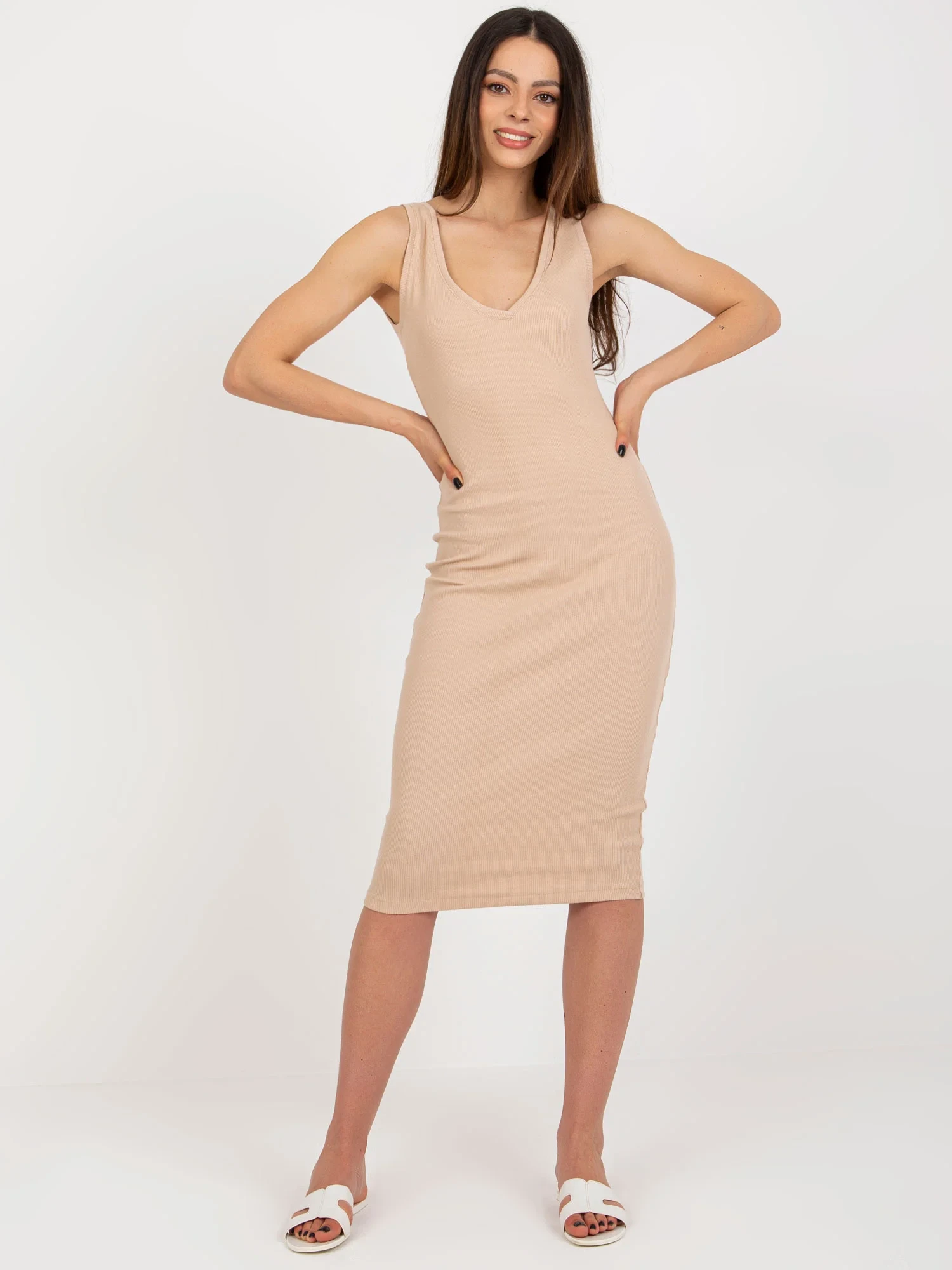 Modelka ma na sobie rozmiar S. Wymiary modelki: wzrost 175 cm, biust 84 cm, talia 61 cm, biodra 91 cm.