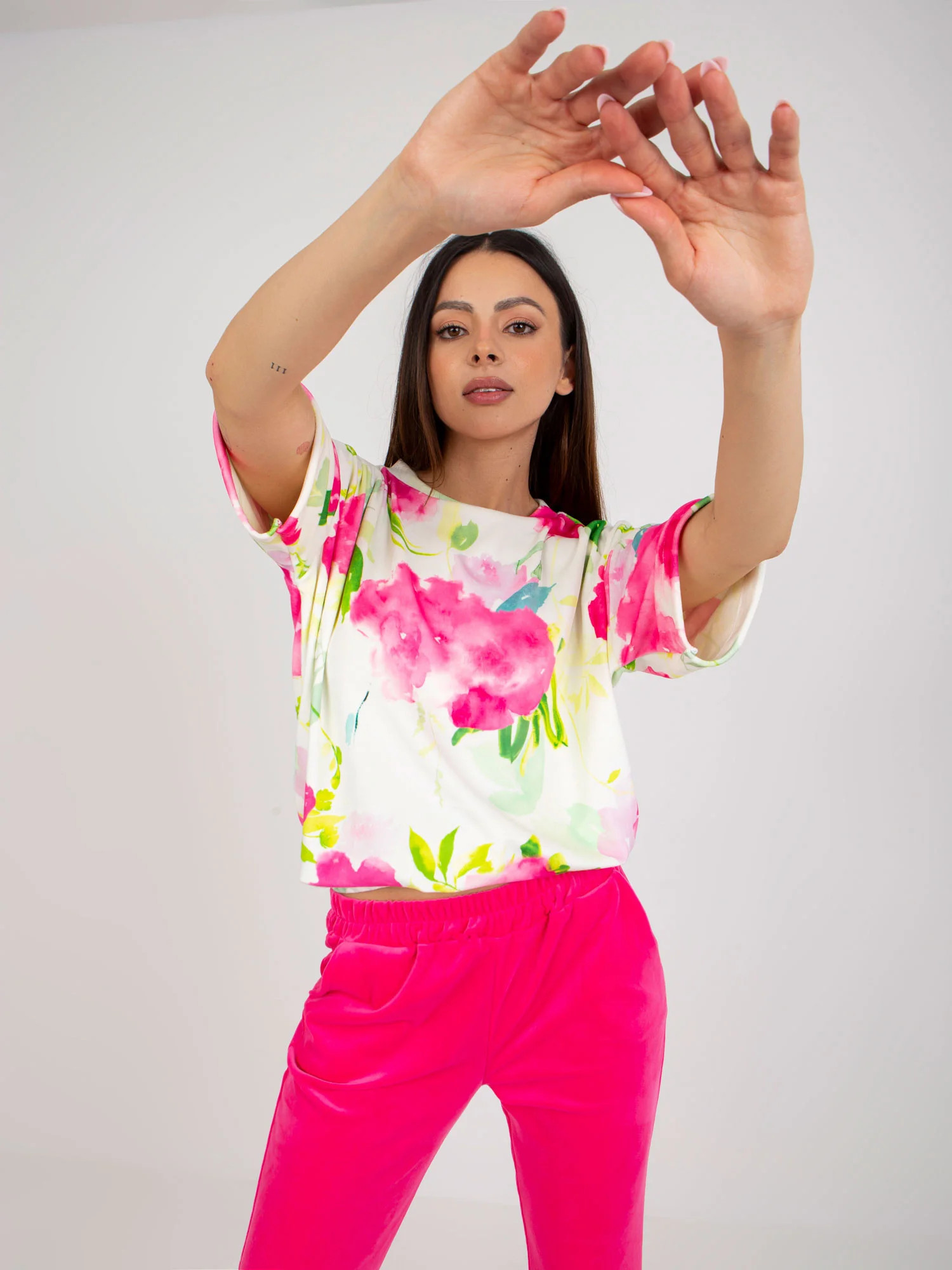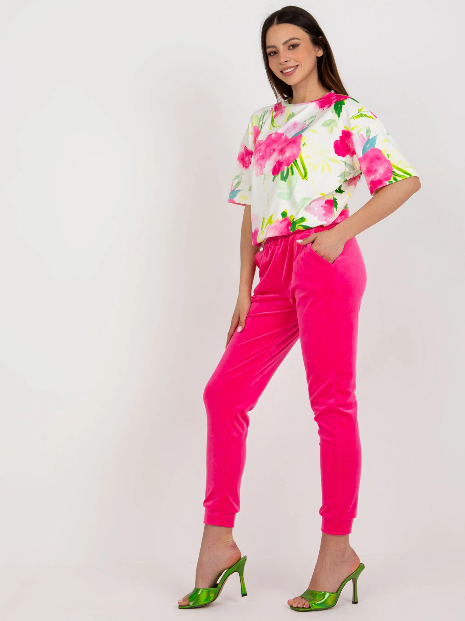 Wymiary kompletu w rozmiarze S mierzone na płasko: szerokość bluzki pod pachami - 64 cm, długość bluzki - 60 cm, szerokość spodni w pasie - 33 cm, wysokość stanu - 28 cm, długość spodni - 98 cm.