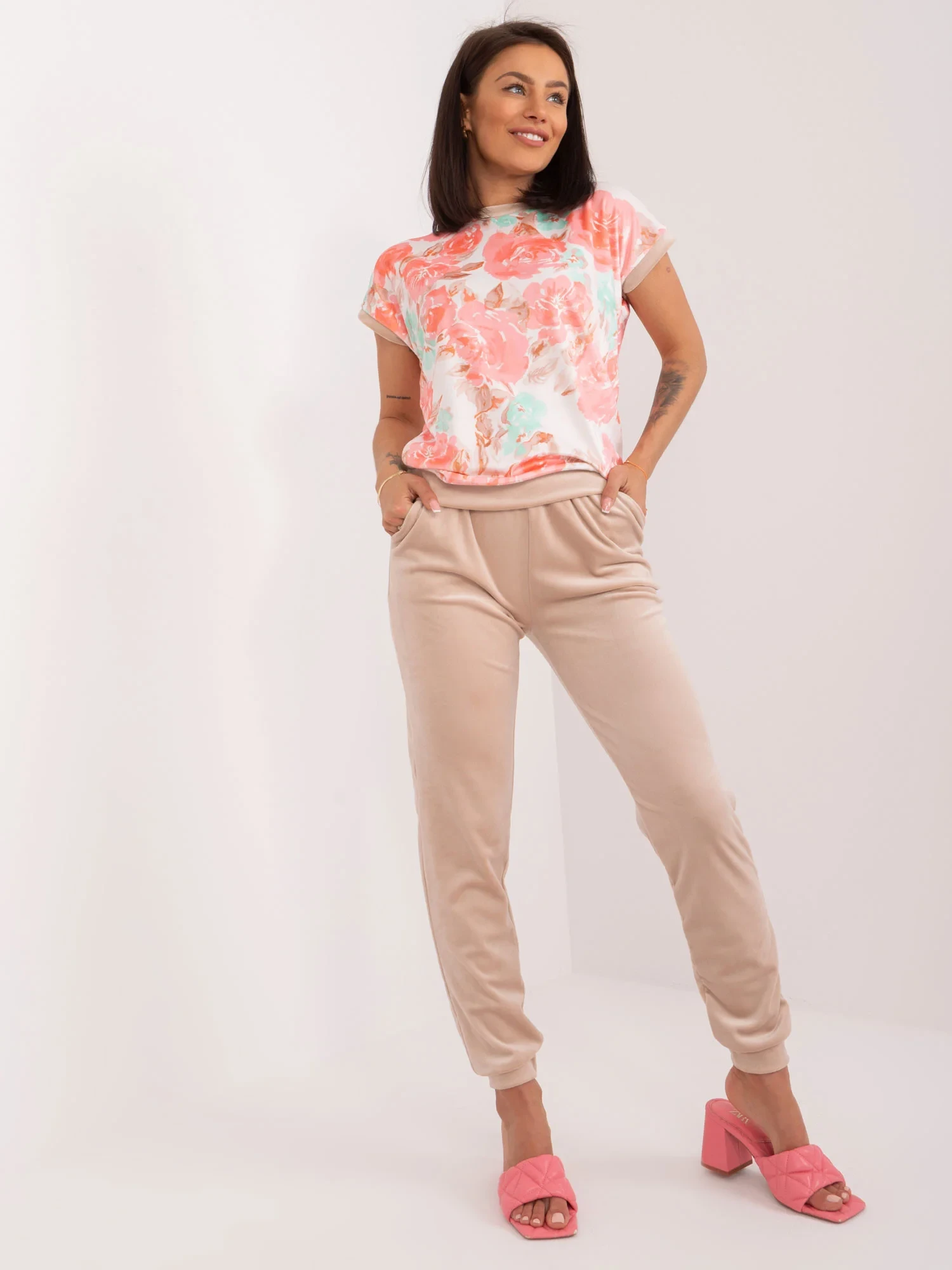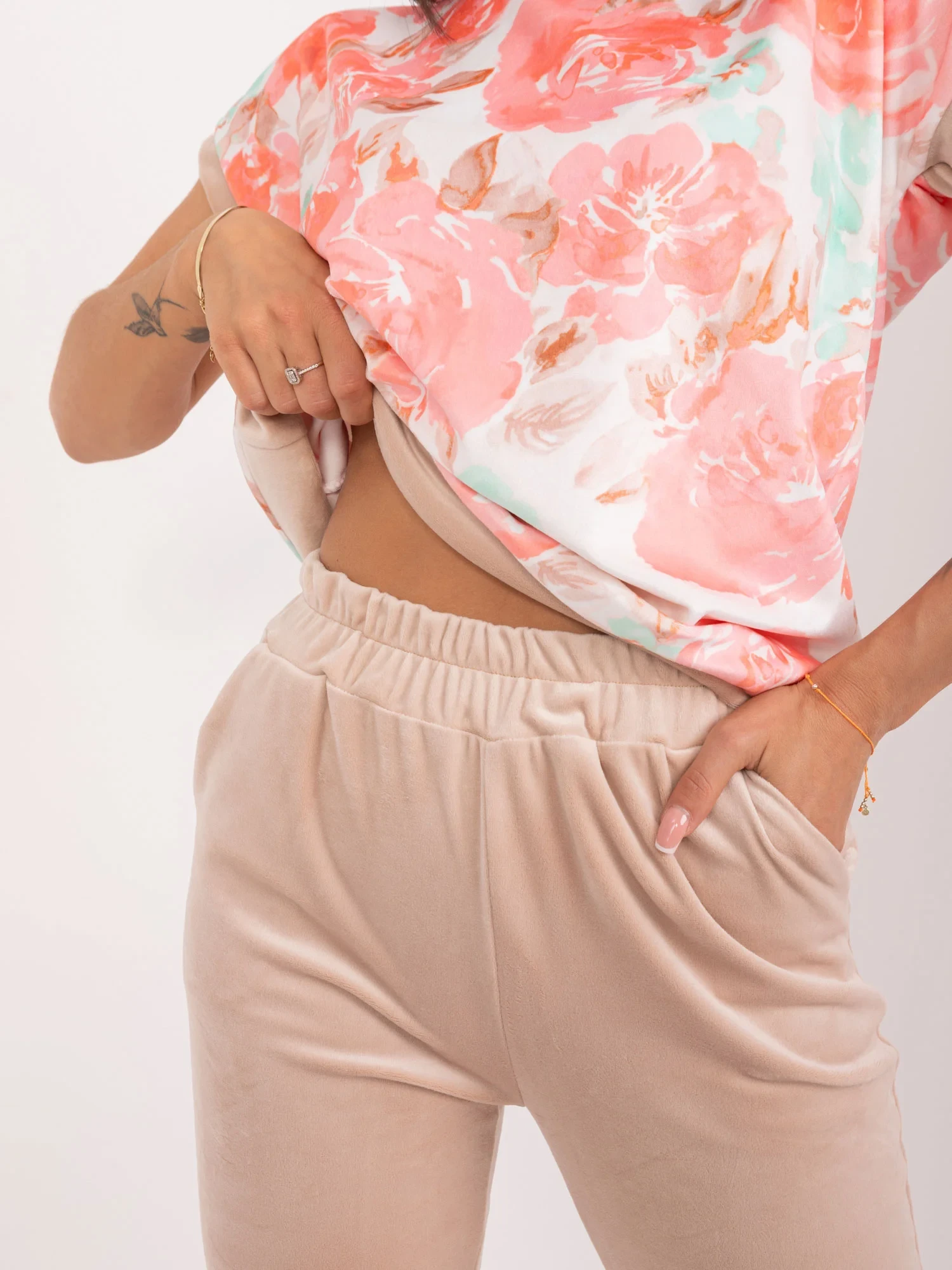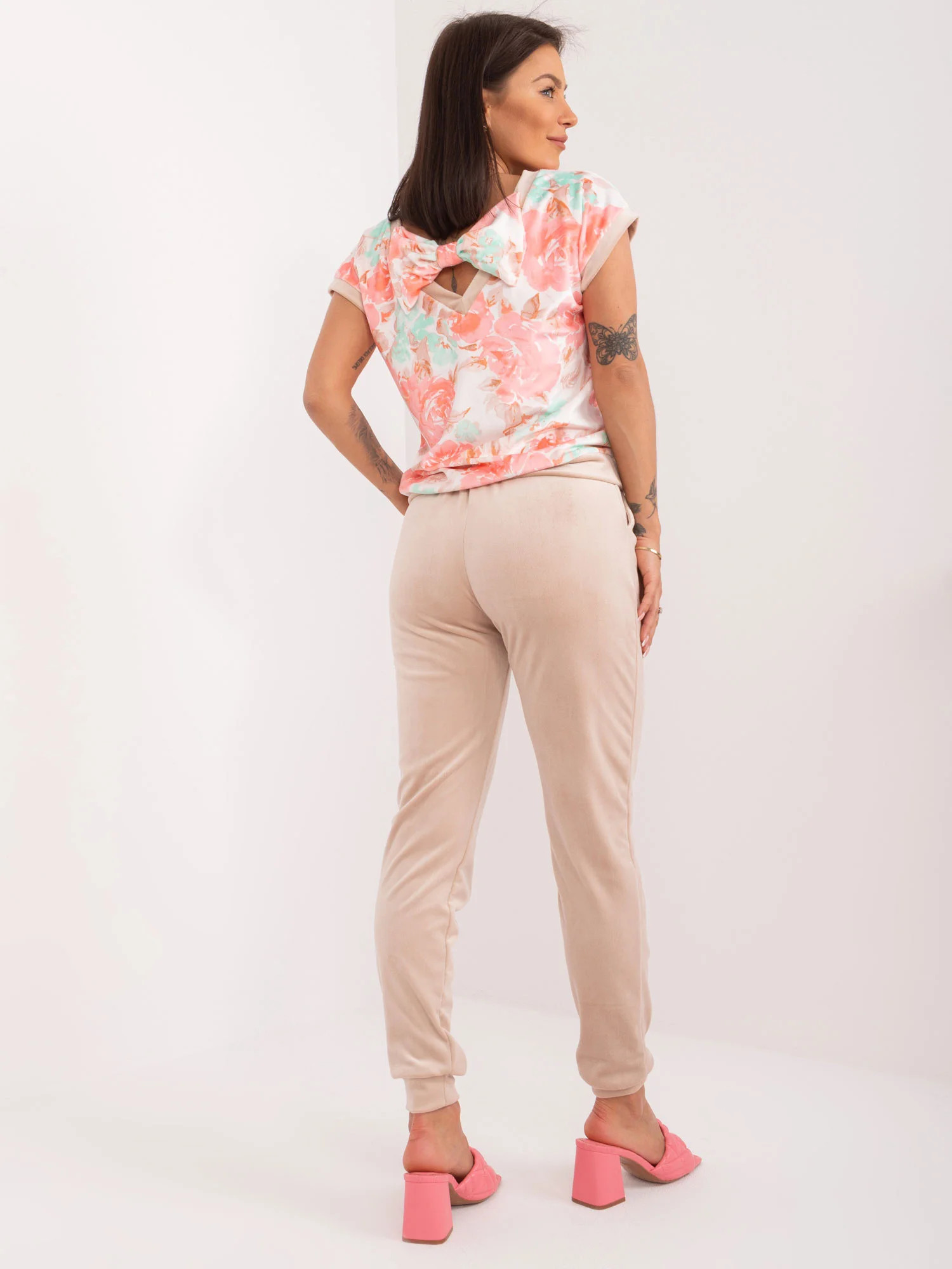 Wymiary kompletu w rozmiarze S mierzone na płasko: szerokość bluzki pod pachami - 49 cm, długość bluzki - 58 cm, szerokość spodni w pasie - 33 cm, wysokość spodni w pasie - 28 cm, długość spodni - 95 cm.
