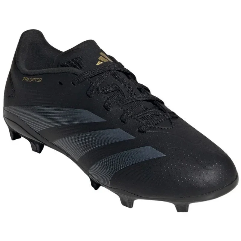 Dětské kopačky adidas Predator League FG IF6353 Poloamatérské kopačky adidas Predator jsou určeny pro chlapce, kteří dávají přednost hře na tvrdém přírodním trávníku. Predator ve své nejnovější iteraci pochází z kolekce Darkspark Pack. Syntetický svršek s technologií Hybridfeel byl pokryt vypouklou strukturou a je vybaven přilnavými překryvy Strikescale na vnitřní straně chodidla pro lepší kontrolu. Jemně asymetrické šněrování. podrážka s lakovanými hroty.