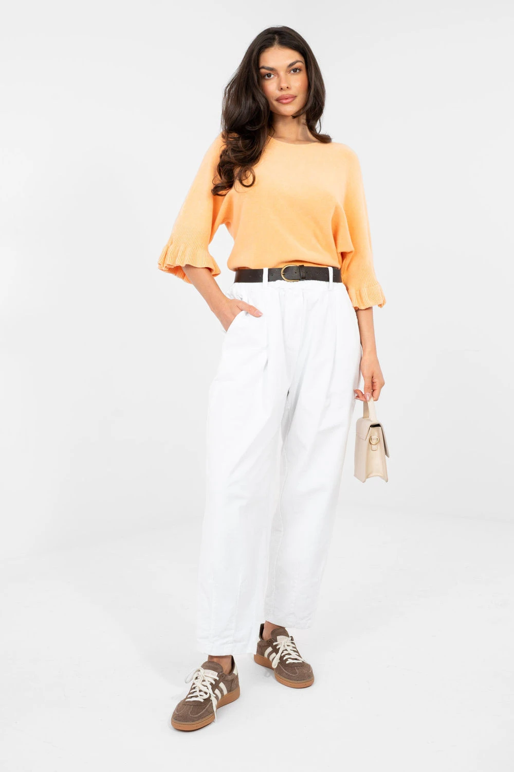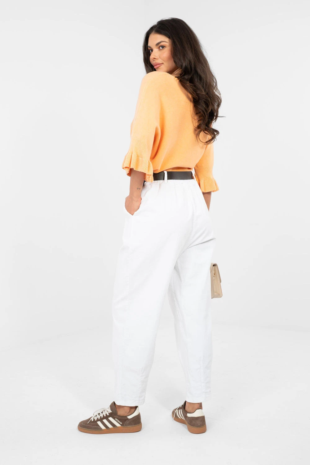 Stylové moleskinové kalhoty ve střihu mrkve jsou skvělým návrhem na každodenní nošení i do práce. Volný charakter v kombinaci s elegantními detaily dělá z modelu skvělý doplněk pro městské outfit. Hladký vzor zdůrazňuje nadčasový charakter kalhot a usnadňuje jejich kombinování s různými kousky šatníku. Model s vysokým pasem krásně podtrhuje pas a gumový pás na pasu zajišťuje pohodlné přizpůsobení se postavě. Další výhodou je zapínací pásek, který dodává celkovému vzhledu stylový závěr. Zužující se nohavice a ozdobné záložky vpředu dávají kalhotám moderní, lehce elegantní charakter a opticky zeštíhlují postavu. Kalhoty jsou vyrobeny z příjemné směsi bavlny s přídavkem elastanu, což zaručuje pohodlí při nošení a volnost pohybů. Postranní kapsy s kapsami zvyšují funkčnost modelu. Jedná se o pohodlný a stylový návrh pro mnoho každodenních příležitostí.