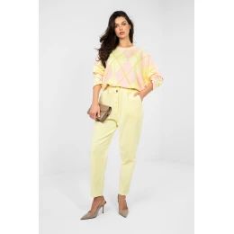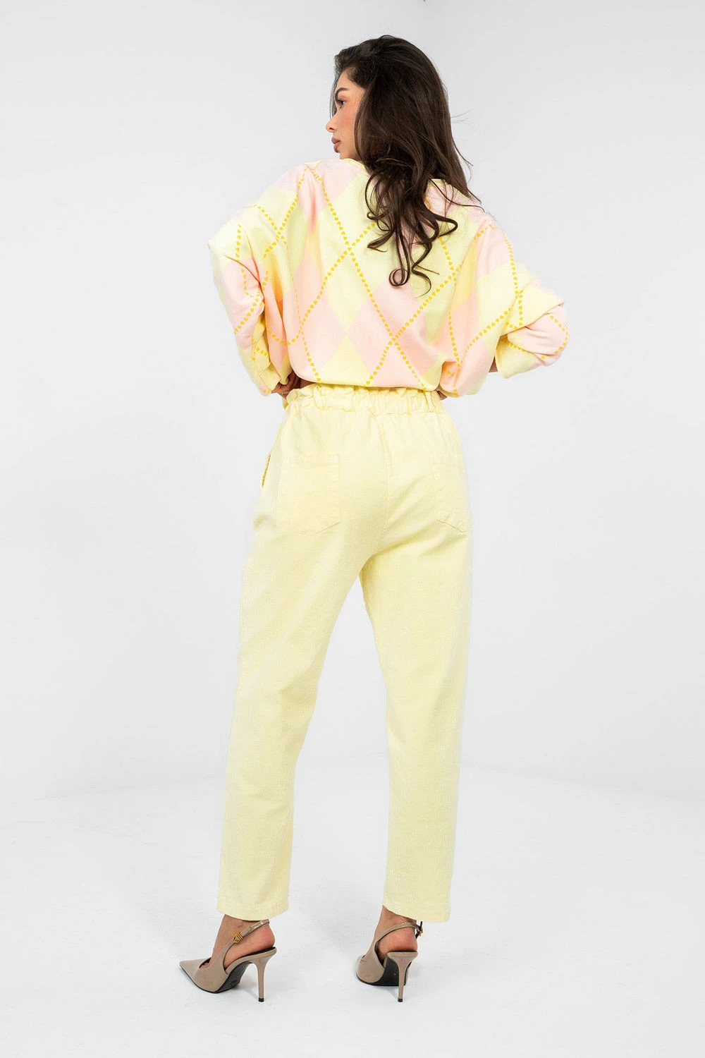 Volné kordové kalhoty typu paperbag jsou pohodlným a stylovým návrhem na každý den. Model s vysokým pasem krásně podtrhuje pas a gumový pas zajišťuje pohodlí nošení a ideální přizpůsobení postavě. Bez zapínání navíc zvyšuje pohodlí a dodává celku volný charakter. Přilehlé nohavice jemně zúženého střihu opticky zjemňují nohy a vložené boční kapsy dodávají praktičnost. Kalhoty jsou vyrobeny z kombinace bavlny a elastanu, díky čemuž jsou měkké, příjemné na dotek a pružné. Jsou skvělou volbou pro každodenní stylové kombinace, skvěle ladí jak s jednoduchým tričkem, tak s oversized mikinou nebo přizpůsobeným svetrem.