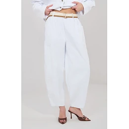 Stylové dámské kalhoty vyrobené ze žíně jsou skvělým návrhem pro každodenní, neformální styling. Střih typu mrkev je charakterizován volnějším tvarem v oblasti boků a se zužujícími nohavicemi, co zajišťuje pohodlné nošení a moderní vzhled. Model s vysokým pasem krásně zdůrazňuje pas a opticky prodlužuje siluetu. V pasu je vsazena elastická guma, která zaručuje pohodlné přizpůsobení bez nutnosti zapínání. Další výhodou je zapínací opasek, který zdůrazňuje pas a představuje stylový prvek dokončení. Kalhoty nemají klasické zapínání, co zvyšuje pohodlí používání. Mají otevřené, kapsy na bocích, praktické a dodávají celkovému vzhledu uvolněný charakter. Vyrobené z vysoce kvalitní směsi bavlny a elastanu, jsou měkké, příjemné na dotek a jemně elastické, díky čemuž se dobře přizpůsobují postavě. Hladký vzor z nich činí univerzální a snadno stylizovatelný model, ideální na každý den, do práce nebo na schůzku.