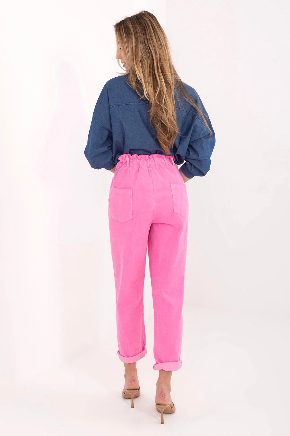 Volně střižené pásky z manšestrů typu paperbag jsou pohodlným a stylovým návrhem na každý den. Model s vysokým pasem krásně zdůrazňuje pas a v pase šitá guma zajistí pohodlí nošení a ideální přizpůsobení postavě. Bez zapínání navíc zvyšuje pohodlí a dodává celku uvolněný charakter. Nohavice se zúženým střihem jemně zúží nohy a boční kapsy s potahem dodávají praktičnost. Kalhoty jsou vyrobeny z kombinace bavlny a elastanu, díky čemuž jsou měkké, příjemné na dotek a pružné. Jedná se o skvělou volbu pro každodenní outfit, skvěle ladí jak s jednoduchým tričkem, tak s volným svetrem nebo přiléhavým svetrem.