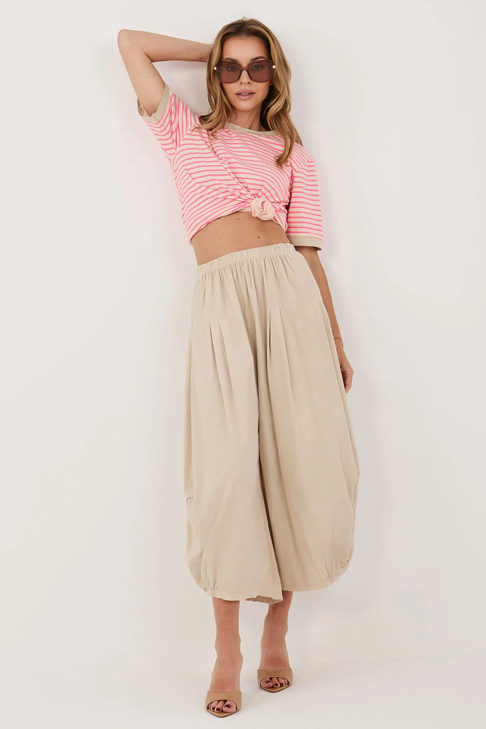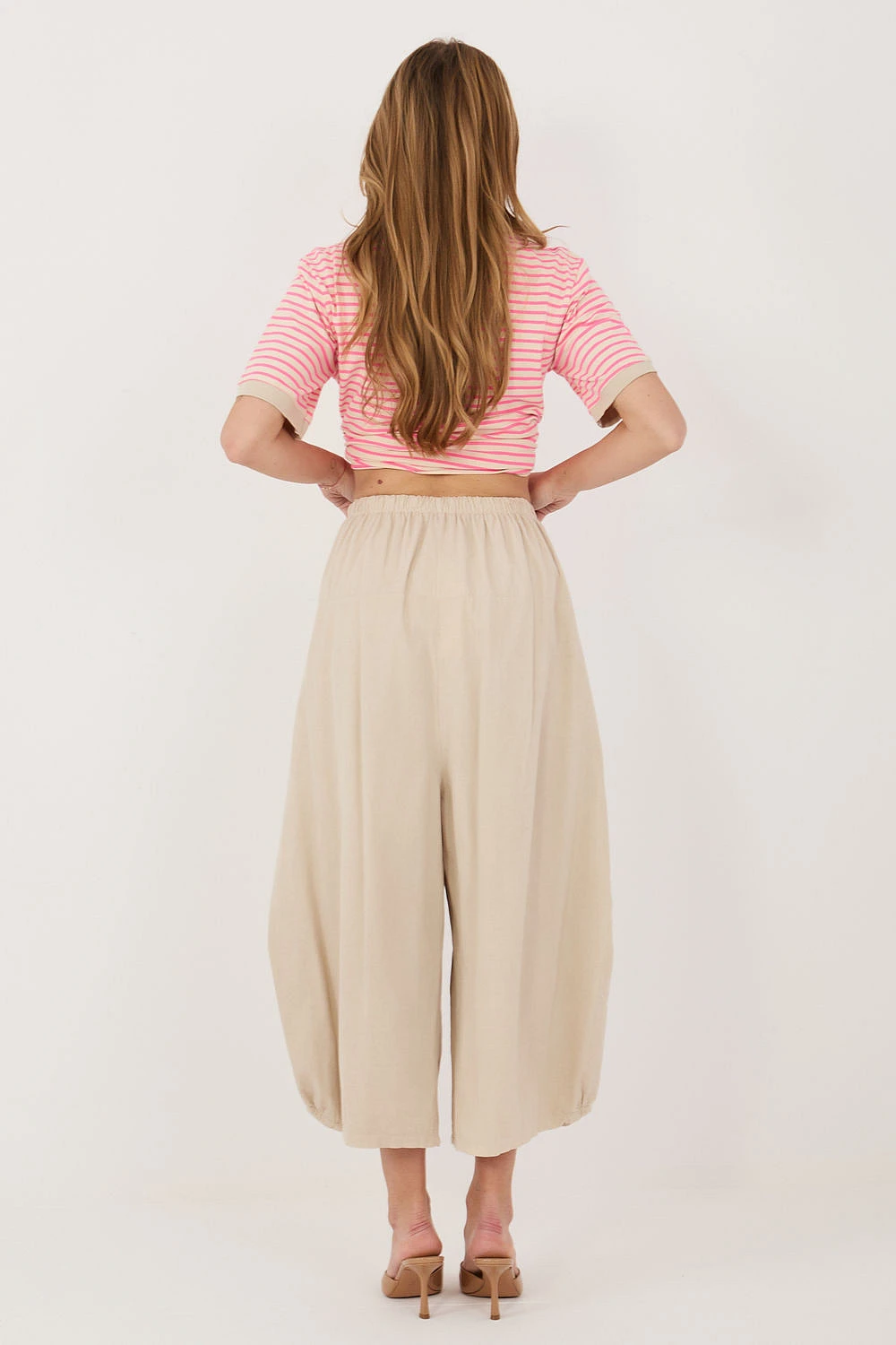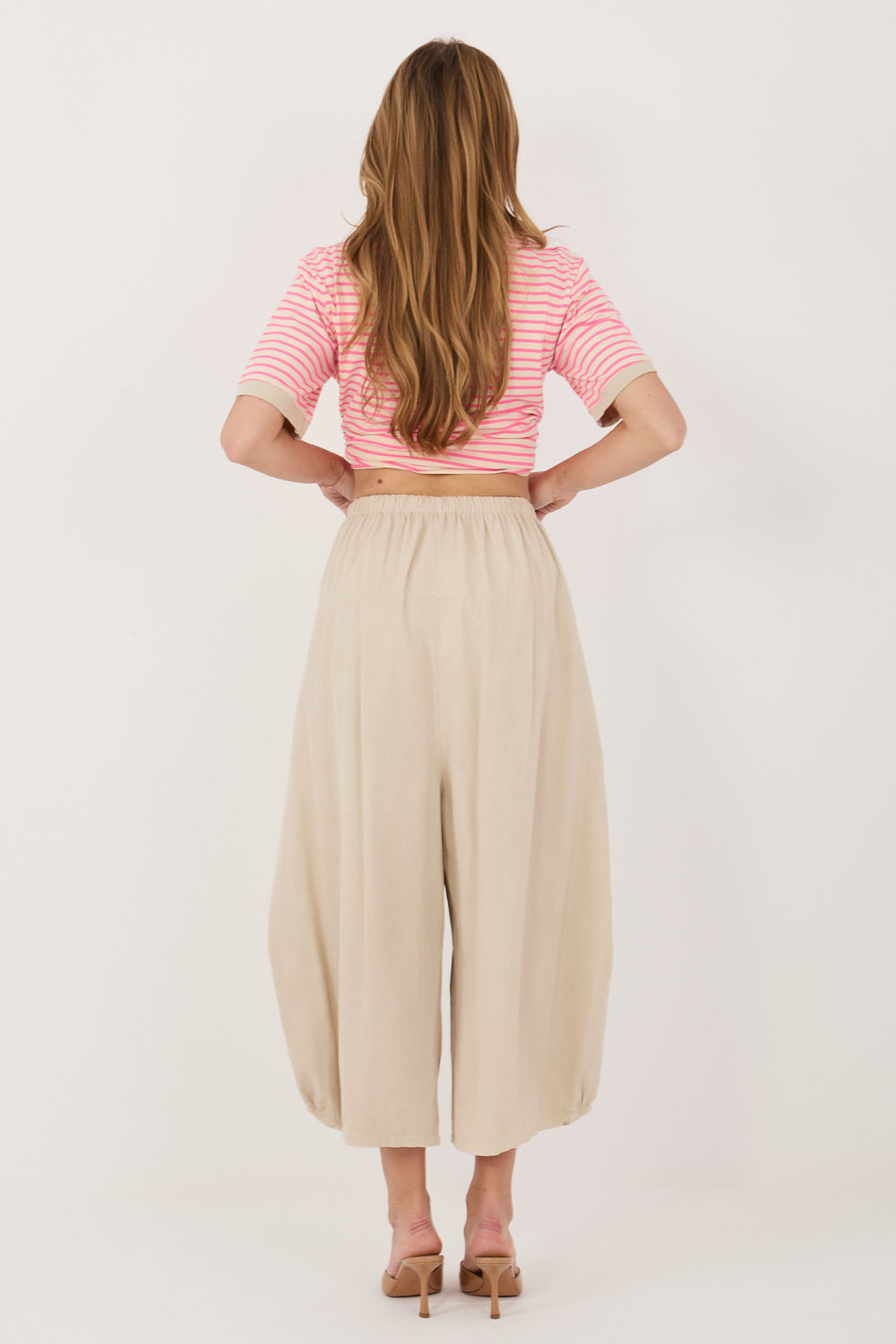 Dámské sametové kalhoty volného střihu typu aládinky, ideální na každý den. Vyrobené z měkké a příjemné bavlny, poskytují pohodlí a prodyšnost. Model s vysokým pasem a vsazenou gumou v pase, která se přizpůsobí postavě a zaručí pohodlí po celý den. Široké nohavice o délce 7/8 dodávají celku lehkost a moderní charakter. Kalhoty v hladkém vzoru, bez zapínání a kapes, co zdůrazňuje jejich minimalistický styl a uvolněný, nenásilný vzhled.