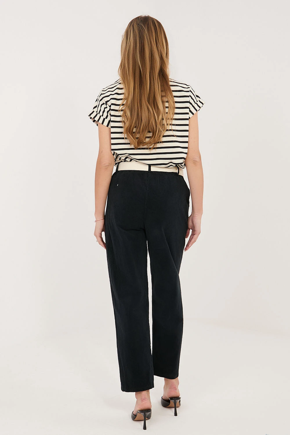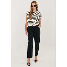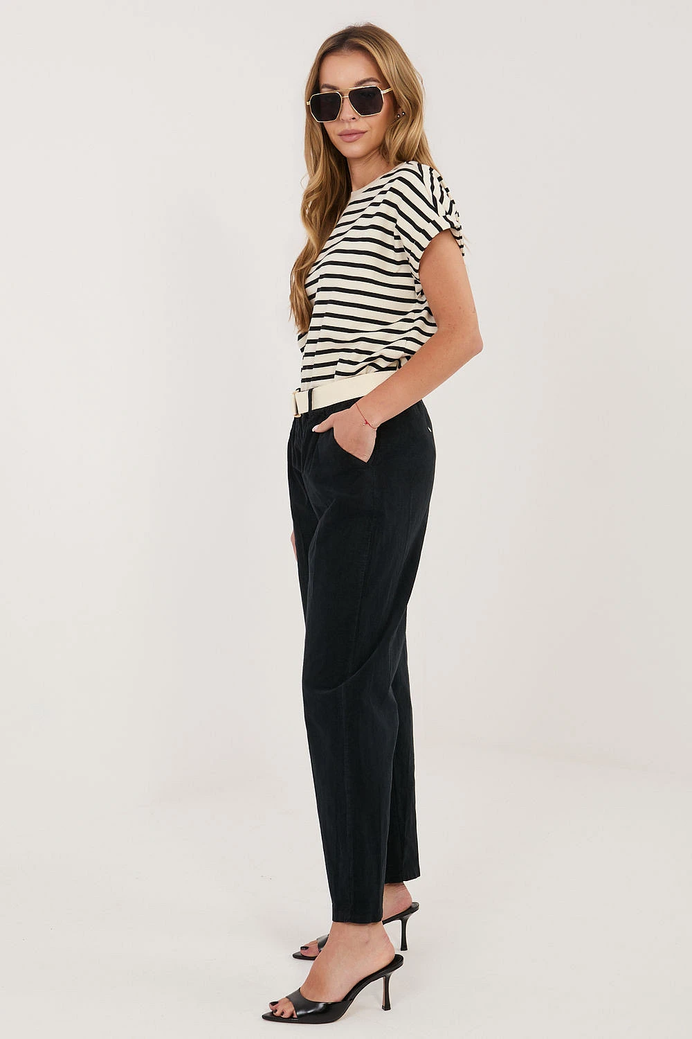 Dámské štručkové kalhoty s moderním střihem typu carrot, ideální na každodenní nošení. Vyrobené z vysoké kvality směsi bavlny s přídavkem elastanu, zajišťují pohodlí, pružnost a dobře padnou k postavě. Model s vysokým pasem a gumou v pase zaručuje pohodlí při nošení, zatímco další zapínatelný pásek zdůrazňuje pas a dodává stylu. Stříhané nohavice délky 7/8 dodávají celku moderní charakter a opticky prodlužují nohy. Kalhoty v hladkém vzoru, vybavené praktickými bočními kapsami, spojují funkčnost s minimalistickou estetikou.