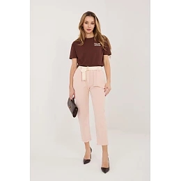 Dámské sametové kalhoty elegantního střihu typu cigarety, které se skvěle hodí do každodenních stylizací. Vyrobena z vysoce kvalitní směsi bavlny a elastanu, zajistí pohodlí nošení, elasticitu a ideální přizpůsobení postavě. Model s gumou v pasu zaručuje pohodlí a volnost pohybu, zatímco další zapínací pásek zdůrazňuje pas a dodává celku stylový charakter. Zúžené nohavice délky 7/8 opticky zúžují postavu a dodávají moderní vzhled. Kalhoty v hladkém vzoru, bez klasického zapínání, vybavené praktickými bočními kapsami, spojují funkčnost s nadčasovou elegancí.