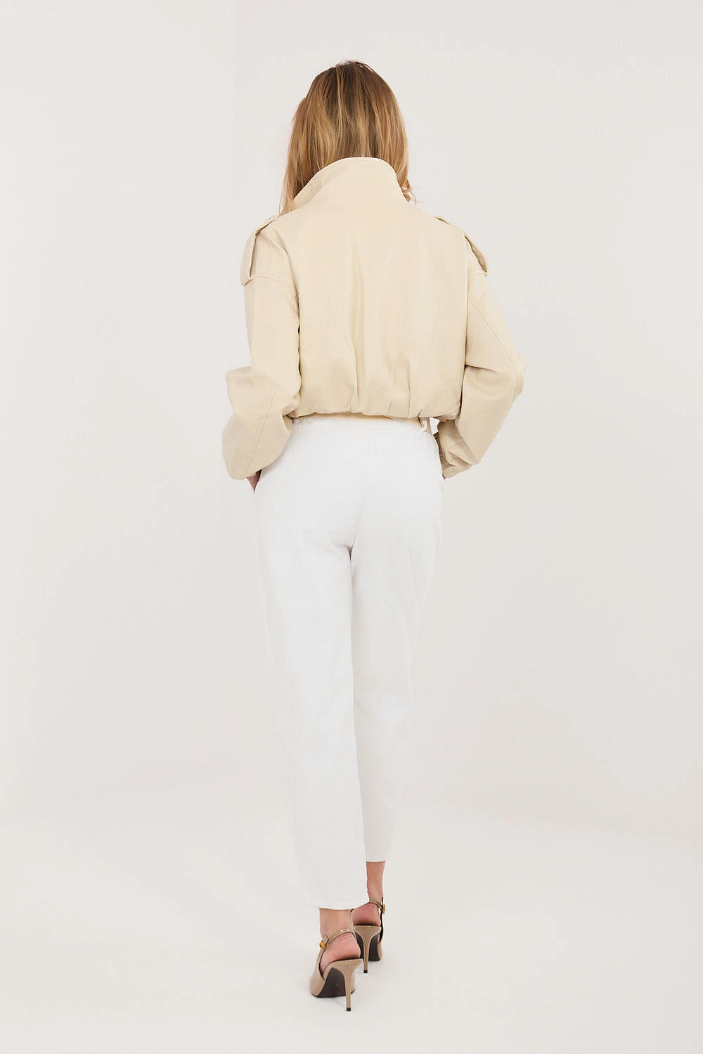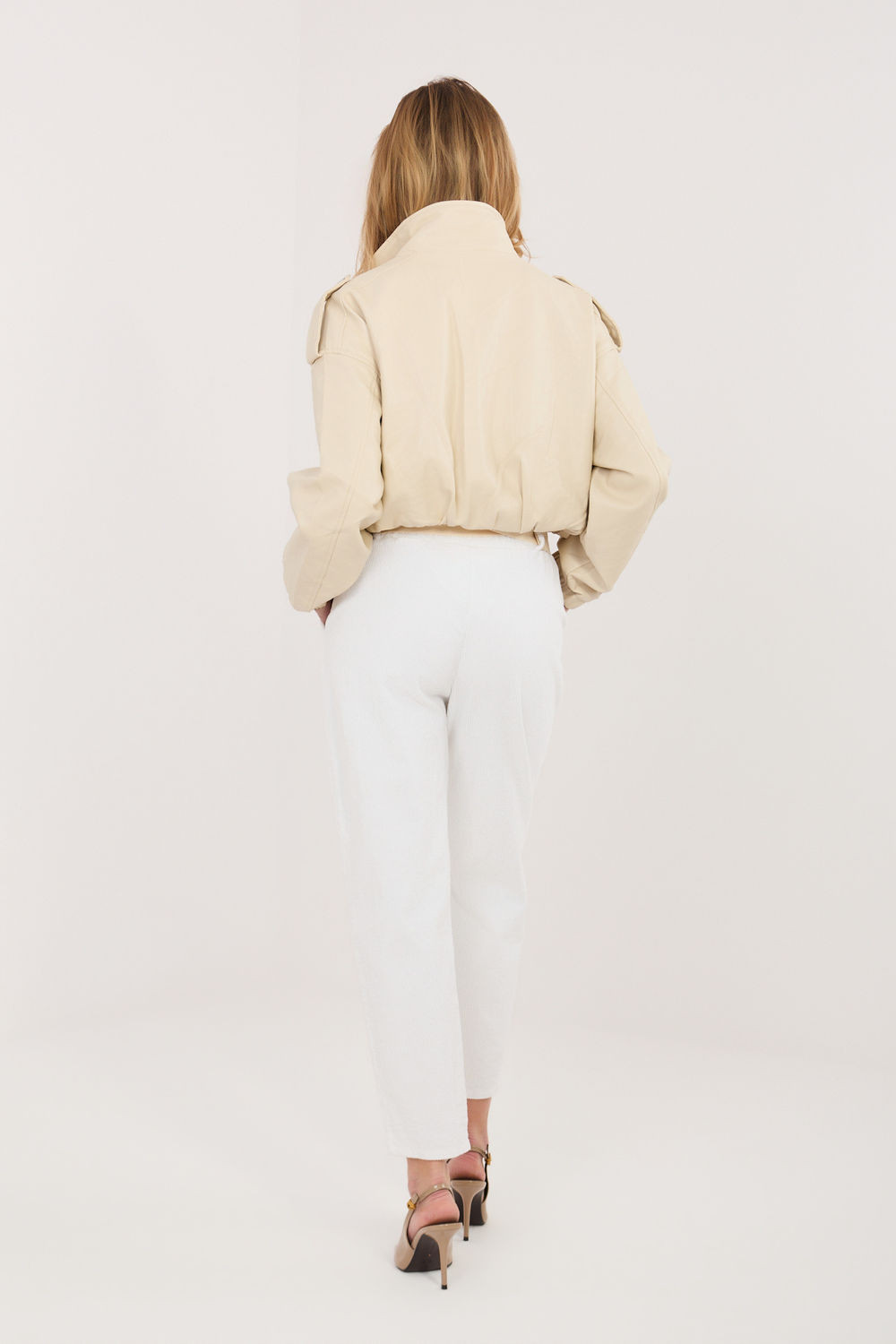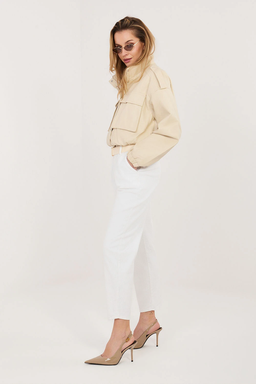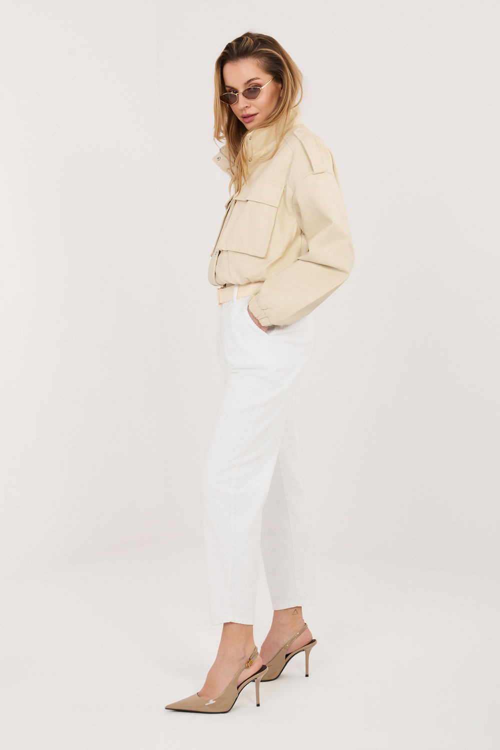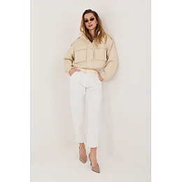 Dámské kalhoty z manšestrů elegantního střihu typu cigarety, které se skvěle hodí do každodenních stylizací. Vyrobené z vysoce kvalitní směsi bavlny a elastanu, poskytují pohodlí při nošení, pružnost a dokonalé přizpůsobení postavě. Model s gumou v pasu zaručuje pohodlí a volnost pohybu, zatímco další zapínací pásek zdůrazňuje pas a dodává celku stylový charakter. Zaúzké nohavice délky 7/8 opticky zeštíhlují postavu a dodávají moderní vzhled. Kalhoty v hladkém vzoru, bez klasického zapínání, vybavené praktickými bokovými kapsami, spojují funkčnost s nadčasovou elegancí.