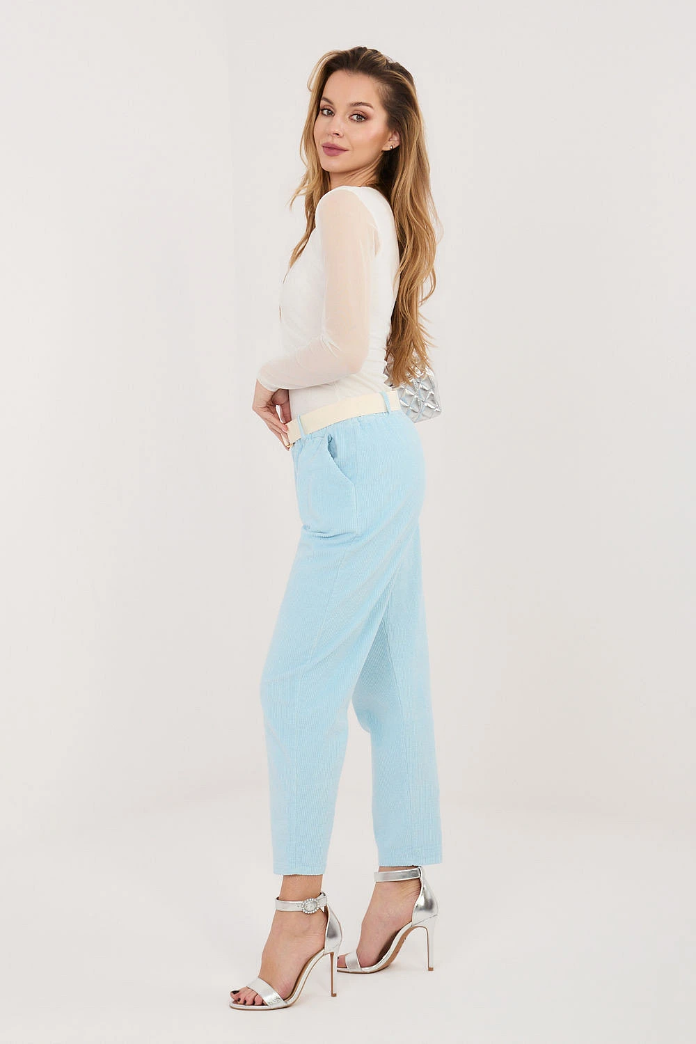 Dámské štručkové kalhoty elegantního střihu typu cigaretky, které se skvěle hodí do každodenních stylizací. Vyrobené z vysoce kvalitní směsi bavlny a elastanu poskytují pohodlí nošení, elasticitu a ideální přizpůsobení postavě. Model s gumou v pase zaručuje pohodlí a volnost pohybu, zatímco dodatečný zapínací pásek zdůrazňuje pas a dodává celku stylový charakter. Zúžené nohavice délky 7/8 opticky zjemňují postavu a dodávají moderní vzhled. Kalhoty v hladkém vzoru, bez klasického zapínání, jsou vybaveny praktickými bočními kapsami, které spojují funkčnost s nadčasovou elegancí.