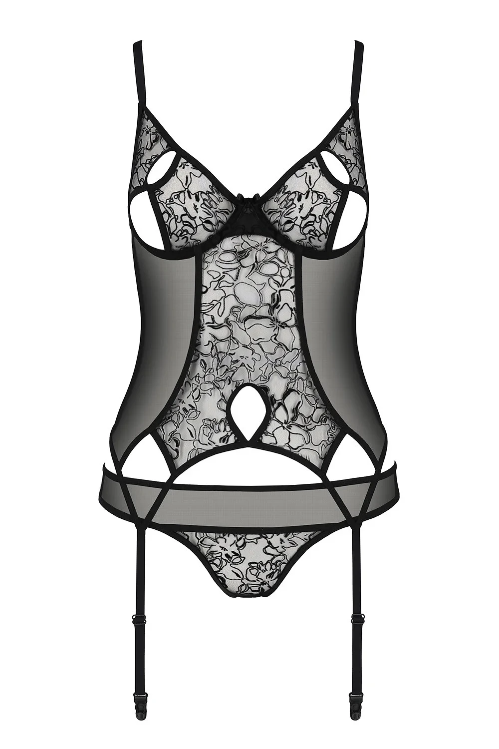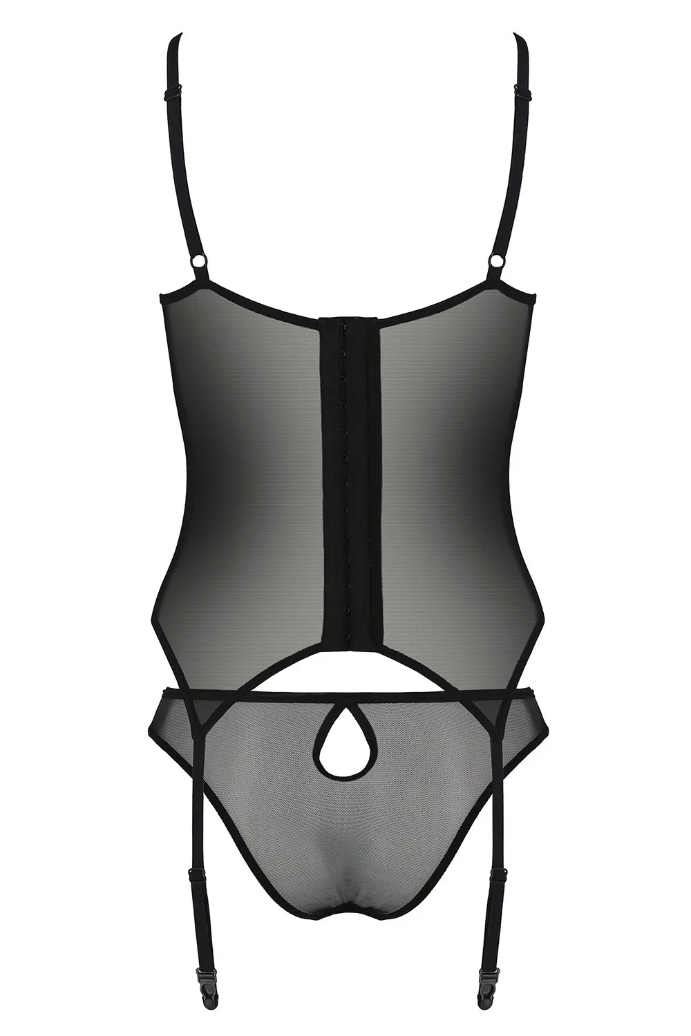 Korzet značky Passion, model Primula corset. Výrobek je vyroben ze 47 % polyamidu, 43 % regenerovaného polyamidu, 7 % regenerovaného elastanu, 3 % lycry. Místo zapínání: na zádech. dámský výrobek. výrobek má nastavitelná ramínka. má drátky, které podpírají prsa a vhodně je tvarují. typ výstřihu: špičatý. ramínka jsou nastavitelná. korzet se zapíná na háčky. klasické kalhotky. dvanáct řad svislých háčků. dvě řady vodorovných háčků.