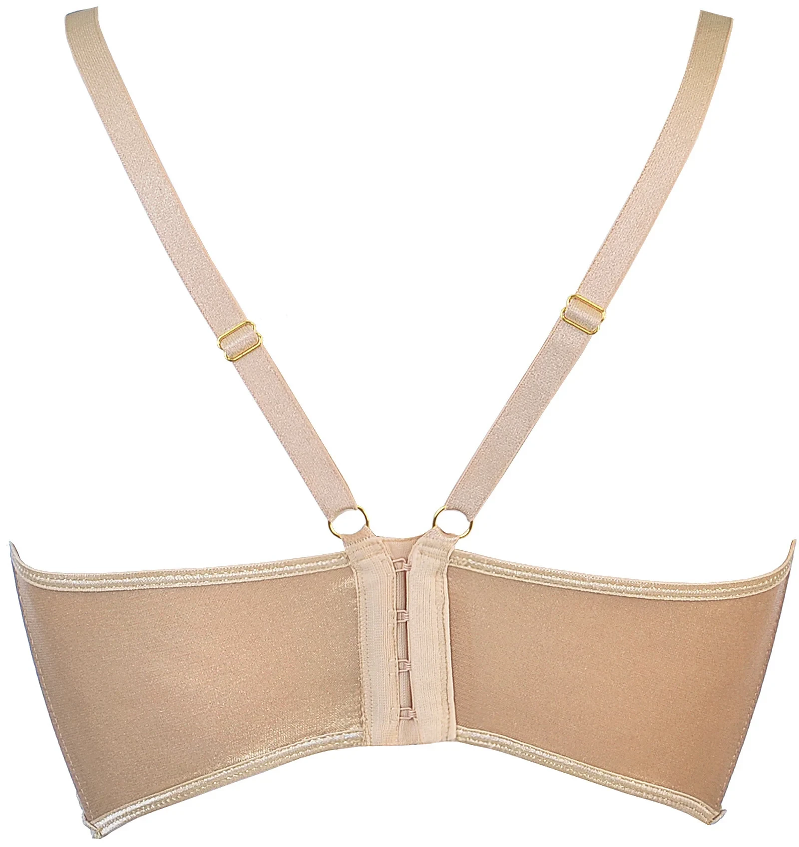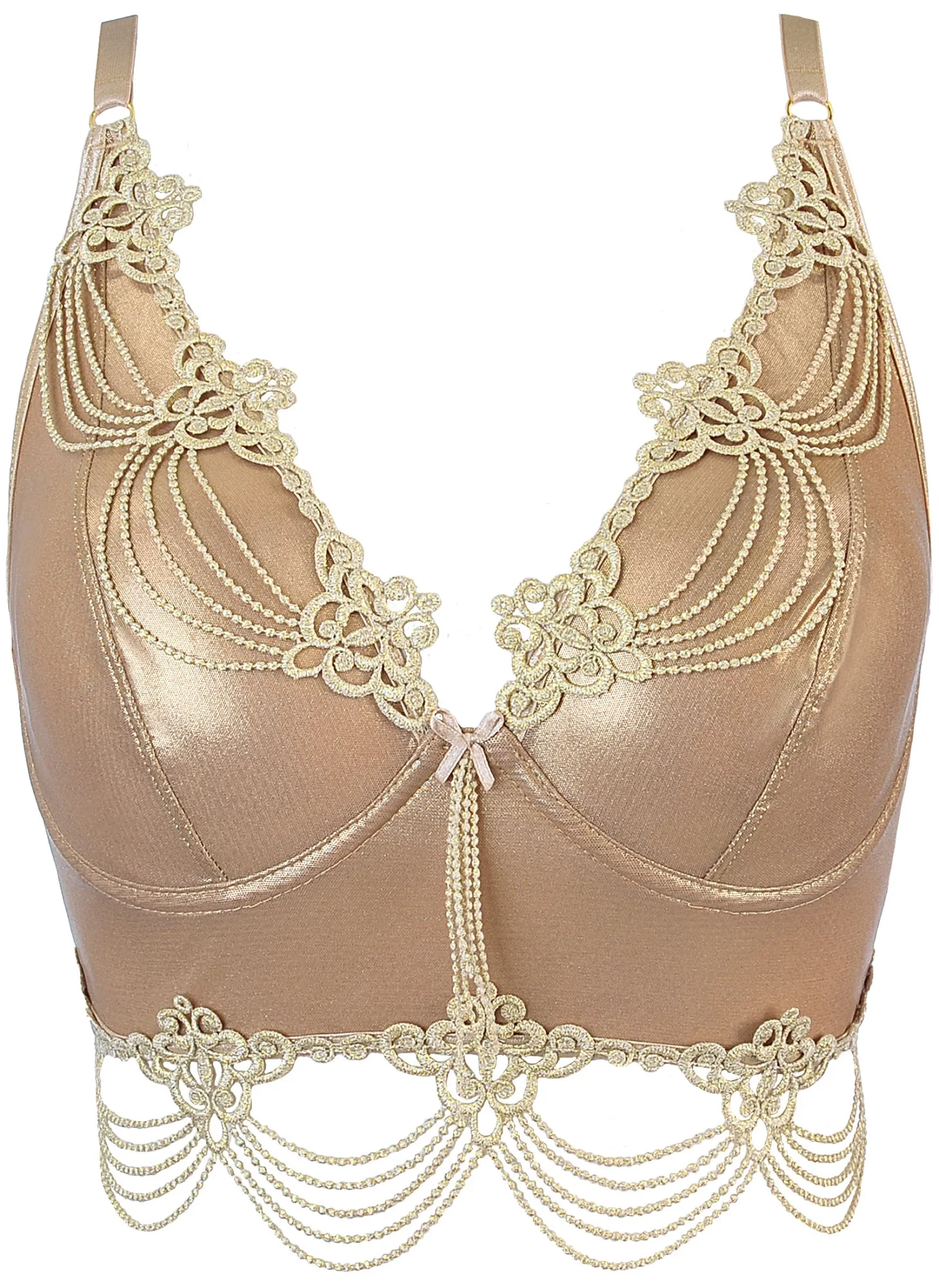 Úžasný polokorzet ve stylu mořské panny vyrobený z třpytivého zlatého materiálu, který krásně odráží světlo, takže zazáříte jako milion dolarů! Tento model je vyrobený z voskovaného tylu a má měkké košíčky se zabudovaným drátkem, který pozvedne a zvýrazní ňadra tak, že z nich nikdo nebude moci spustit oči. Model je ozvláštněn vyšívanými prvky na okrajích košíčků a kolem pasu. Jedná se o speciální ozdoby, které celému stylingu dodávají charakter. Polokorzet je vyztužený bočními kosticemi, zapíná se pětiřadovým zapínáním na háčky a očka pro regulaci, ramínka jsou také nastavitelná a všechny doplňky jsou ve zlaté barvě.