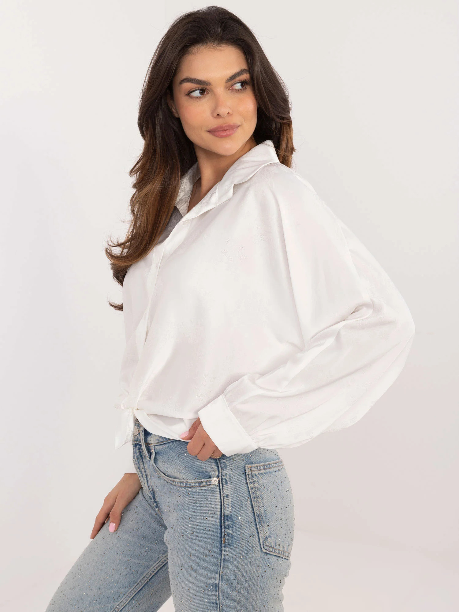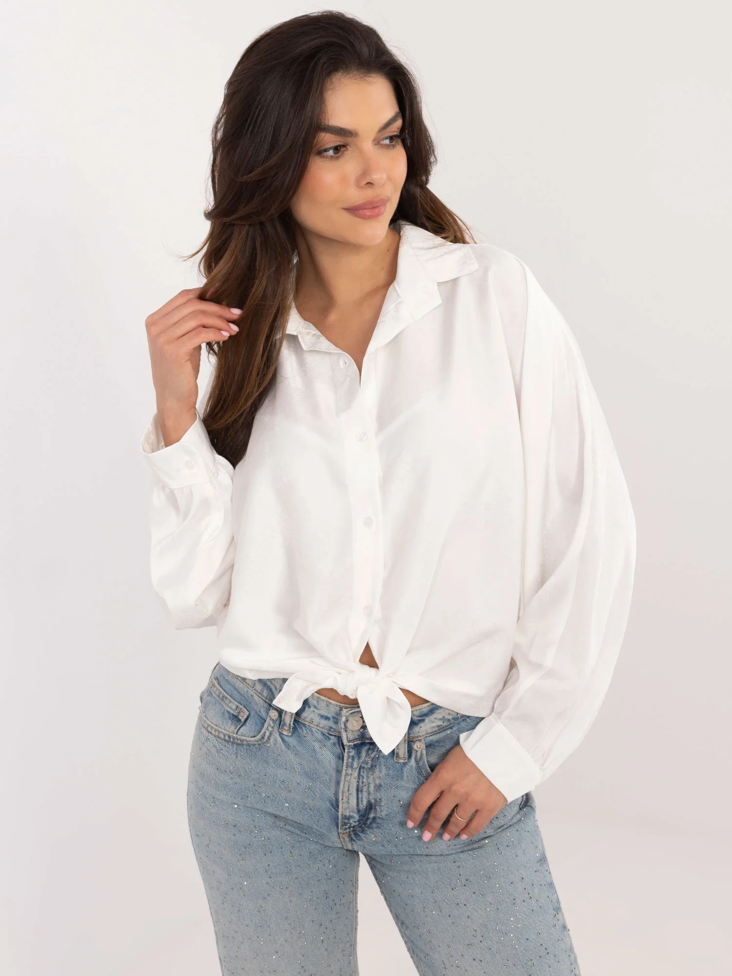 Wymiary koszuli w rozmiarze one size mierzone na płasko: szerokość pod pachami - 68 cm, długość całkowita - 67 cm, długość rękawa - 61 cm