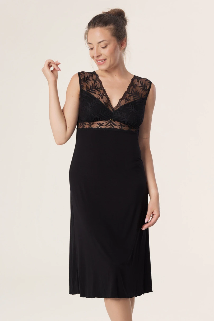 Zmysłowa koszulka nocna damska wykonana z wysokiej jakości, miękkiej wiskozy to propozycja dla kobiet ceniących elegancję i wygodę. Model o długości do łydki pięknie układa się na sylwetce, podkreślając kobiece kształty. Głęboki dekolt, plecy i linia pod biustem zostały ozdobione delikatną, ażurową koronką o roślinnym motywie, która dodaje całości wyjątkowego uroku. Miseczki są podszyte materiałem, zapewniając komfort noszenia i subtelne podtrzymanie biustu. Z boku znajduje się zmysłowe rozcięcie, które optycznie wydłuża nogi i dodaje lekkości. Koszulka zapakowana w eleganckie pudełko – idealna na prezent.