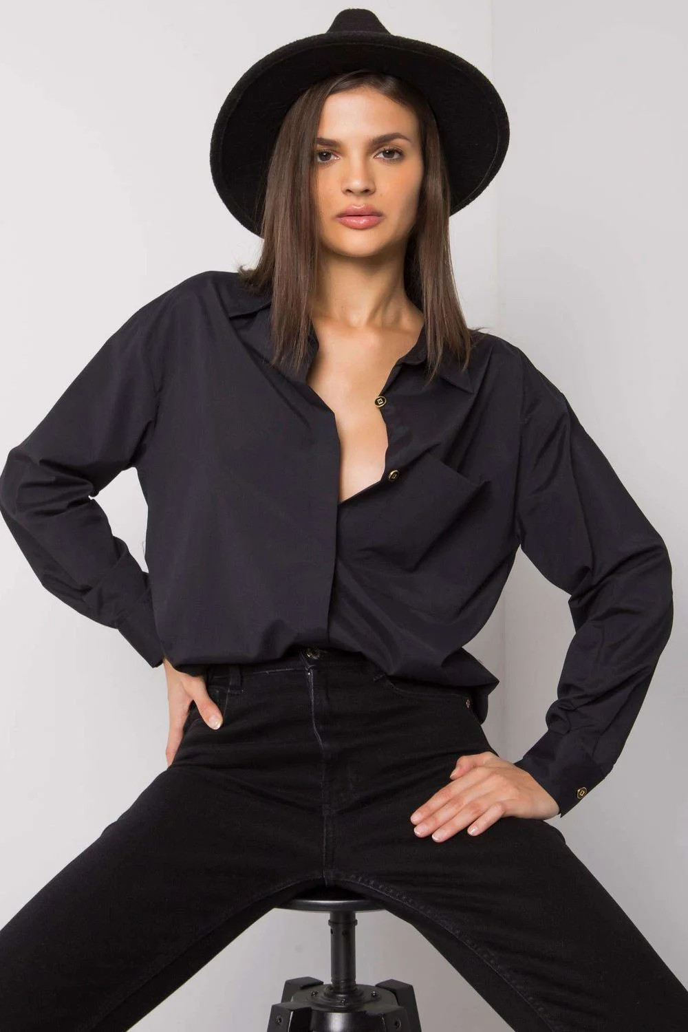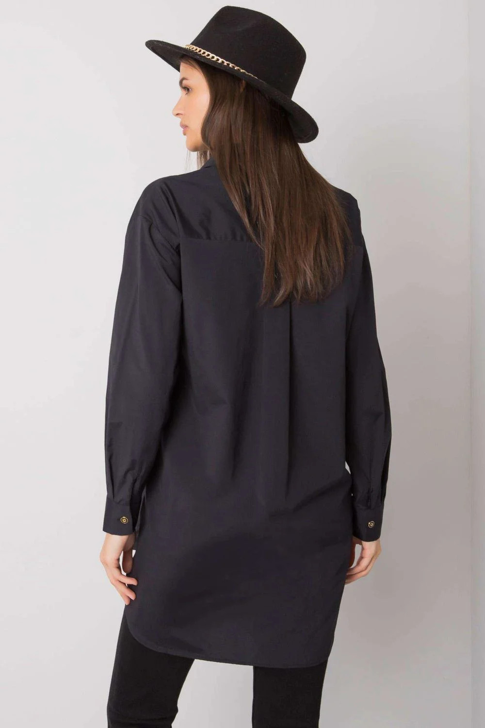 Černá dámská prodloužená košile s dlouhými rukávy. Košile je zapnutá.