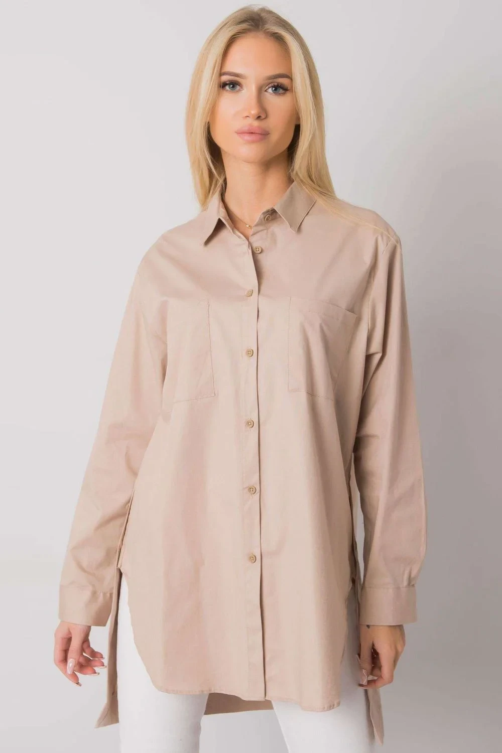 Béžové bavlněné tričko s prodlouženým střihem a dlouhými rukávy. Košile je zapnutá.