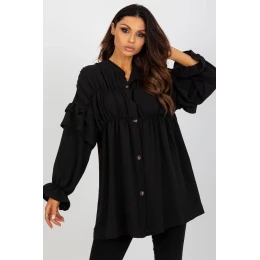 Dámská košile volného střihu se zapínáním na knoflíky. Košile s dlouhými rukávy a ozdobnými volánky.
