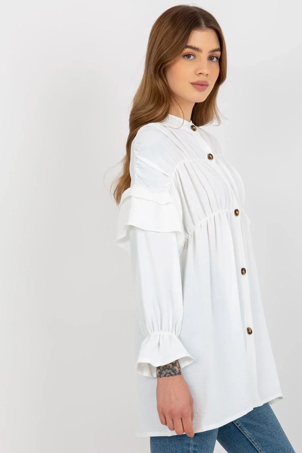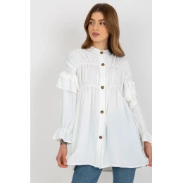 Dámská košile volného střihu se zapínáním na knoflíky. Košile s dlouhými rukávy a ozdobnými volánky.