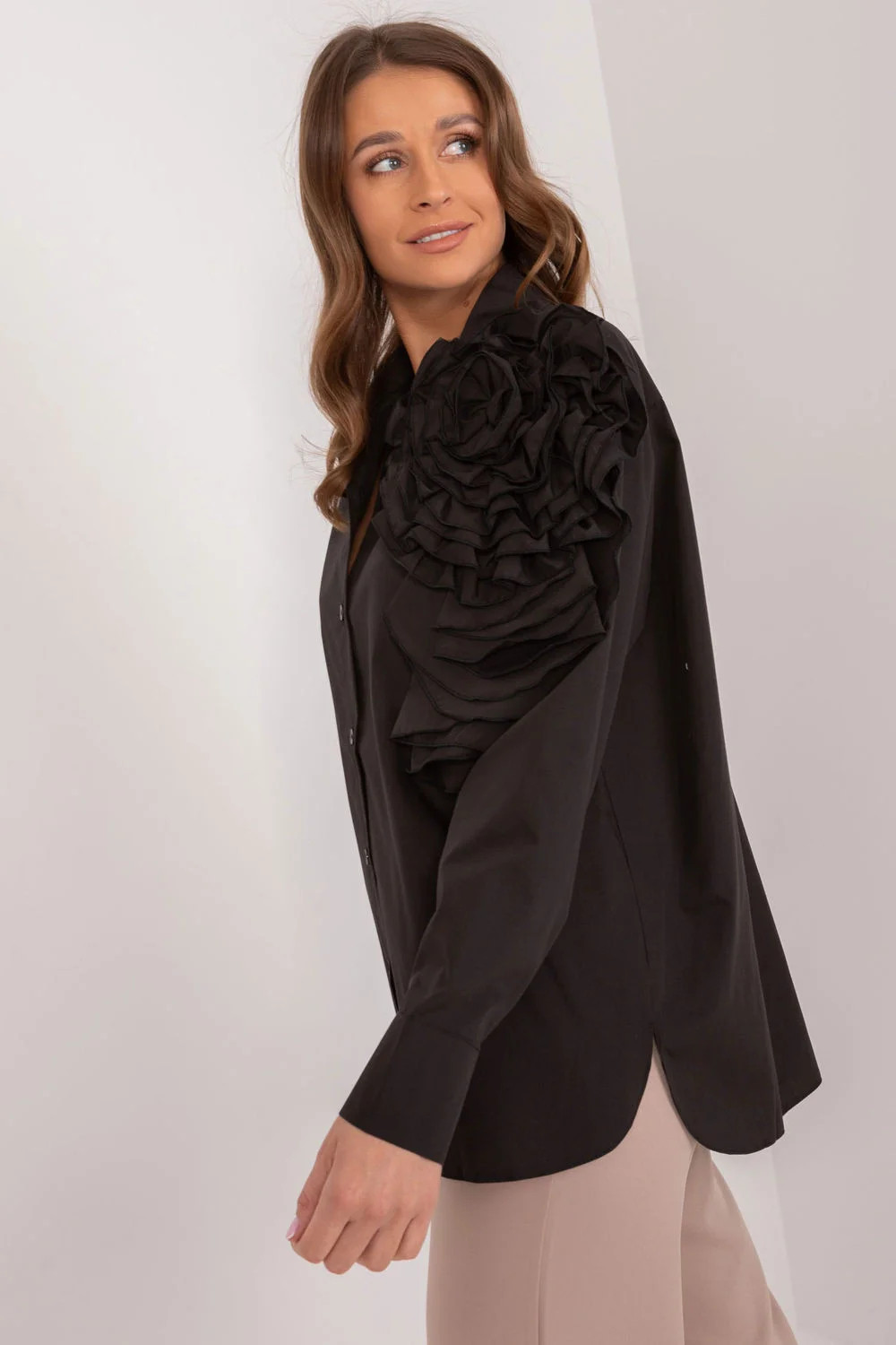 Dámská košile, která elegantním způsobem zvýrazňuje dámský styl. Je vyrobena z hladké tkaniny, která poskytuje pohodlí a volnost pohybu. Díky klasickému střihu na knoflíky je ideální pro mnoho příležitostí, zejména těch formálnějších. Na přední straně, na úrovni levého ramene, se nachází velký ozdobný látkový květ, který košili dodává jedinečný půvab a jemnost. Dlouhý rukáv podtrhuje eleganci a noblesu košile a dokonale se hodí k nejrůznějším stylům. Hlavním materiálem použitým na košili je kvalitní bavlna, která zajišťuje přirozené dýchání pokožky a celodenní pohodlí při nošení. Tato košile je ideální volbou pro ženy, které ocení eleganci a osobitý styl v každé situaci.