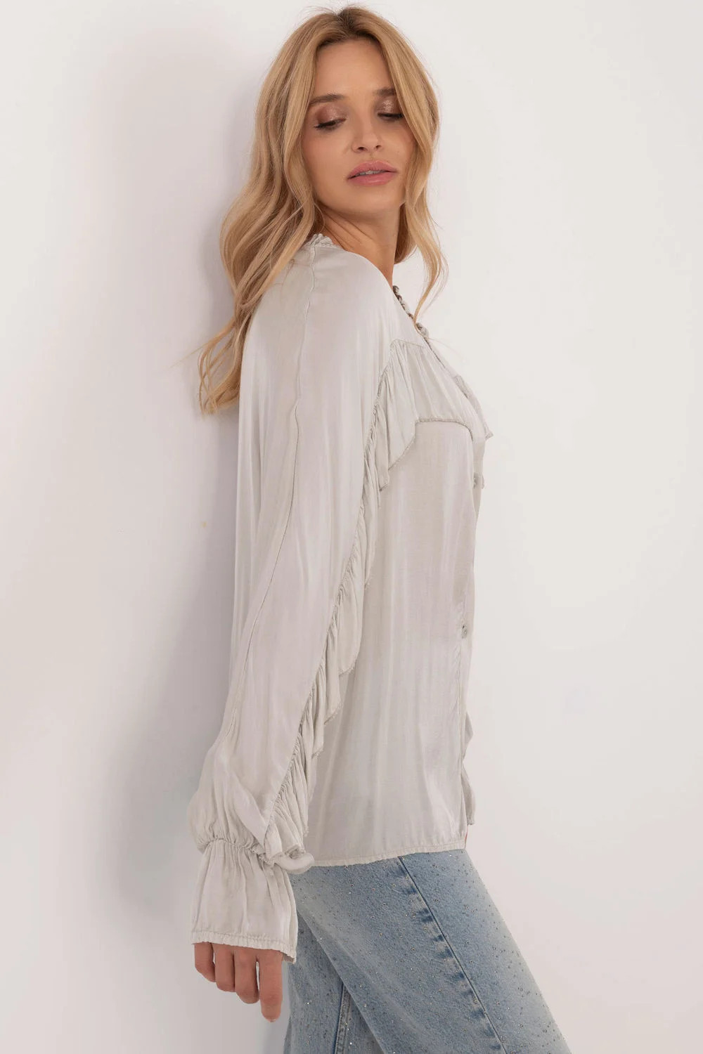 Ideální nabídka pro ženy, které si cení originálního stylu a pohodlí. Skvěle se hodí jak do každodenních outfitů, tak i do formálnějších situací, například do práce. Měkká a jemná viskóza zajišťuje příjemný pocit při nošení. Hladký materiál dodává eleganci. Klasický střih košile, který byl modernizován díky originálním detailům. Dlouhé rukávy s efektním volánem přidávají romantický charakter. Smyslný výstřih s vázáním umožňuje individuální úpravu. Praktické knoflíky usnadňují oblékání a svlékání blůzky. Volán vpředu a na rukávech dodává lehkost a pohyb.