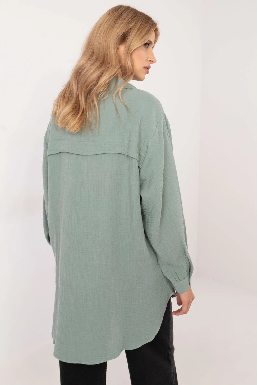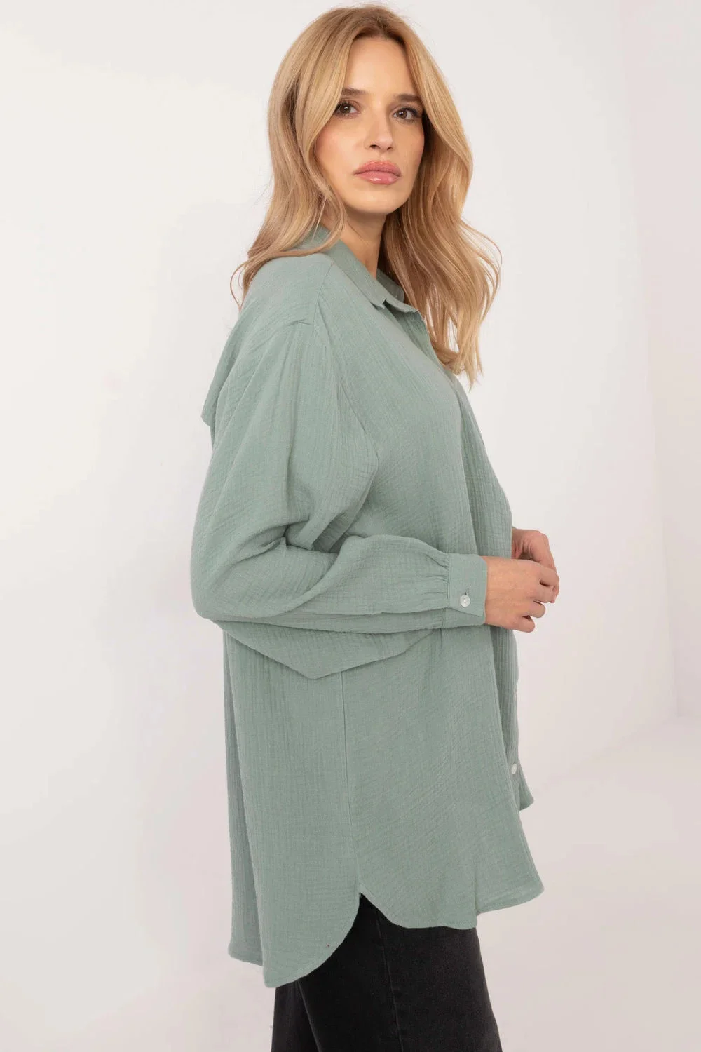 Dámská košile s neobvyklou, bohatou texturou materiálu, vyrobená z ekologické bavlny, ideální na každý den. Delší střih a nadýchané rukávy jí dodávají módní, lehce romantický charakter. Košile má klasický límeček a zapínání na knoflíky, co zdůrazňuje její univerzální styl, a dlouhý rukáv s jemným nadýchaným akcentem jí dodává subtilní eleganci. Je to pohodlná a zároveň stylová volba, která se hodí do mnoha každodenních outfitů, dbajících jak na módní vzhled, tak na pohodlí nošení.