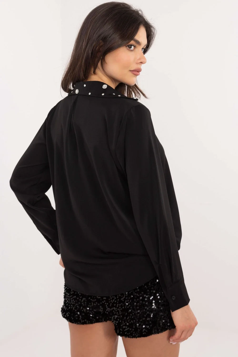 Dámská košile s klasickým střihem, ideální na elegantní příležitosti i do každodenních kancelářských outfitů. Vyrobena z kombinace polyesteru a viskózy, díky čemuž je pohodlná a odolná. Hladký materiál jí dodává univerzálnost a umožňuje snadné sladění s různými outfitovými kombinacemi a doplňky. Standardní délka a dlouhý rukáv zajišťují pohodlí a profesionální vzhled. Košile má jemný límeček zdobený decentními zirkony, co jí dodává výjimečný elegantní charakter. Zapíná se na klasické knoflíčky a je skvělou volbou jak na formální události, tak do každodenní práce, přidávající styl a eleganci každému outfitu.